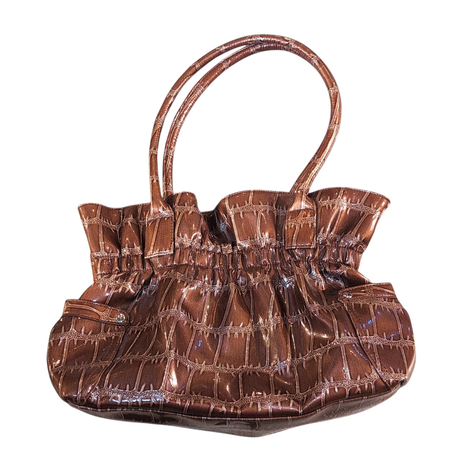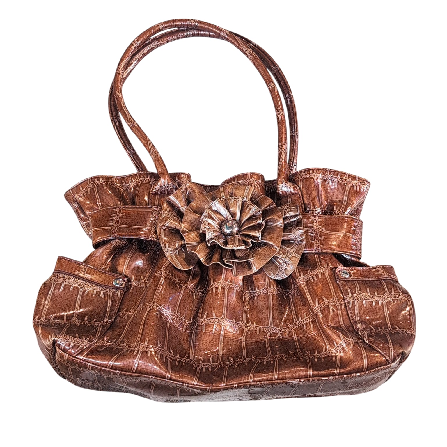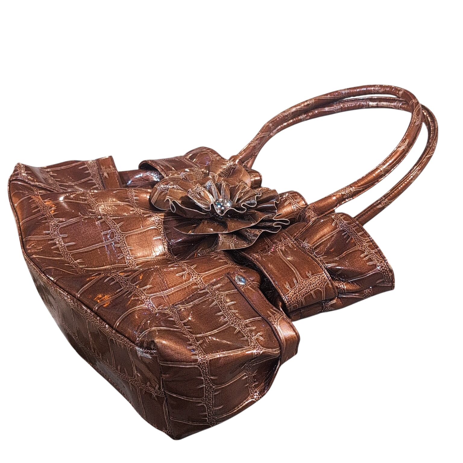 光沢のあるクロコ風、フリルのギャップ、プラスお花のモチーフというデザイン性の高さと細部の絶妙な組み合わせが魅力的。