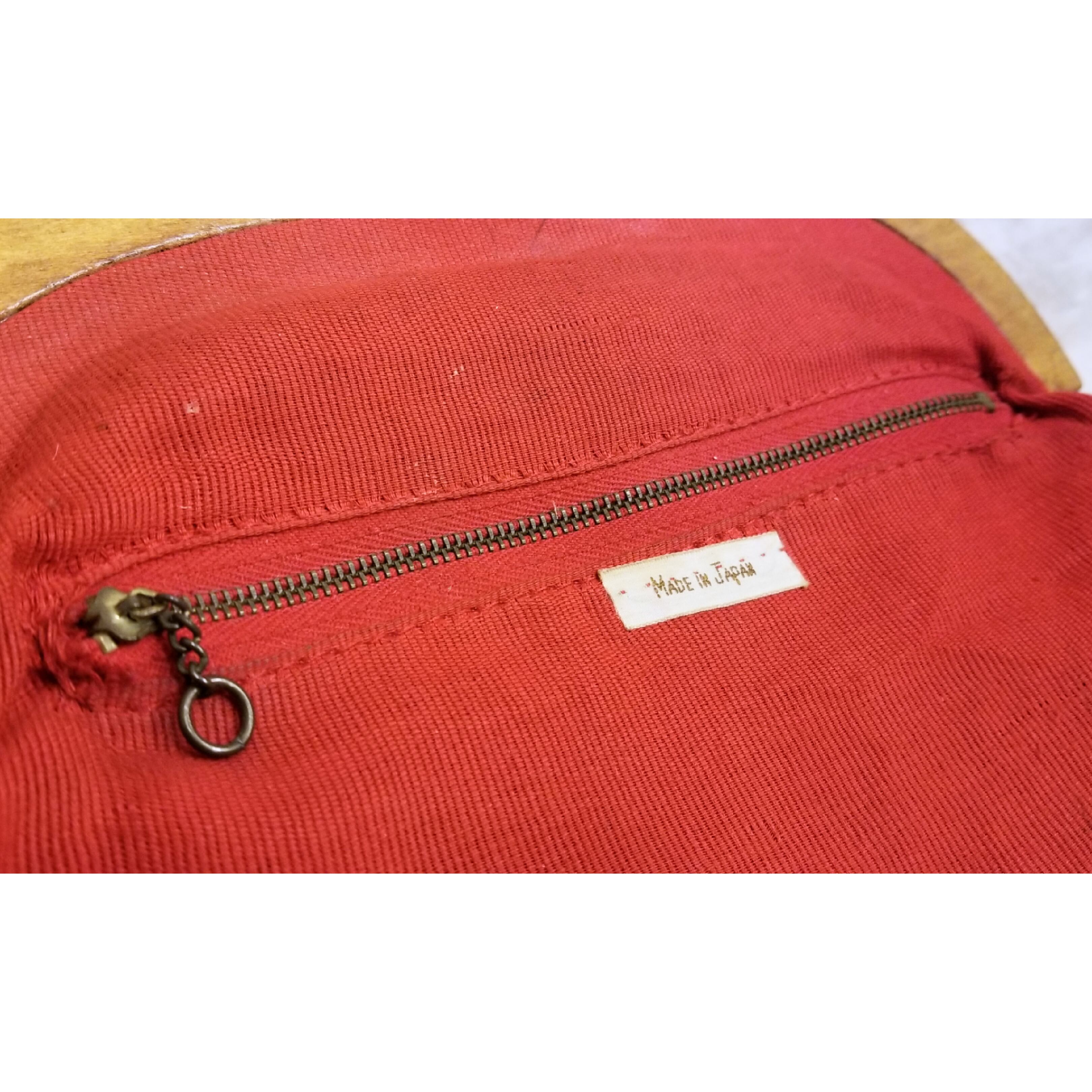 色味は、レッド。ペーパー素材を細かく編まれて作られたクラッチバッグです。艶のあるウッドにペーパーならではの映えるカラーリング、ステッチ部分が見えるように施されたデザインがかわいらしい一点です。
