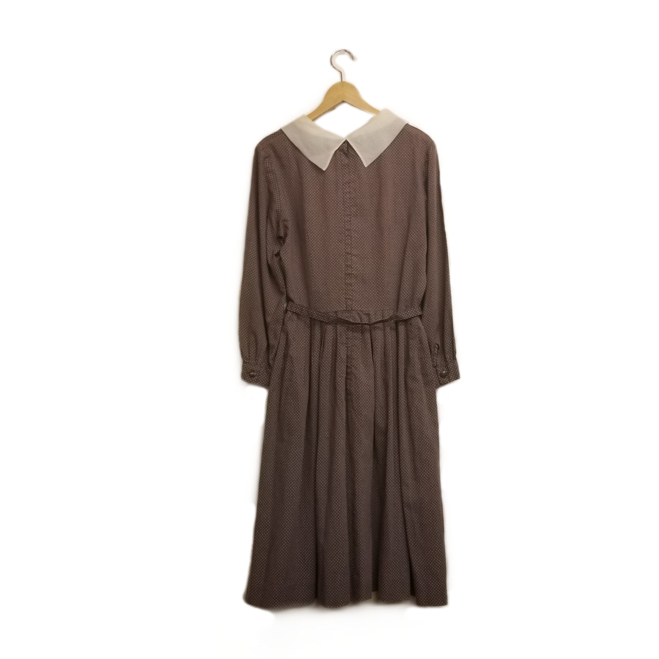 色味は、ブラウン × ホワイト。キチンと感のあるシルエットや、上品なシアー素材の襟が魅力的。総柄ですが細かいドットで程よいアクセントが◎ベルトでキュッと締まるウエストや、プリーツでフワッと広がる裾、クラシックなシルエットでヴィンテージ好きには堪らないポイントがたくさん詰まった一着です。