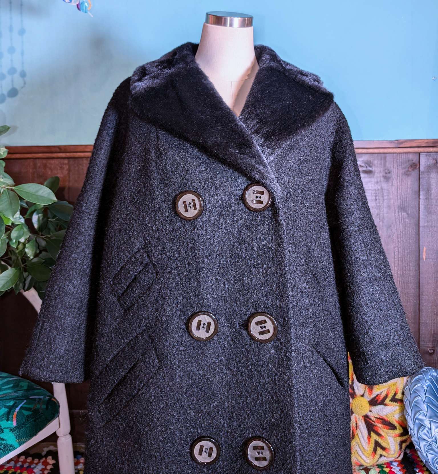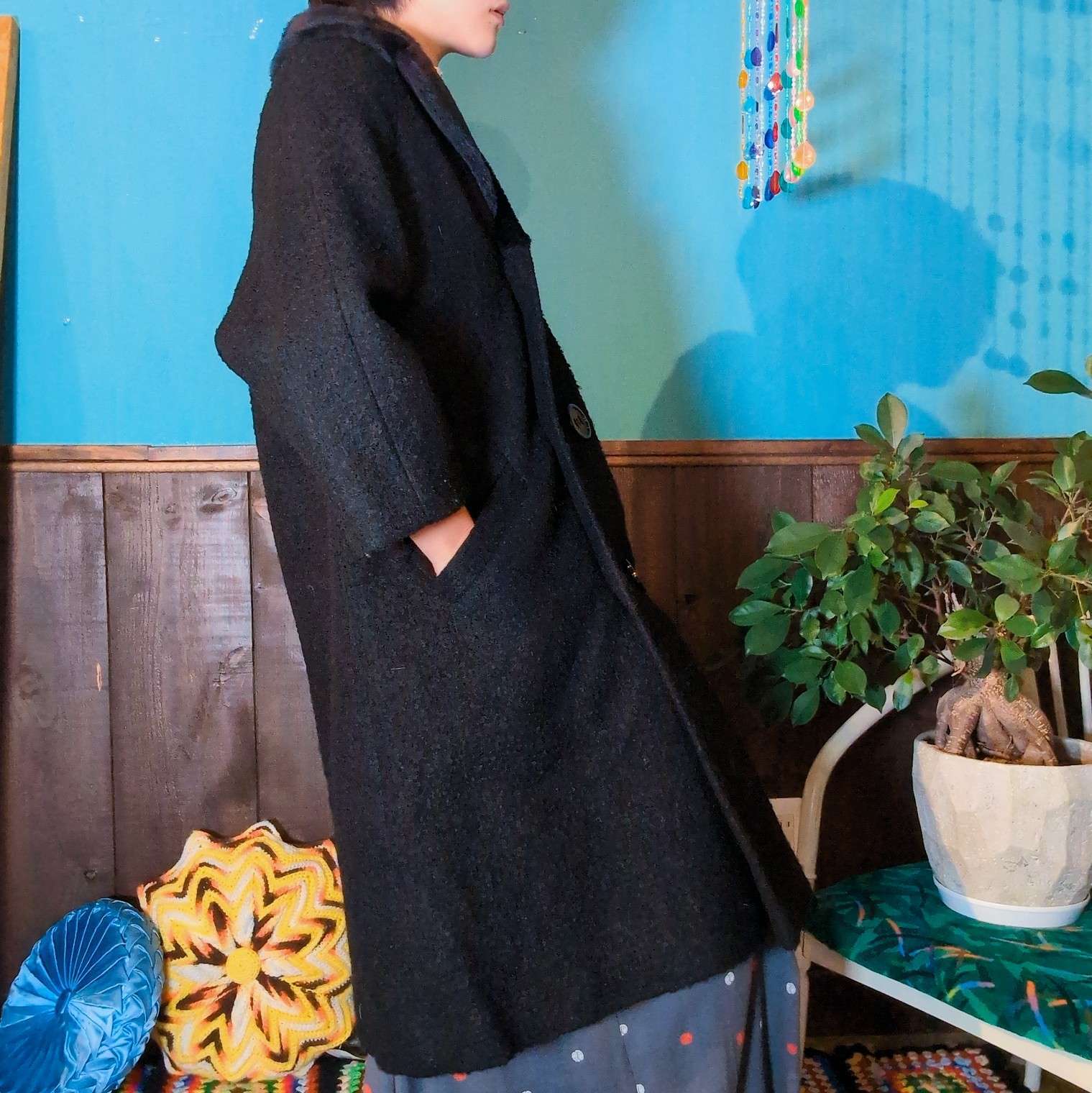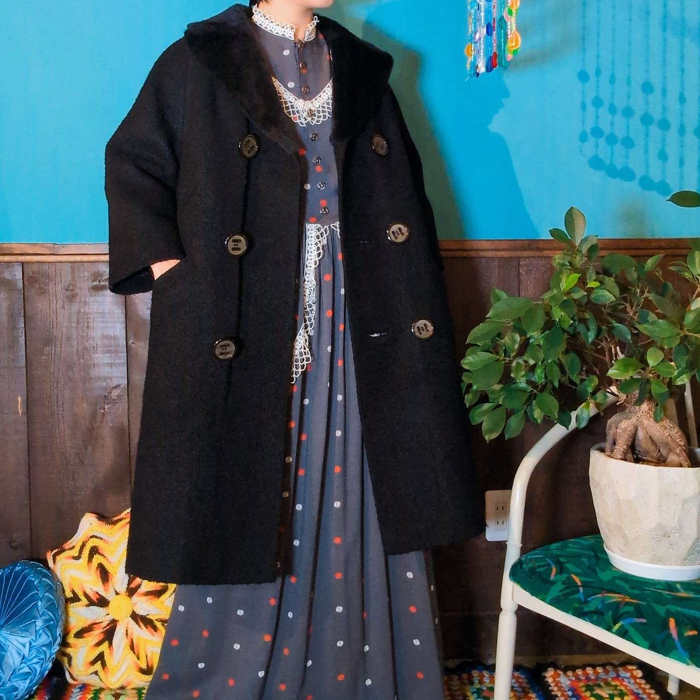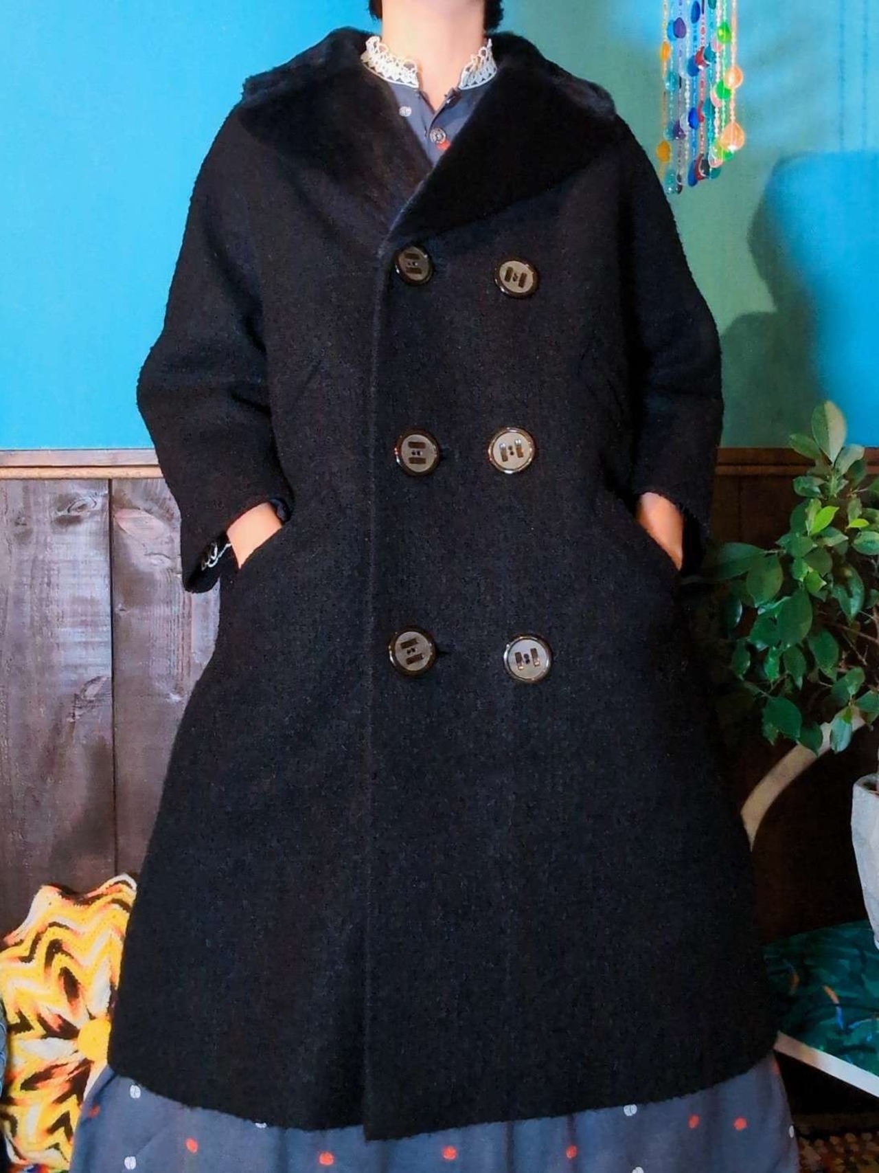 色味は、ブラック。しっとりと雰囲気のある襟元と全体のカラーリングが落ち着きのある印象。大ぶりのボタンやポケットのデザインがアクセントになっていて、ヴィンテージならではの面白みのある一着です。