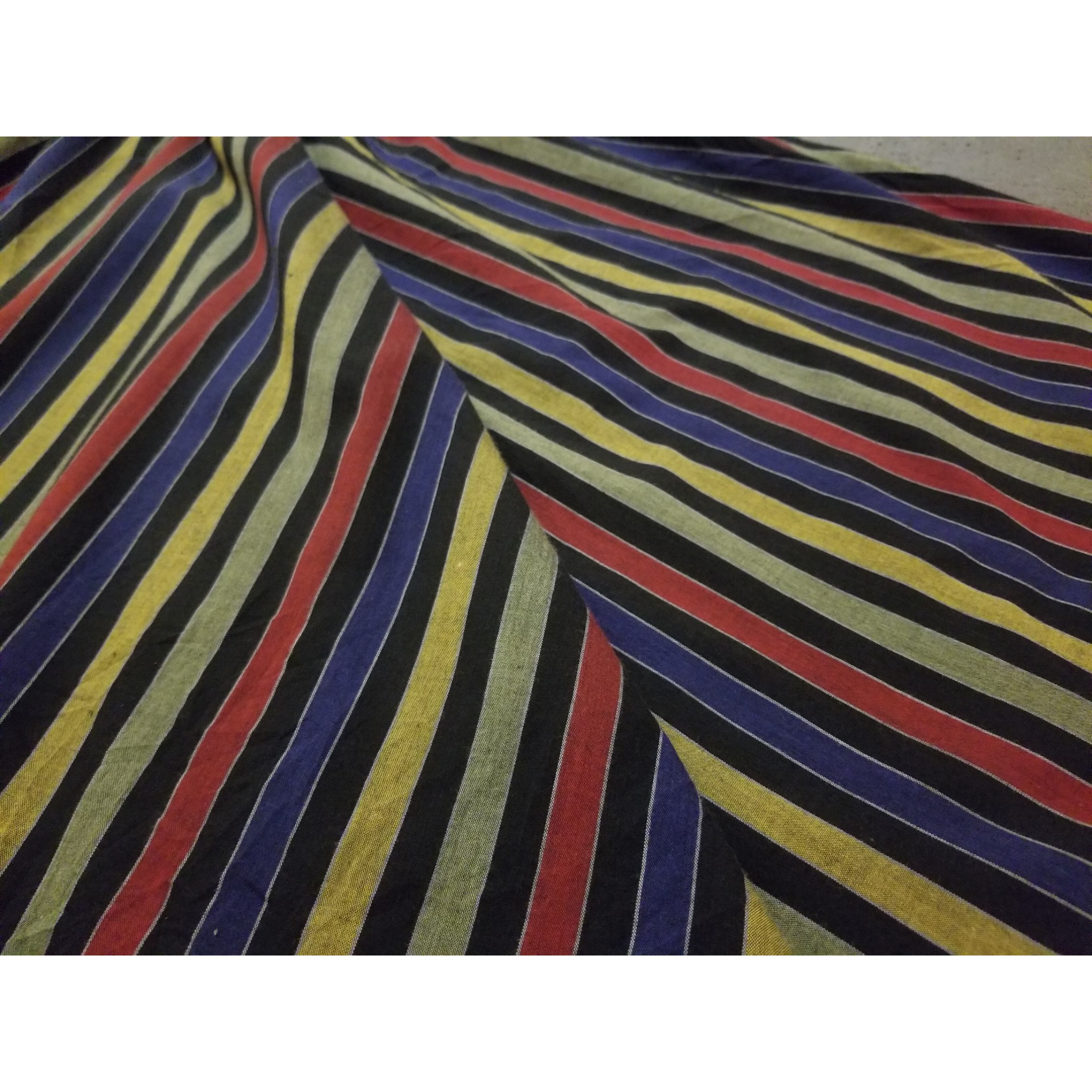 色味は、ブラック × ブルー × グリーン × レッド × イエロー。Aラインのシルエットと、カラフルなテキスタイルが魅力的。ウエストはゴムなのでストレスフリーに、さらりと着られるのが◎