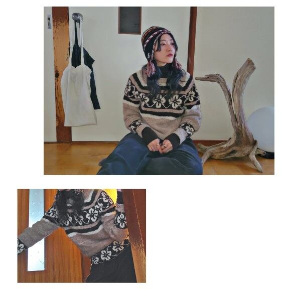 連なったお花のデザインと、ランダムなボーダーが可愛らしい一着です。デニムなどとのシンプルな合わせにもほどよく映えるデザインが◎