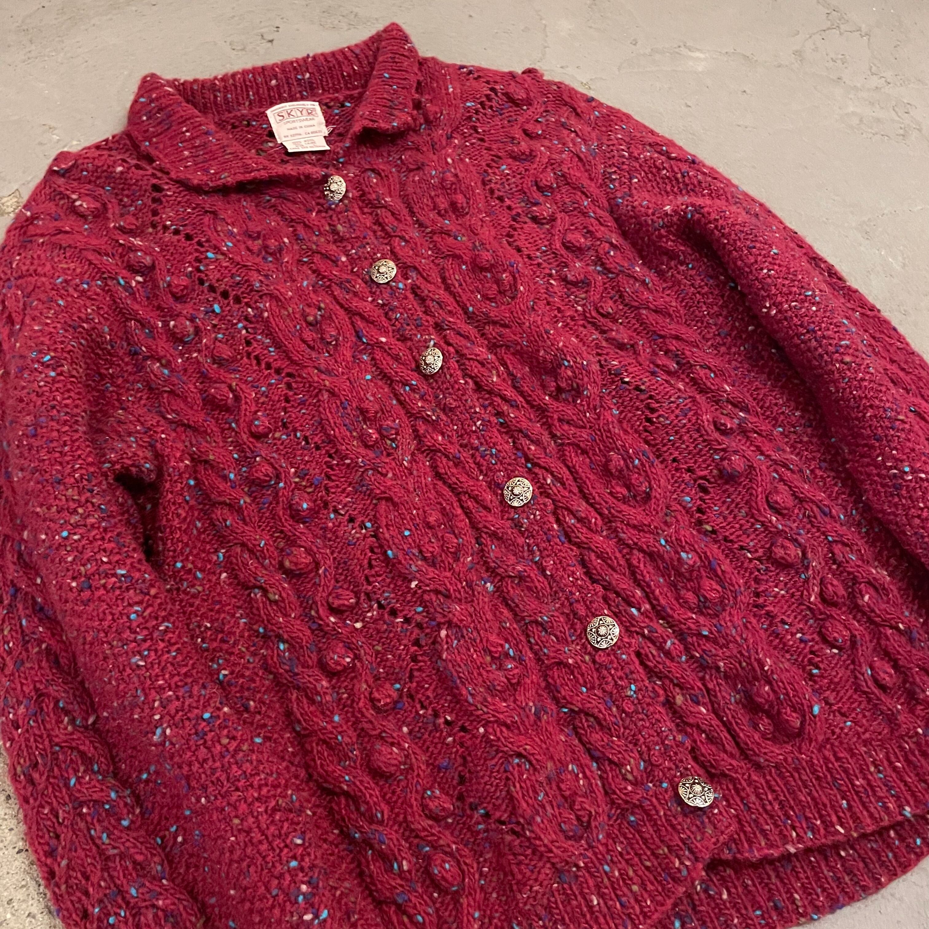 ダークピンクに、カラフルなネップとポコポコと立体的に編まれたニットに、所々透かし編みで