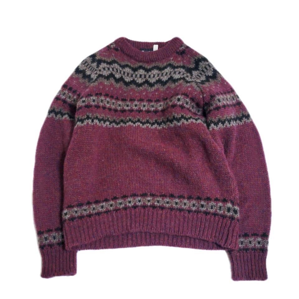 色味は、ボルドー × ブラック × グレー。渋みのある絶妙なボルドーメインのミックスヤーンのボディと、大人っぽいベーシックなカラーの柄が魅力的です。馴染みのよいラグランスリーブも◎