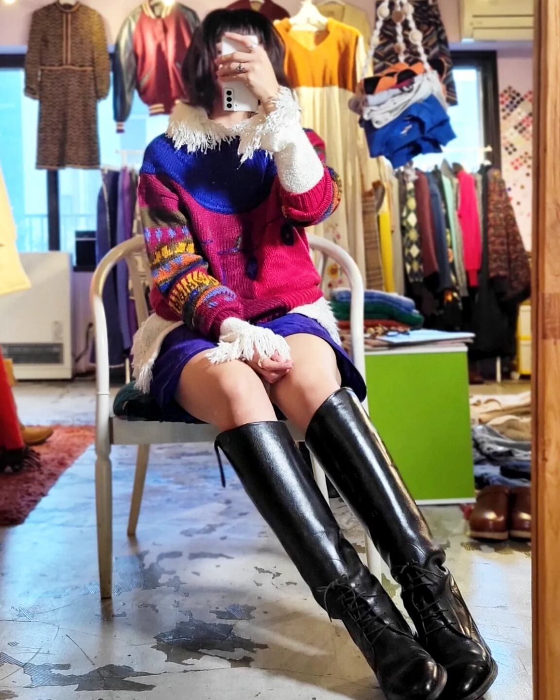 色味は、ピンク × ブルー × パープル × カーキ × マスタード × オレンジ。ビビッドなカラーリングと立体的な刺繍、袖の部分は総柄になっていたりとユニークな印象が魅力的な一着です。