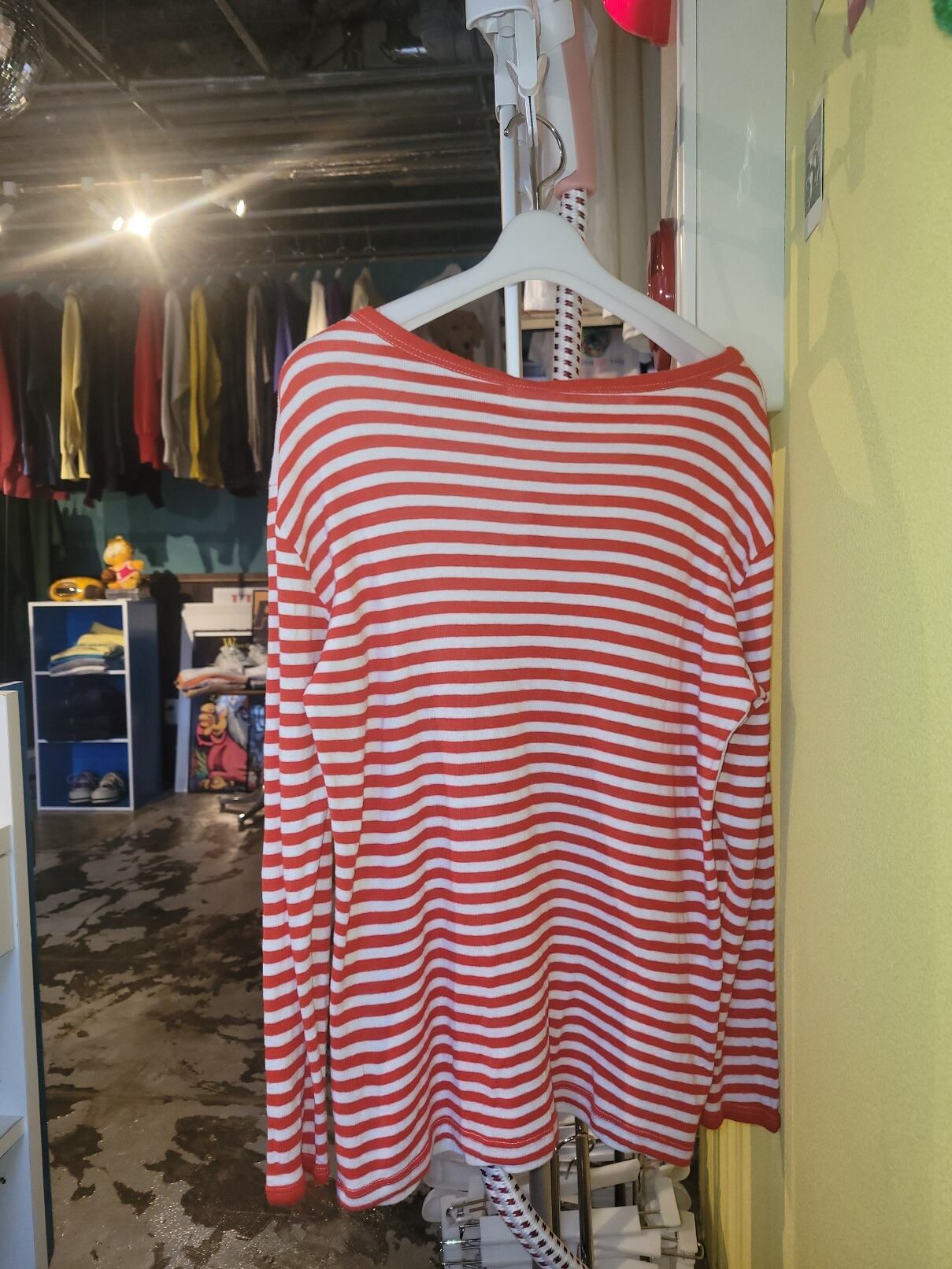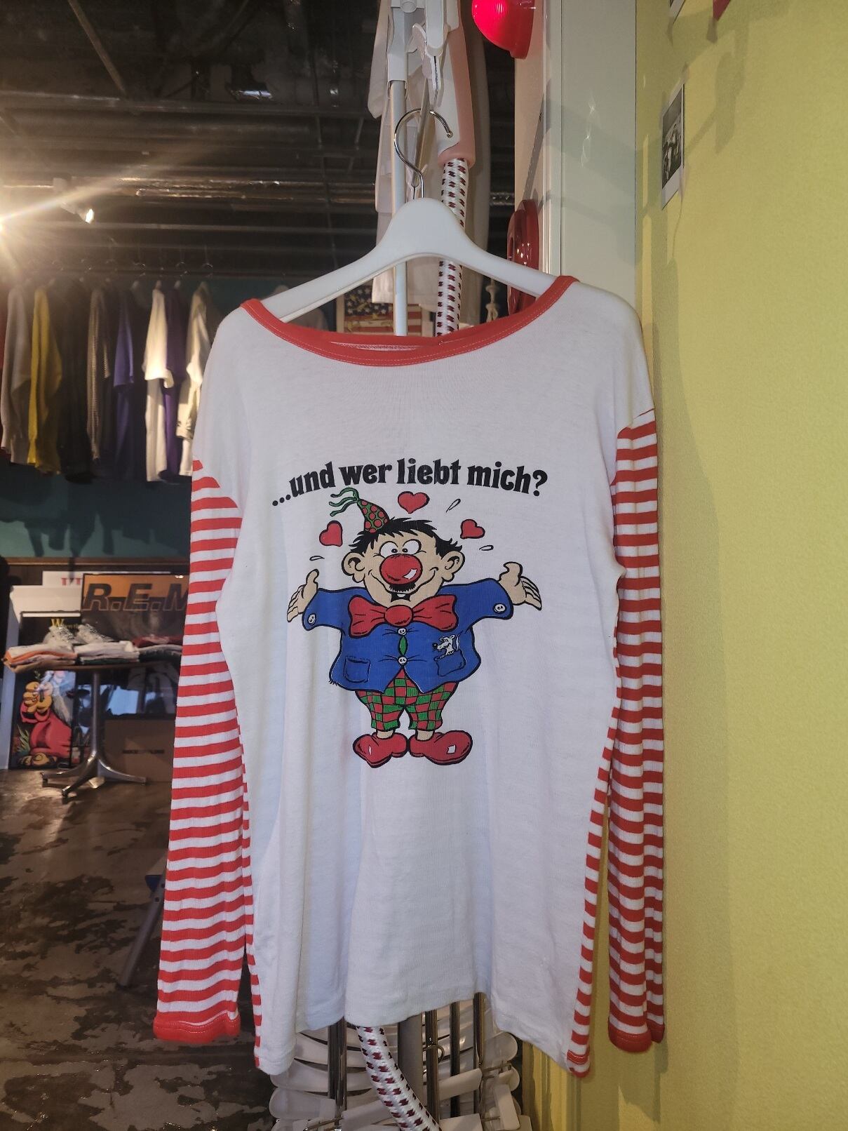 色味は、レッド × ブルー × ホワイト × ブラック × ブラウン × ベージュ。キュートなピエロさんがプリントされたユニークな一着。ユルっとした首もとや袖部分と背面がボーダーになっていたりとなんだかかわいい。