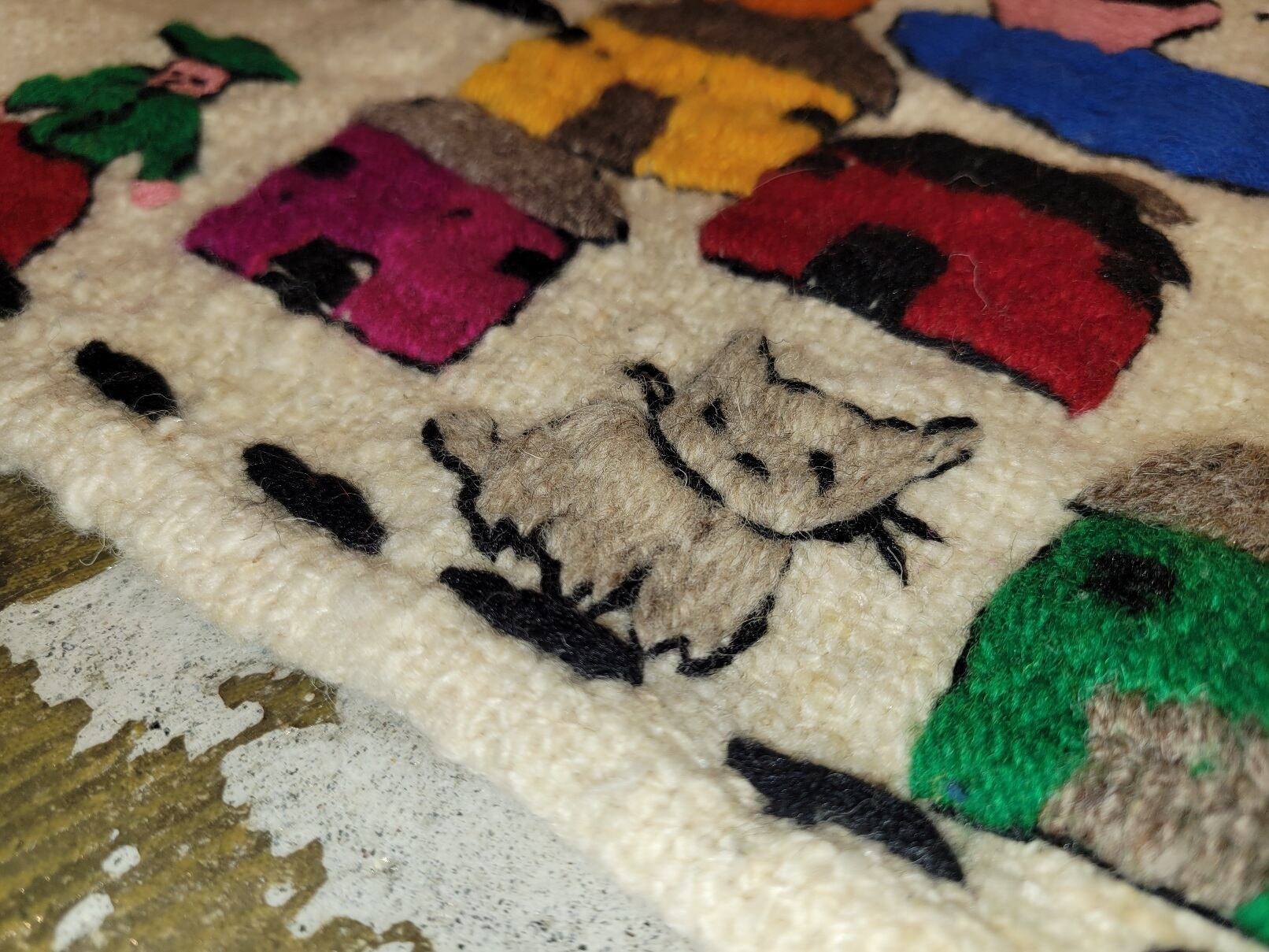 町並みのデザイン。なんとも言えない表情の人々や動物が各々の時間を過ごしています。玄関マットなどとして使いやすいサイズ感です。