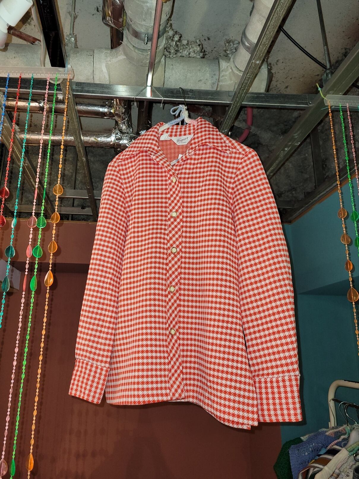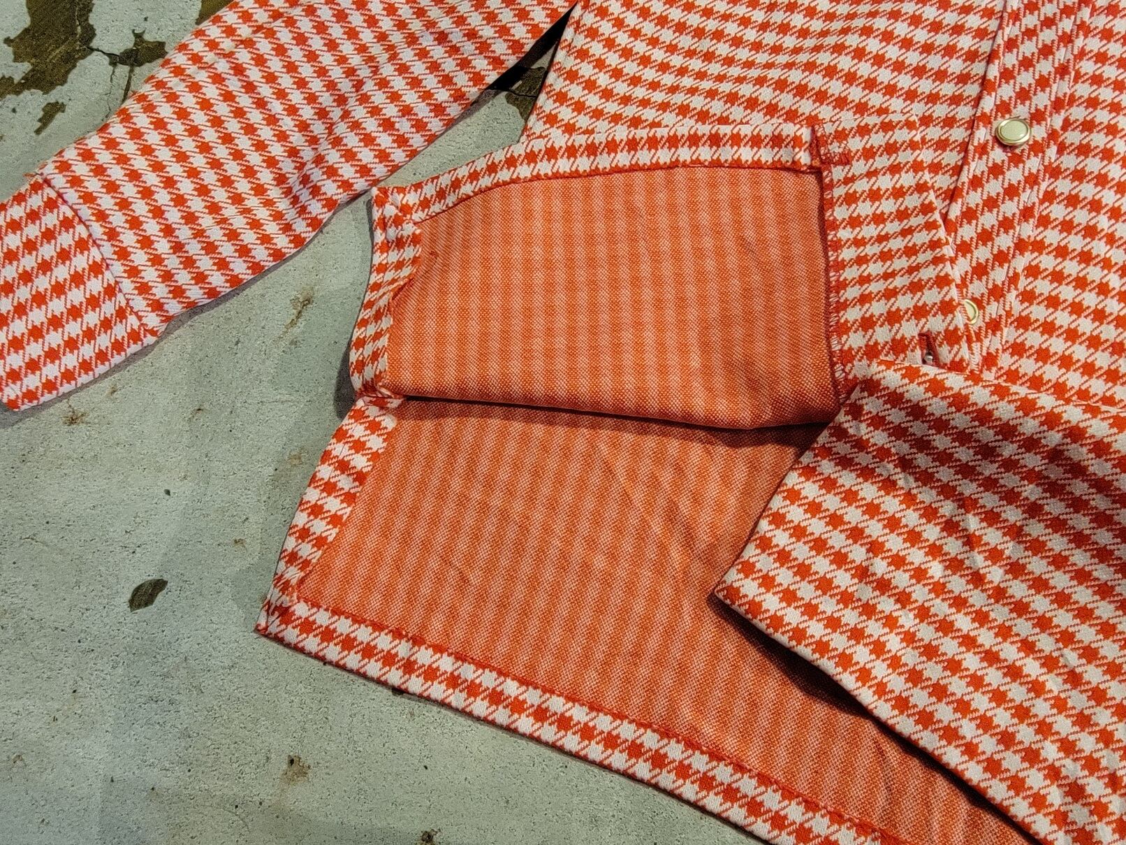 色味は、レッド × ホワイト。ポリエステルのほどよい厚みは、ジャケットのようにさらっと羽織ってもカチッとシルエットが決まるのが魅力的。テキスタイルは千鳥格子、ほどよくアクセントになる色味も上出来。