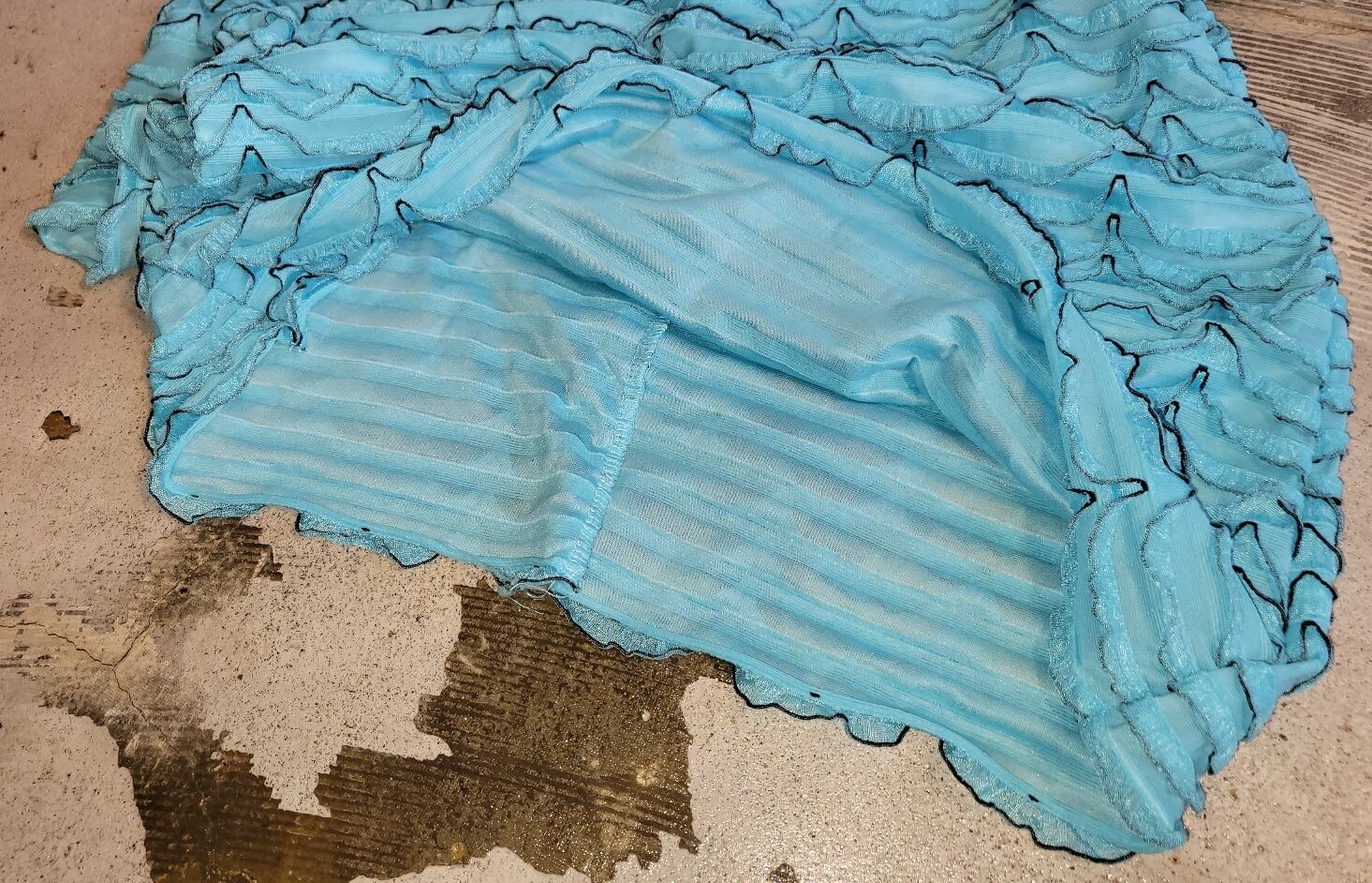 色味は、シアン × ブラック。さざ波のようなデザインが涼しげ。前も後ろも全部フリフリ。爽やかなカラーにブラックのポイント使いが締まる。一辺倒になりがちな薄着の季節にぜひ。