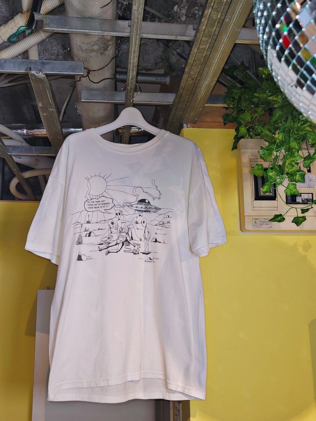 色味は、ホワイト × ブラック。宇宙人とロボットの衝突現場のプリント。ロボットが相当高く飛んでいたのかUFOが低空飛行してたのか。そしてこのロボットは無事アメリカ空軍に連絡してもらえたのか?ひとつだけわかるのは弁明している真ん中の宇宙人ちゃんが操縦士だったのであろうと言うことだけ。ユニークなTシャツです。