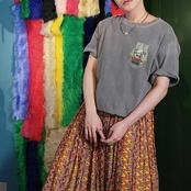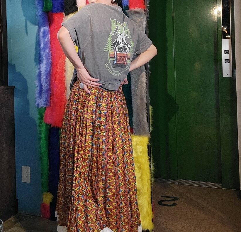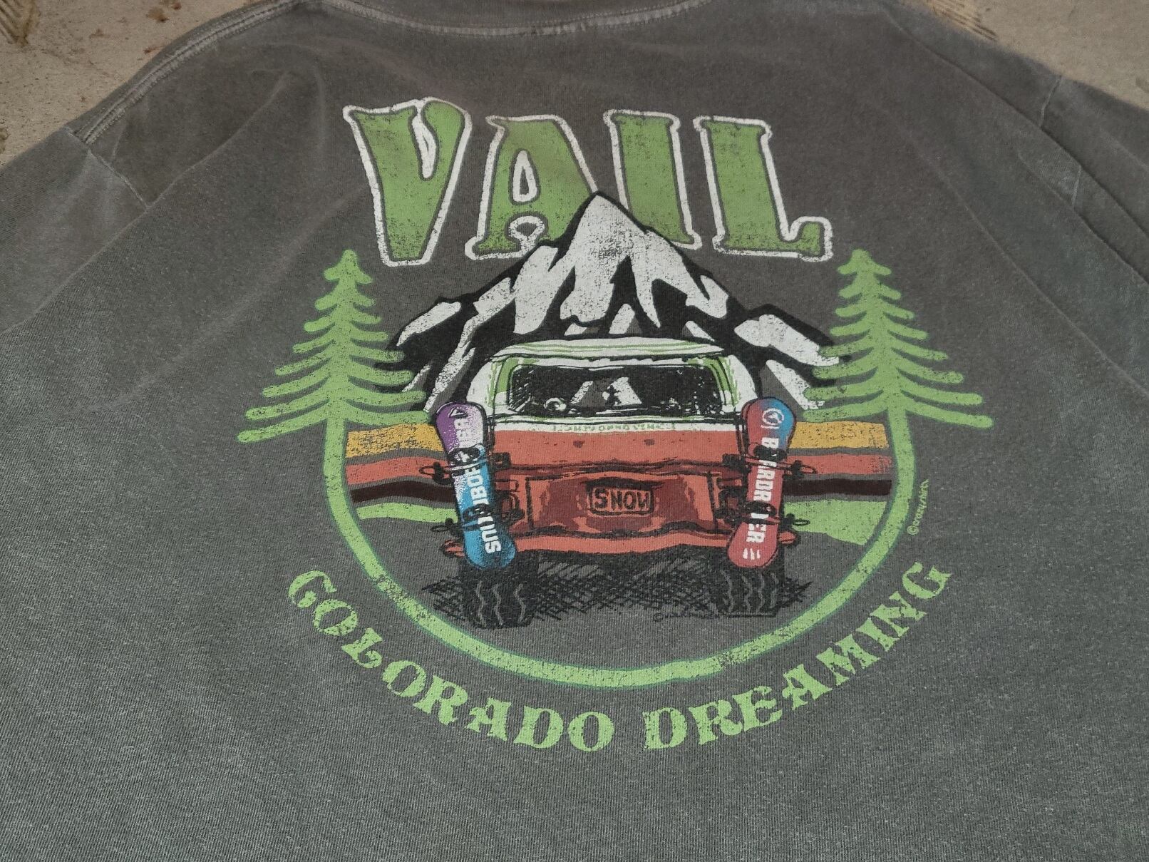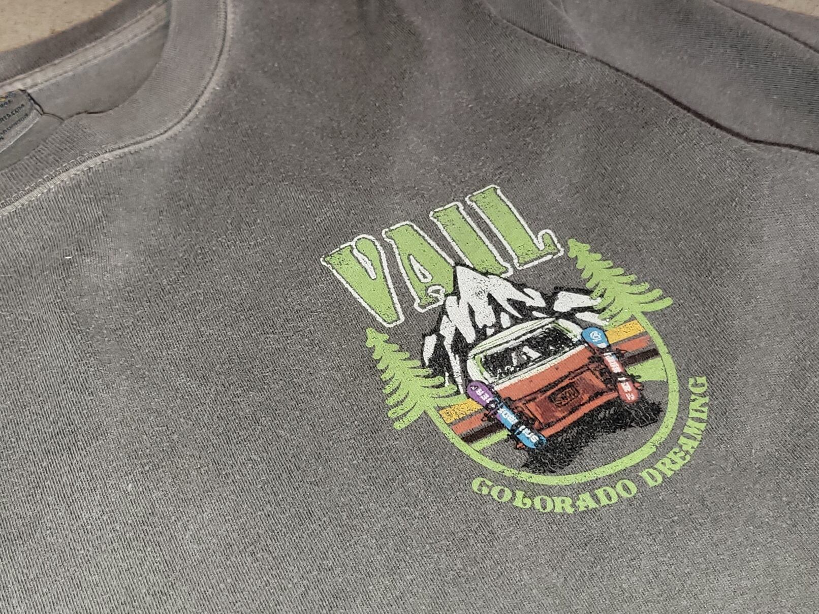 色味は、グレー × グリーン × レッド × ブルー。アメリカで最も有名なスキー場、ベイル。車にボードを積み込んでいざという場面でしょうか。フロントにはワンポイント、バックにどどんと入ったプリントがかわいいです。