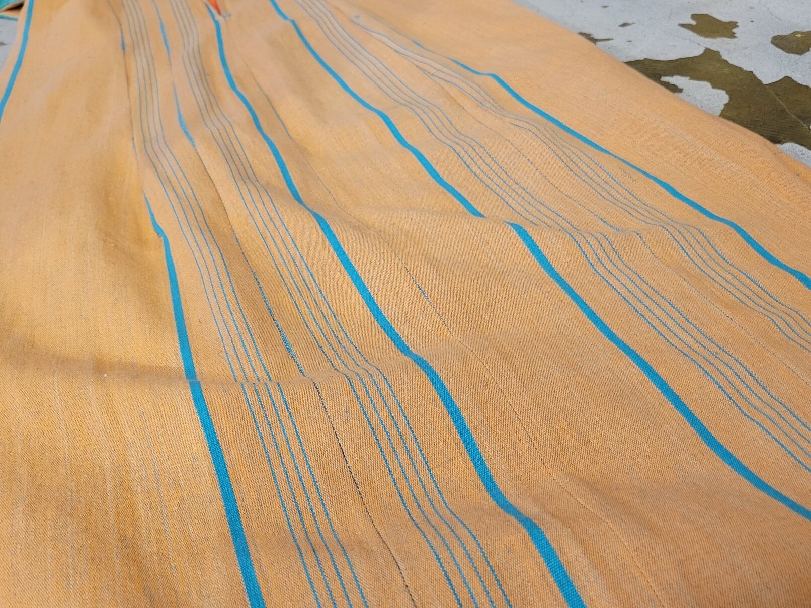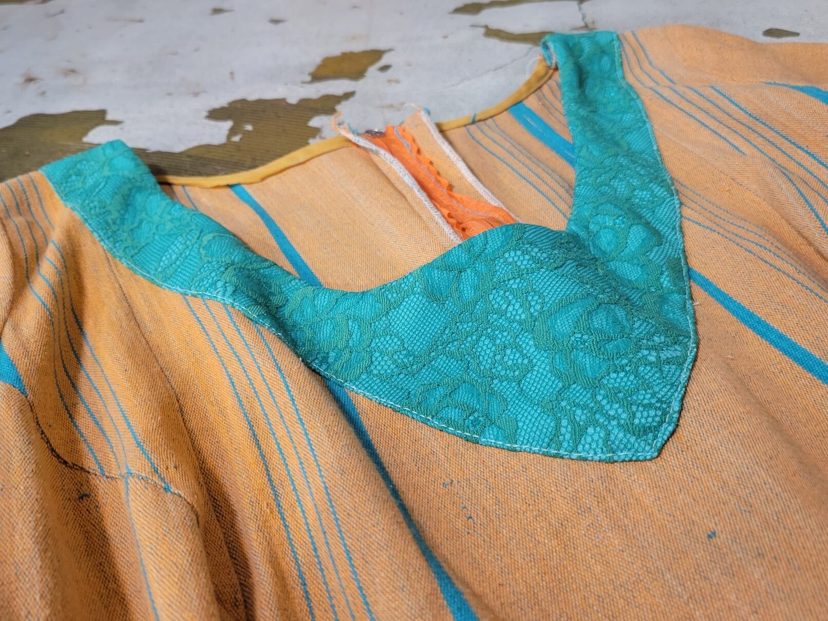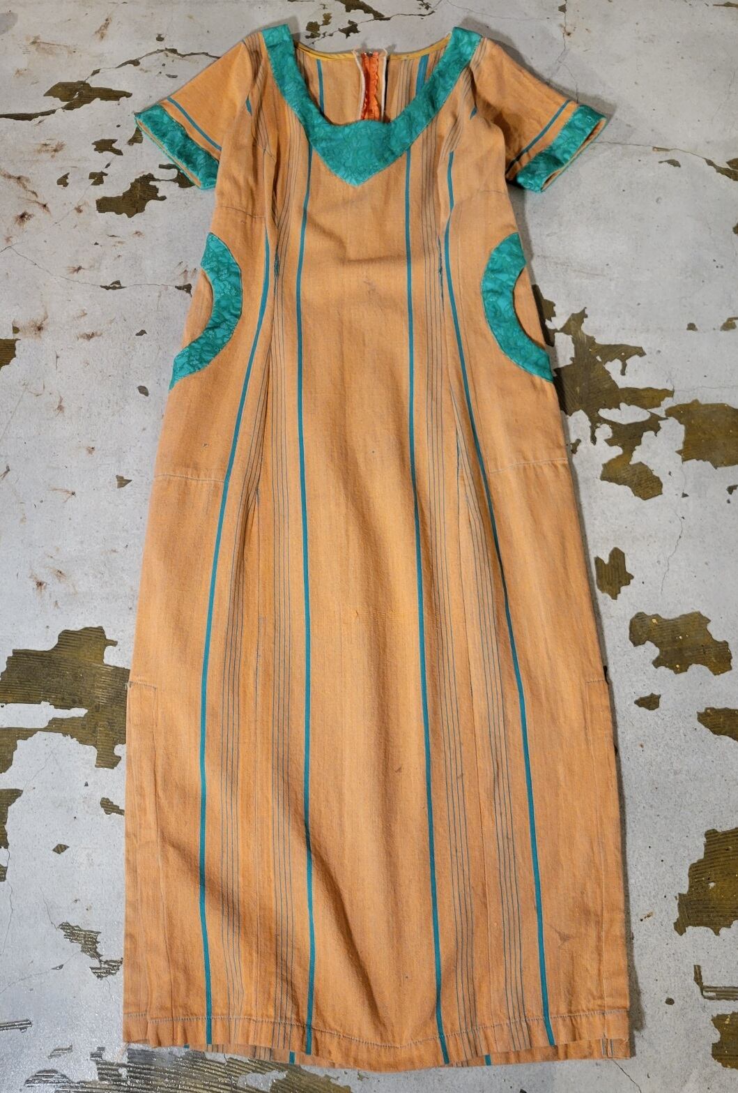 色味は、オレンジ × グリーン。エスニックなガサッとしたコットンのような生地にぱっと映えるミドリのレースのギャップ、ラウンドしているデザインのポケットなど面白味のある一着です。