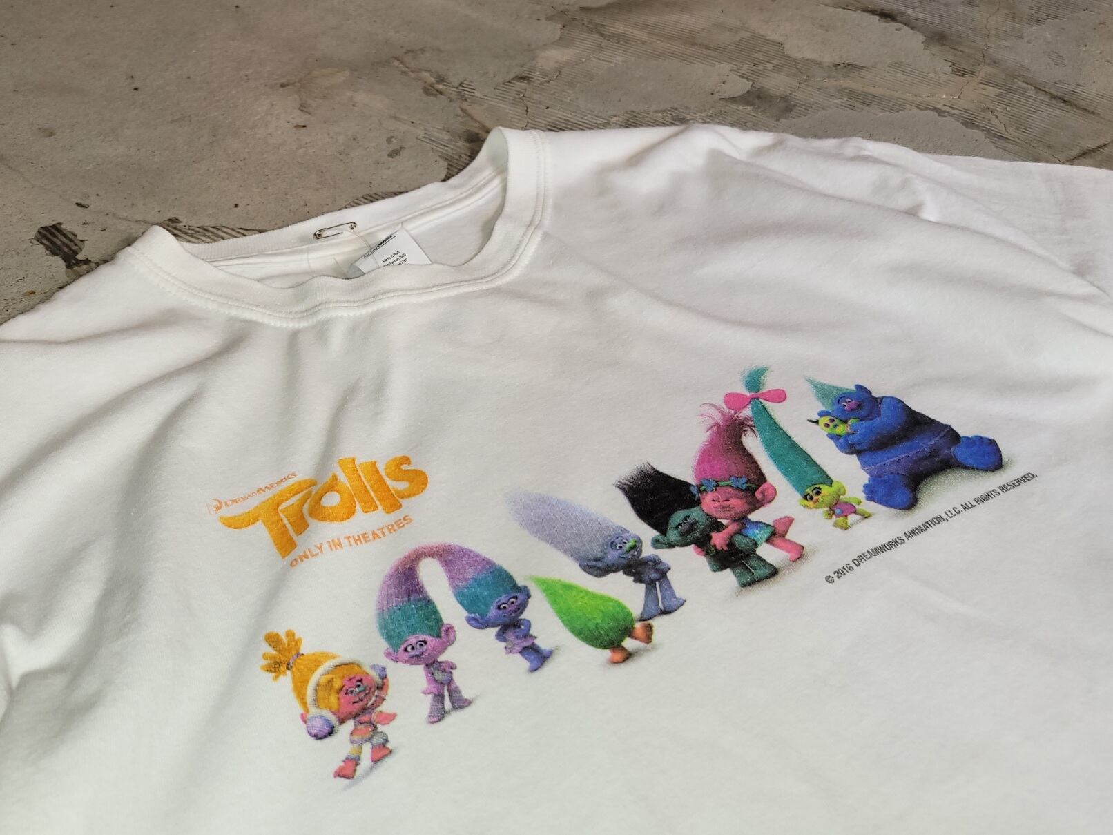 色味は、ホワイト × レッド × イエロー × ブルー × パープル × ピンク。フロントにはかわいらしいトロールちゃんたちが、背面にはロゴがプリントされています。ゆるっとしたサイズ感も相まってファーニーな一着です。