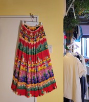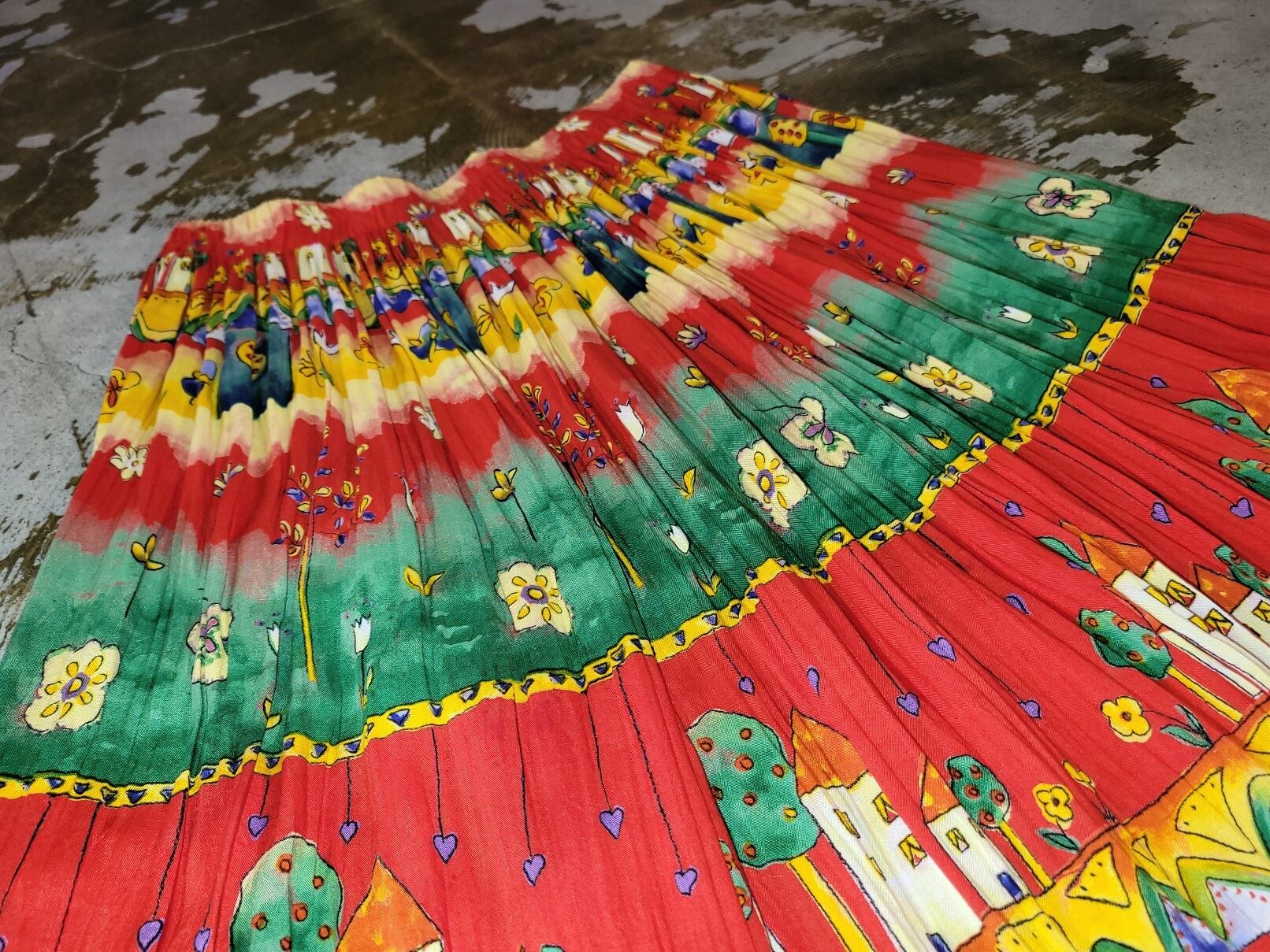 色味は、レッド × イエロー × ブルー × パープル × ブラック × ホワイト。お行儀よく並ぶお家、木、お花…そしてアヒル。にじむような独特な空の色使いと独特のタッチが可愛いテキスタイル。さらりと気持ちのよい着心地。