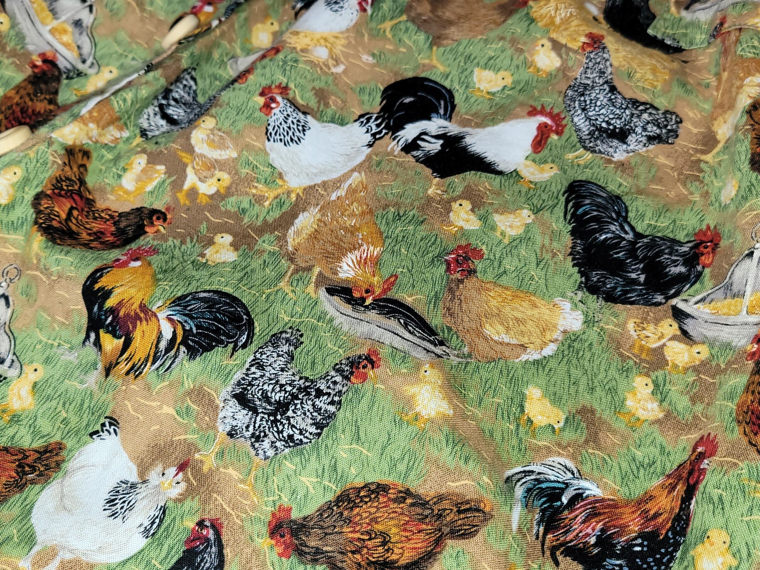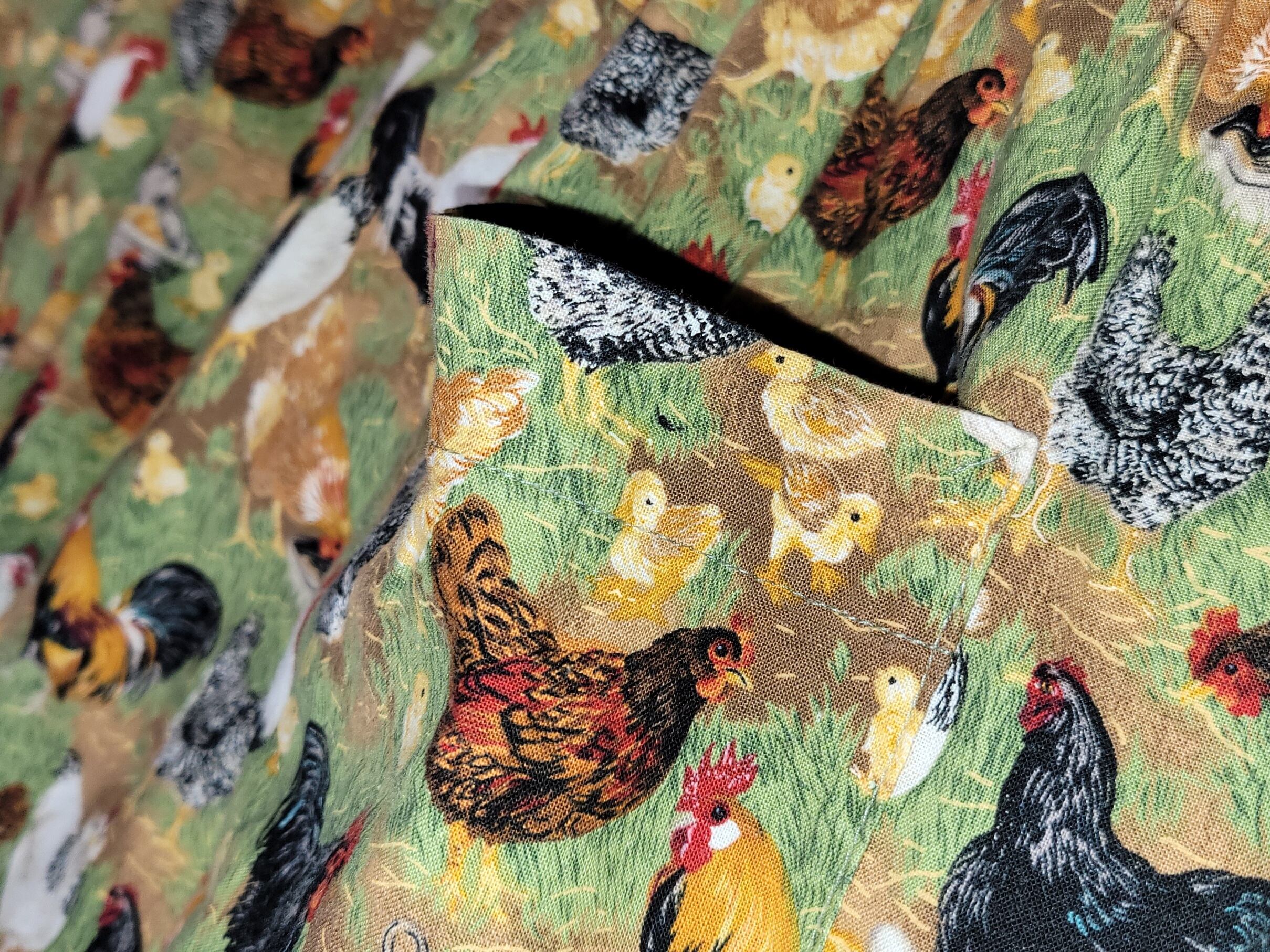色味は、グリーン × レッド × ブラック × ホワイト × グレー。一面のにわとりとひよこちゃん。鳴き声がいまにも聞こえてきそうなインパクトあるテキスタイルが魅力的。ボタンで前平きなので羽織のように使ってもよし。