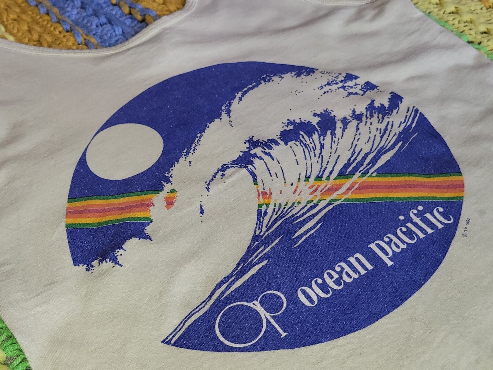 色味は、クリーム × ブルー × グリーン × オレンジ × イエロー。波、虹、多分丸いのは太陽。夏してる感じのタンクトップ。身幅は広めでゆるっと着られます。柄のアイテムやTシャツ、キャミとのレイヤードもよさそう。