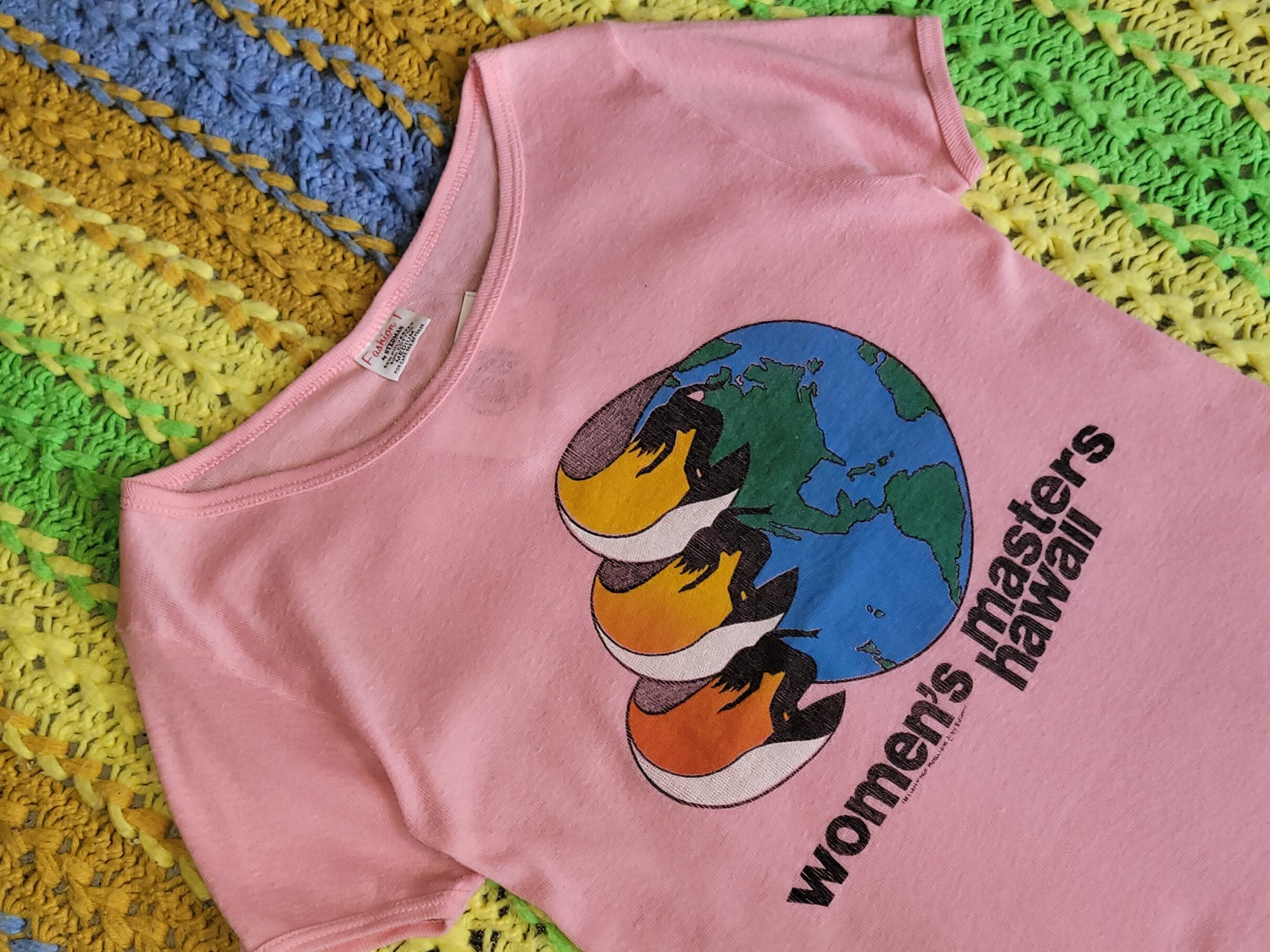 色味は、ピンク × ブルー × オレンジ × イエロー ×グリーン × ブラック。チビT。でも襟元はゆるくてそれもかわいい。そこはかとなくY2Kっぽい雰囲気も感じなくはないけれどポリコットンの薄くて柔らかないい風合い。逆に今薄いデニムとか面白い小物とあわせて着たいかも~な感じです。