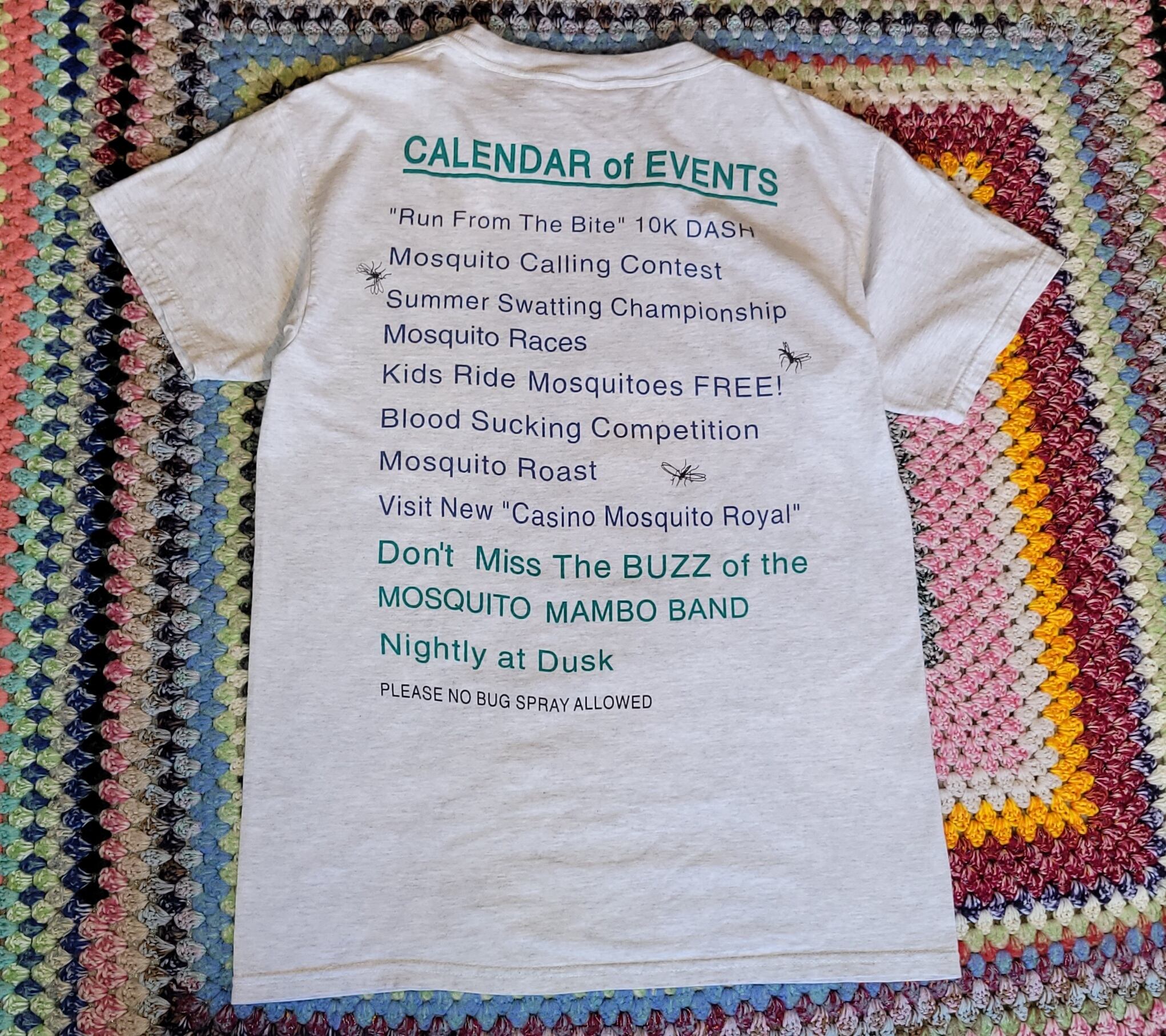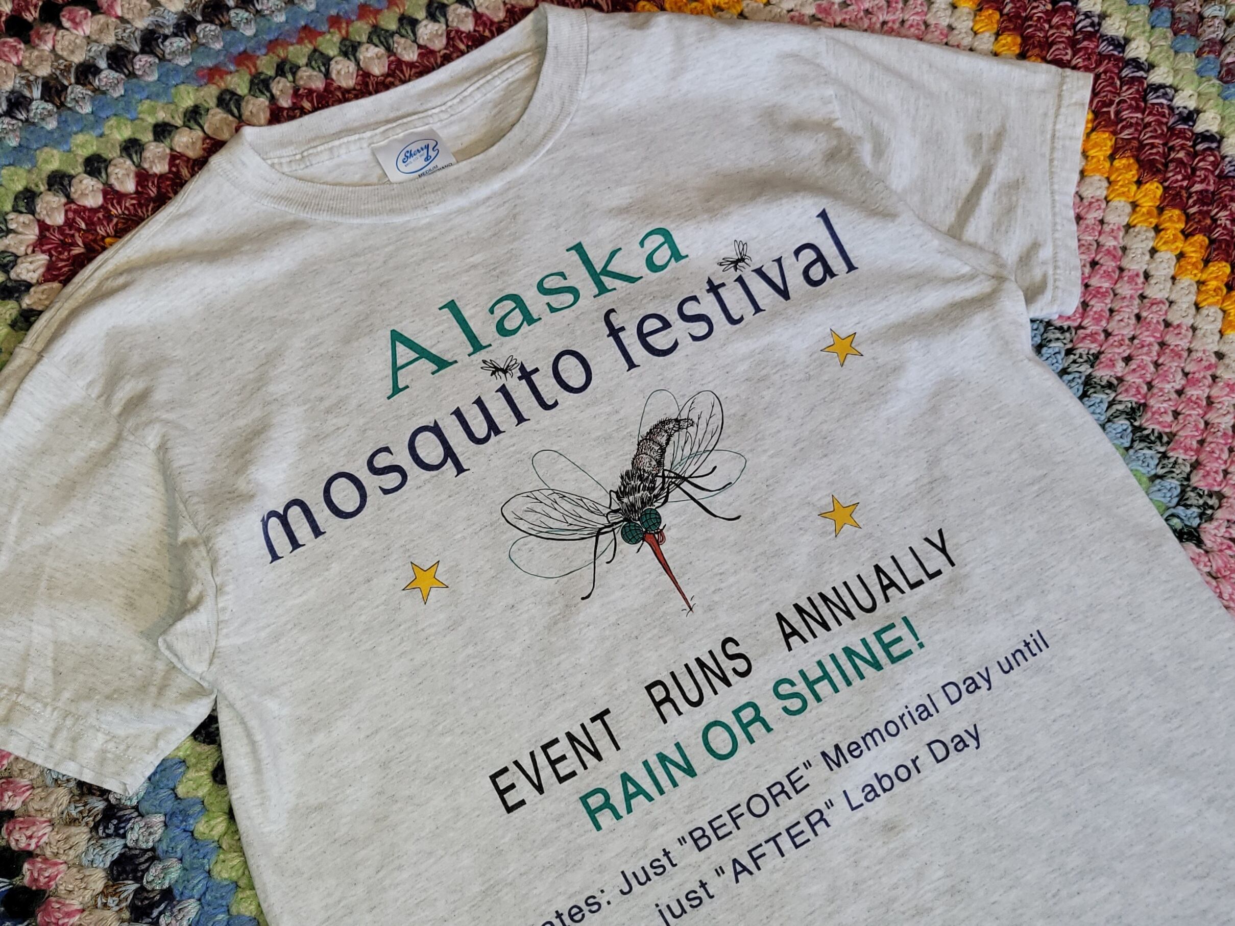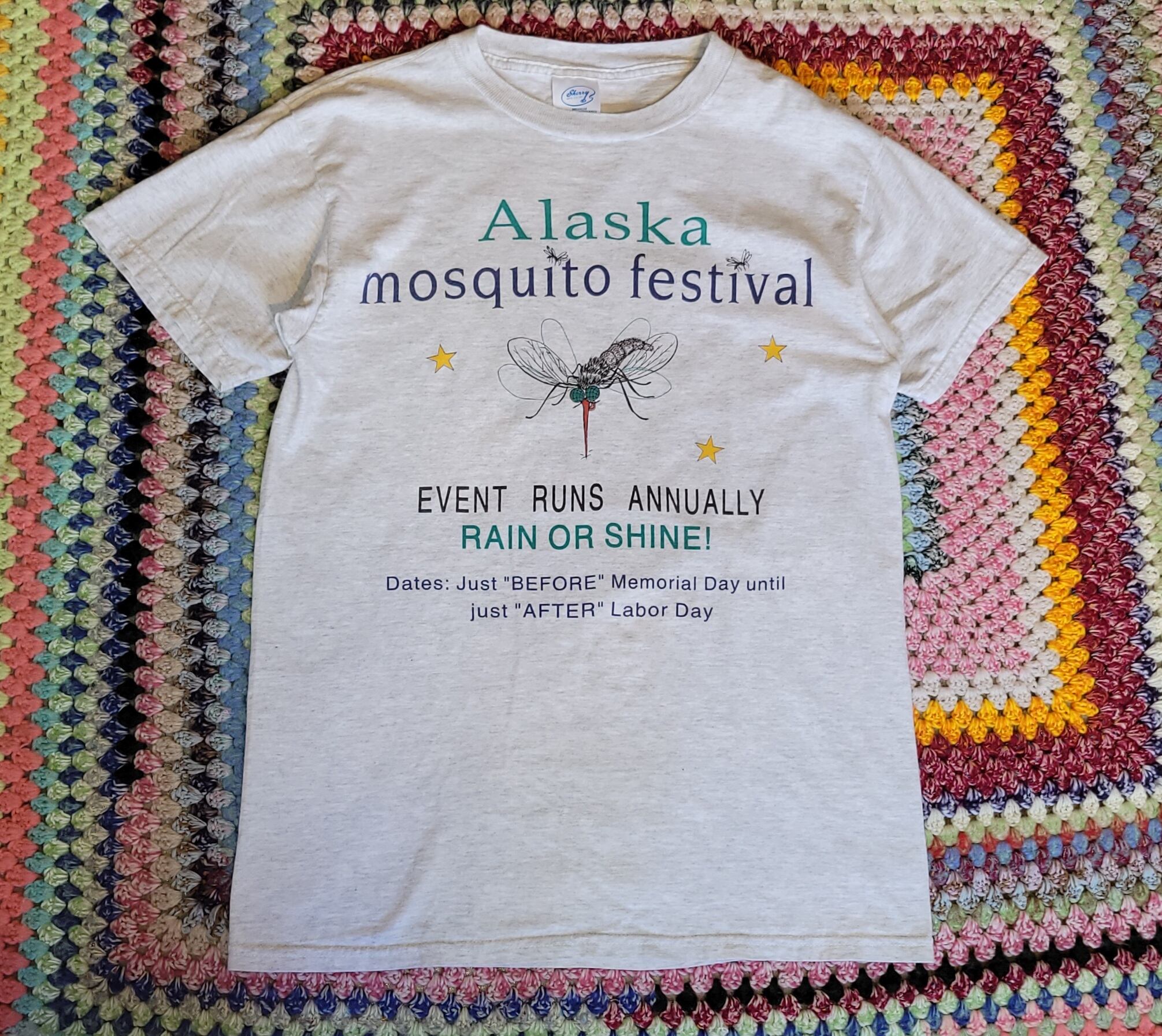 色味は、グレー × グリーン × イエロー × レッド × ブラック。アラスカ、モスキートフェスティバルのイベントTシャツです。どんなことするんだろう?まごうことなき蚊のプリントなのですが、なんかすごくよく見えてきちゃう。
