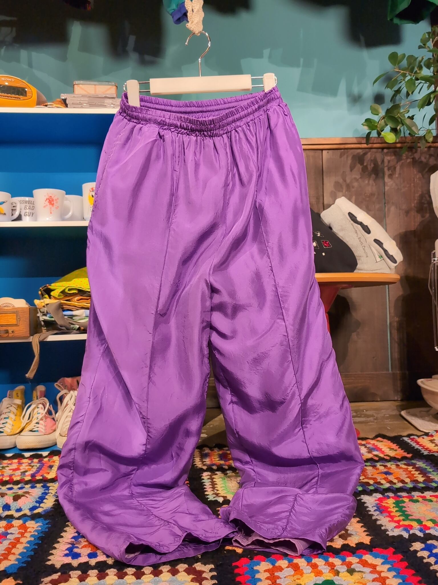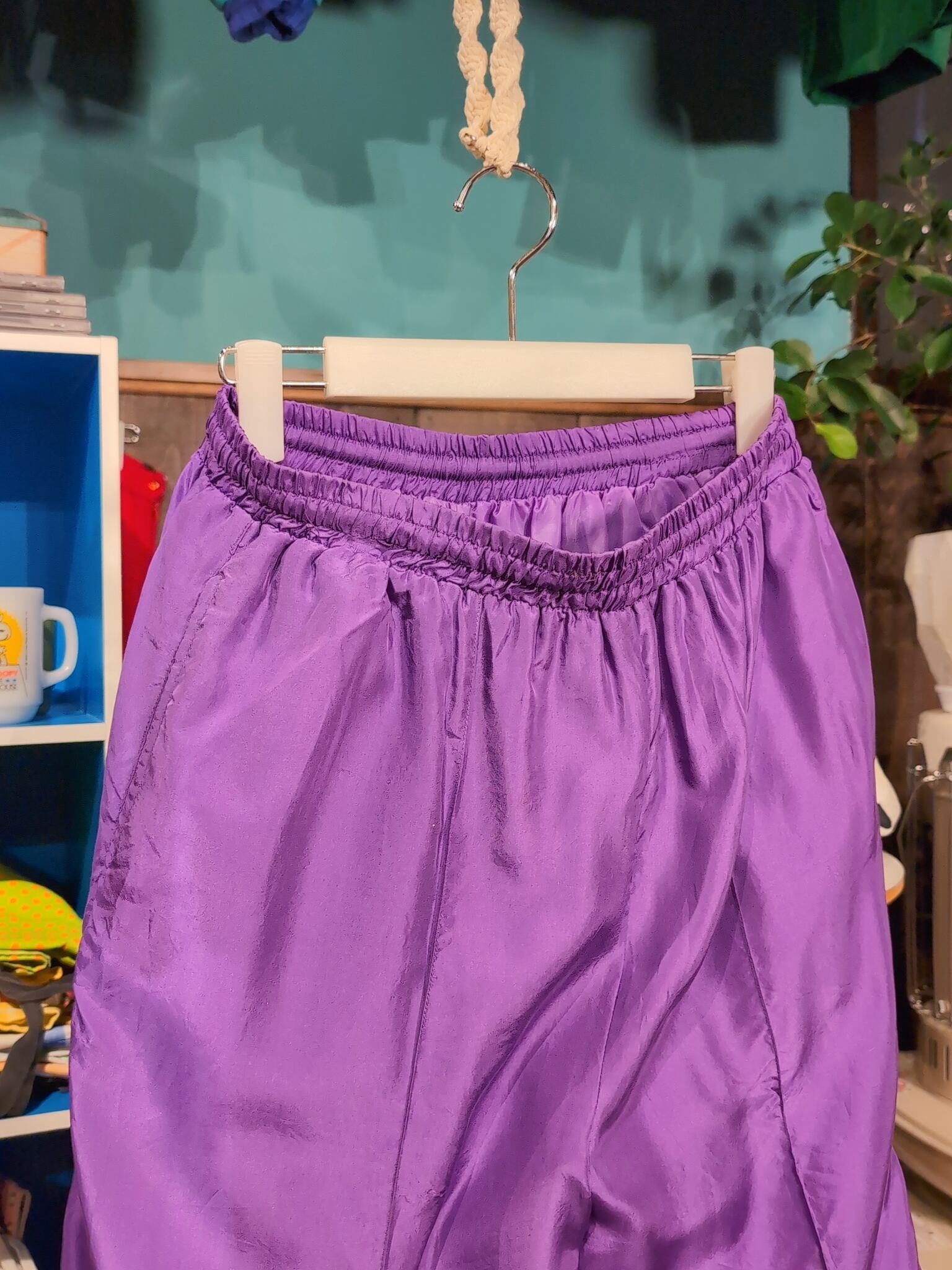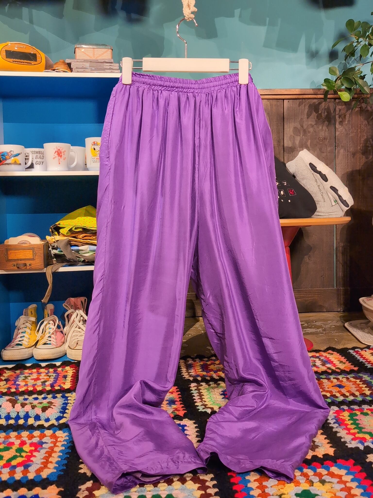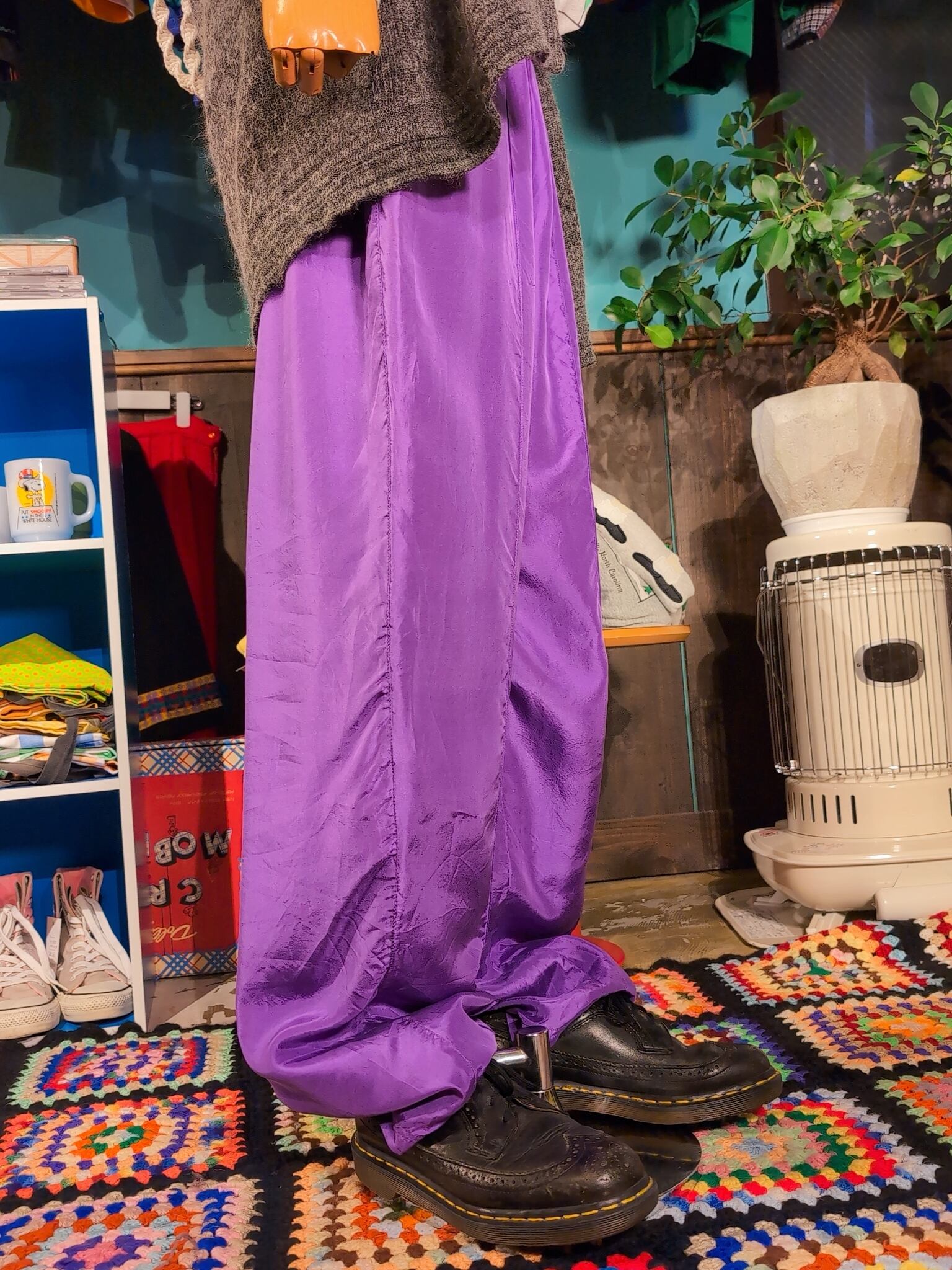 色味は、パープル。怪しい光方をするイージーパンツ。ラフに履けて、あわせるだけでもインパクトがありますが、履くと以外と馴染む。遊び心のあるあなたに。あと、裏地もついててありがたいです。