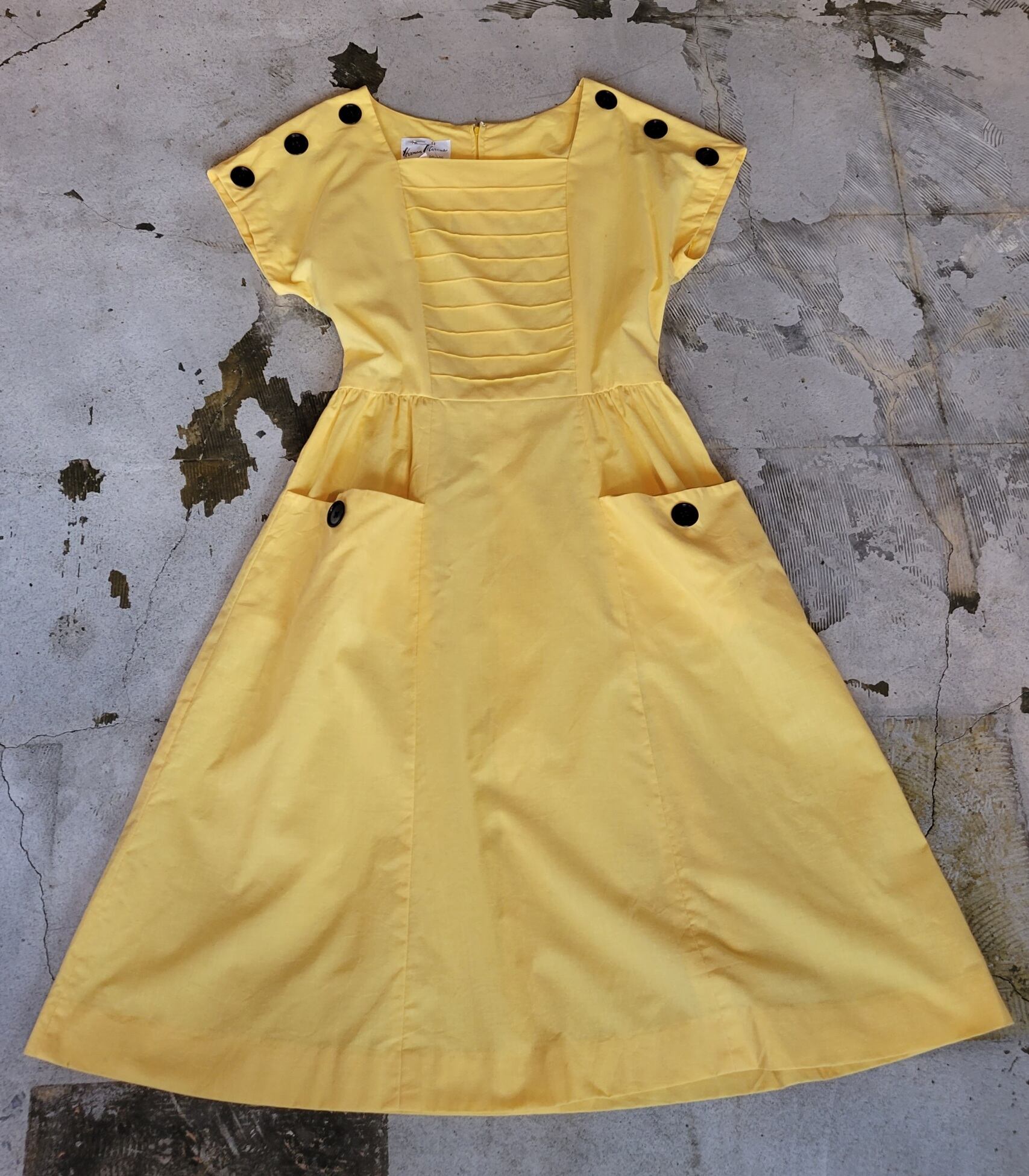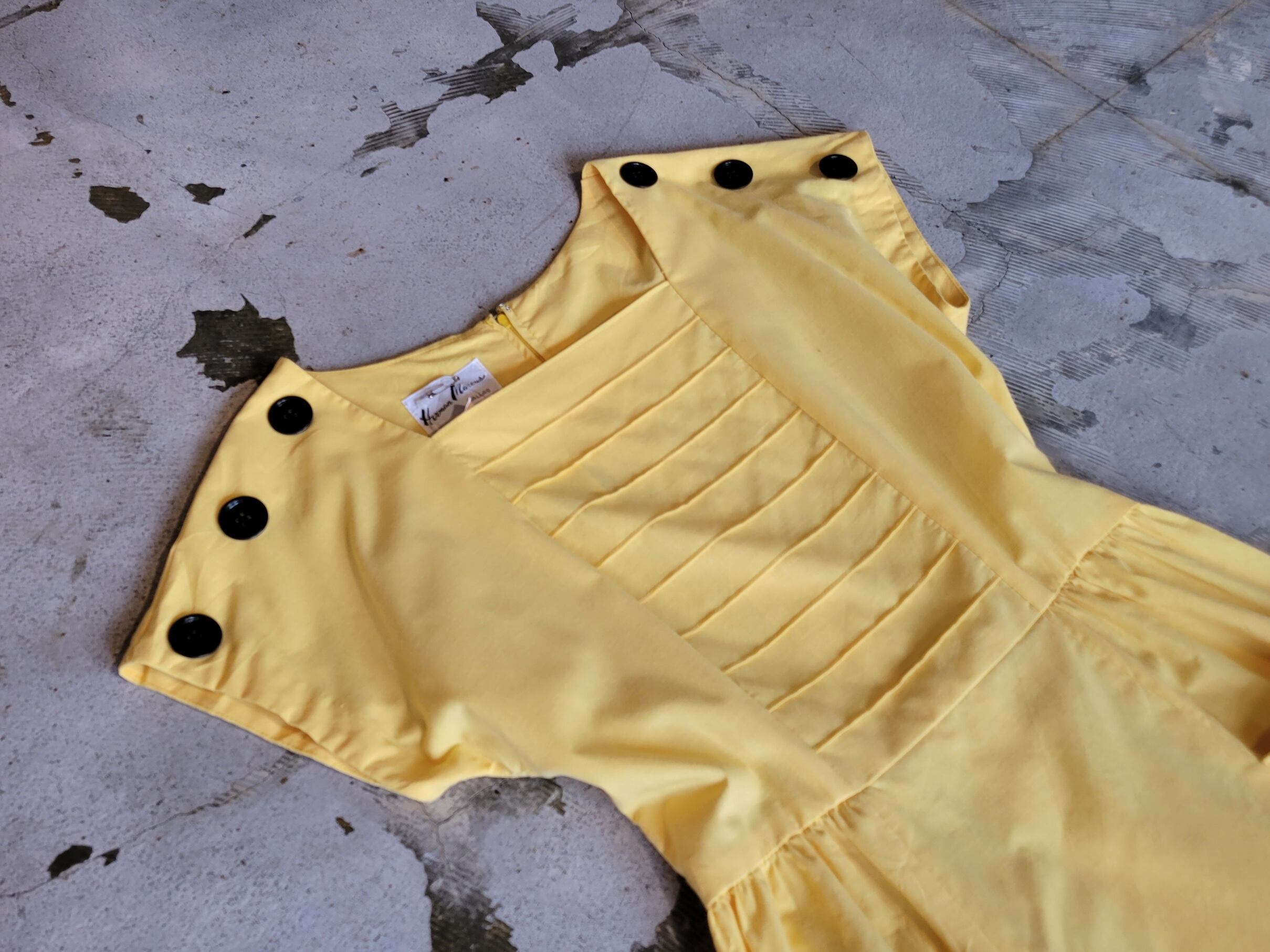 いろみは、イエロー × ブラック。シンプルな形、緩やかなAライン、華やかなカラー。あしらわれた大ぶりのボタンや大きなポケットも古着らしさがあり◎