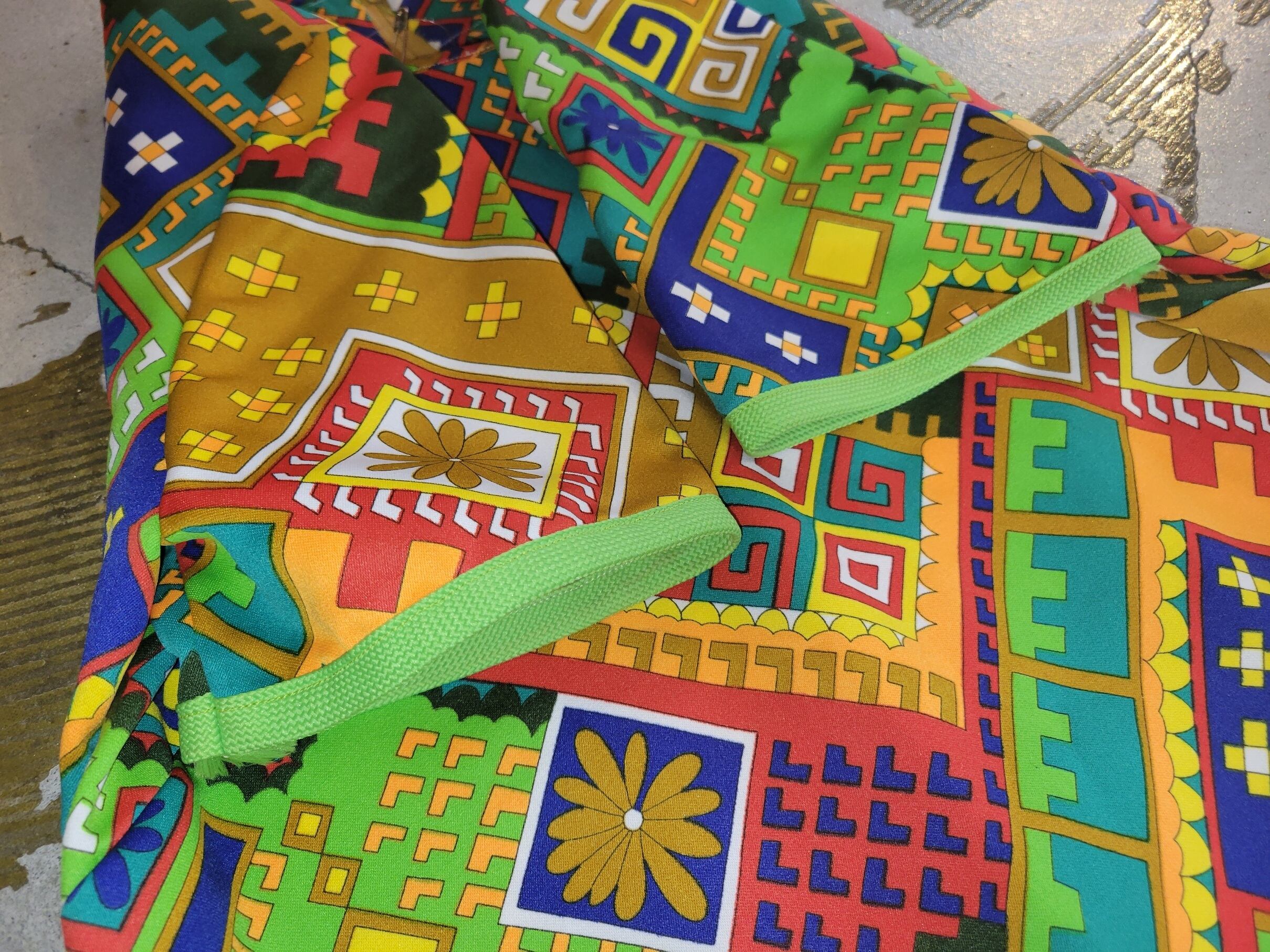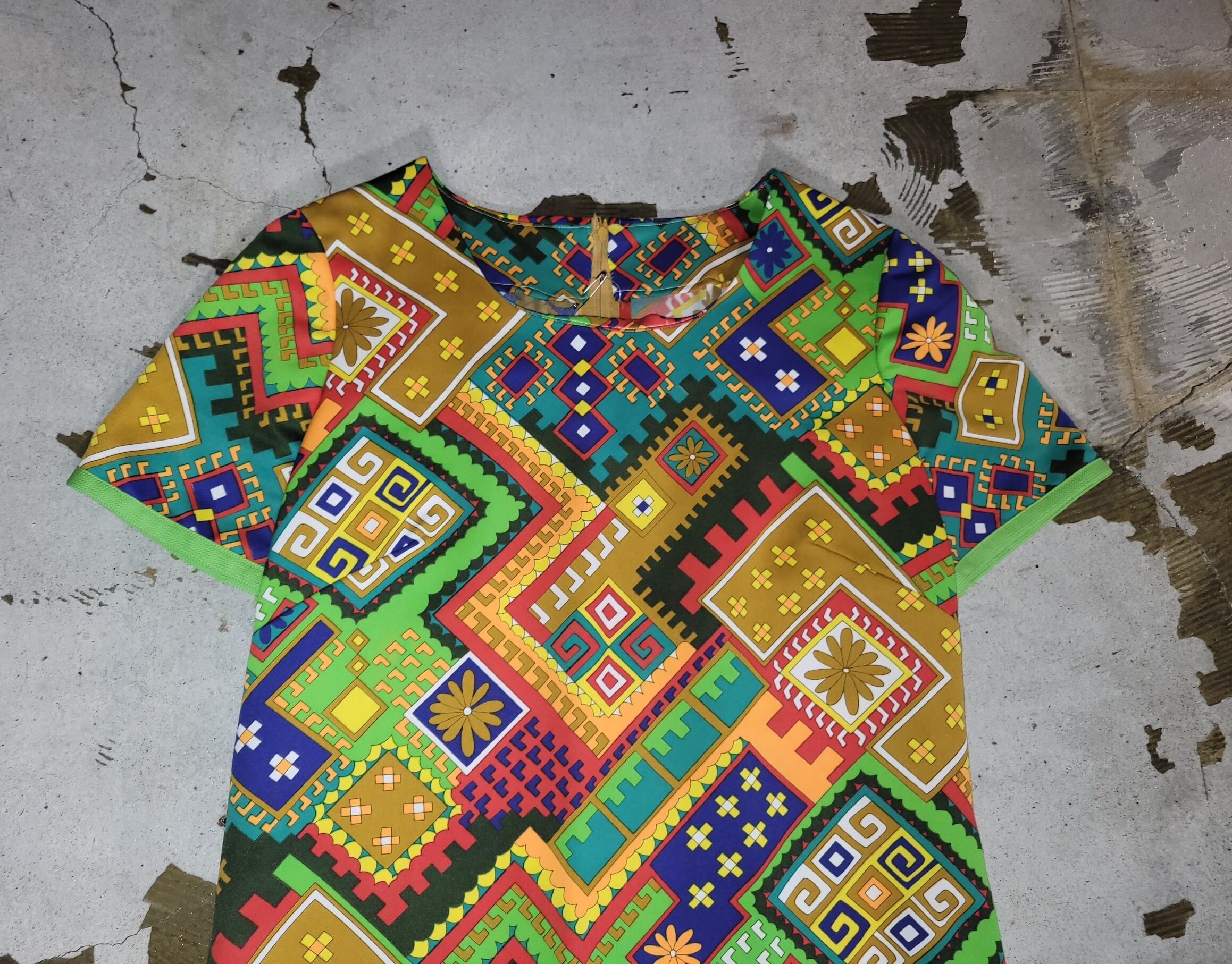 色味は、レッド × オレンジ × イエロー × グリーン × ホワイト、等々。ビビッドでパワフルなインパクトのある一着。スッキリとしたシルエット。スリットが入っているのでパンツやカラーのタイツとレイヤードしてチラ見せも◎