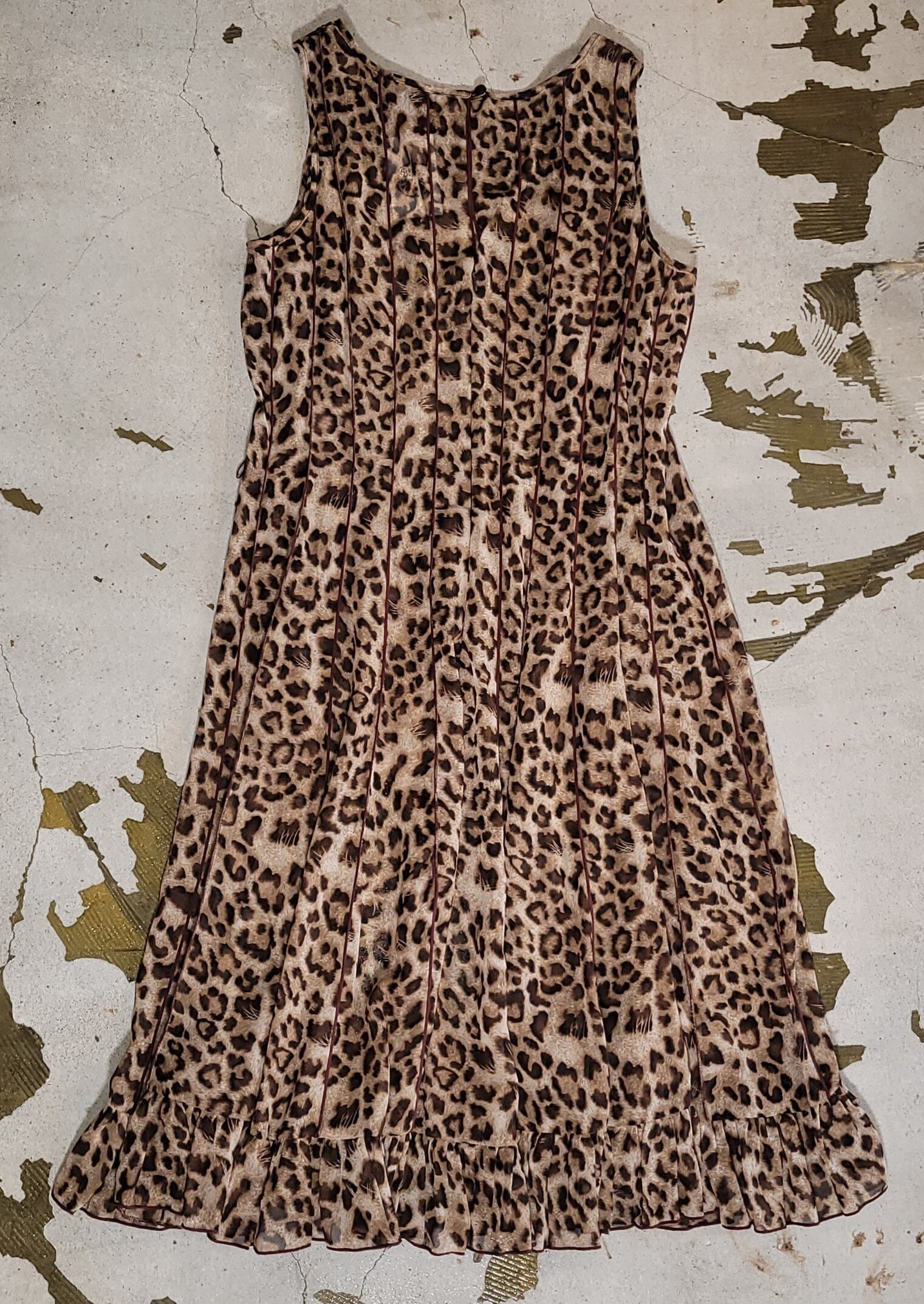 色味は、ブラウン。強気なレオパード柄。でも、本当は弱いときだってあるのよといった雰囲気を醸し出すこの透け感。人間らしくていいじゃないですか。メローステッチや裾野フリルのアクセントも良い。