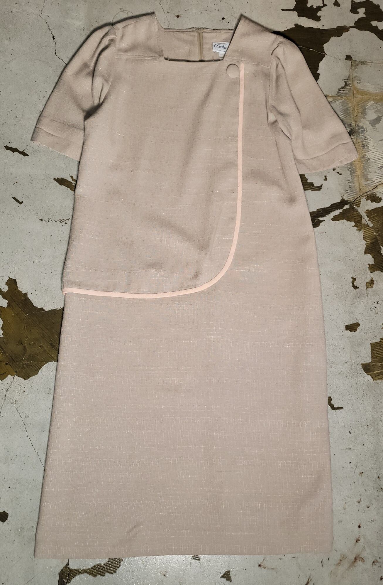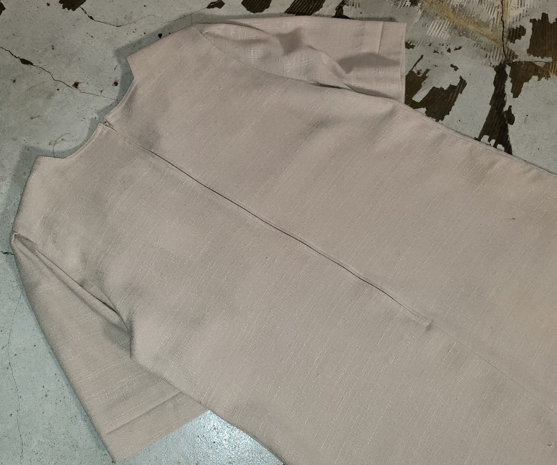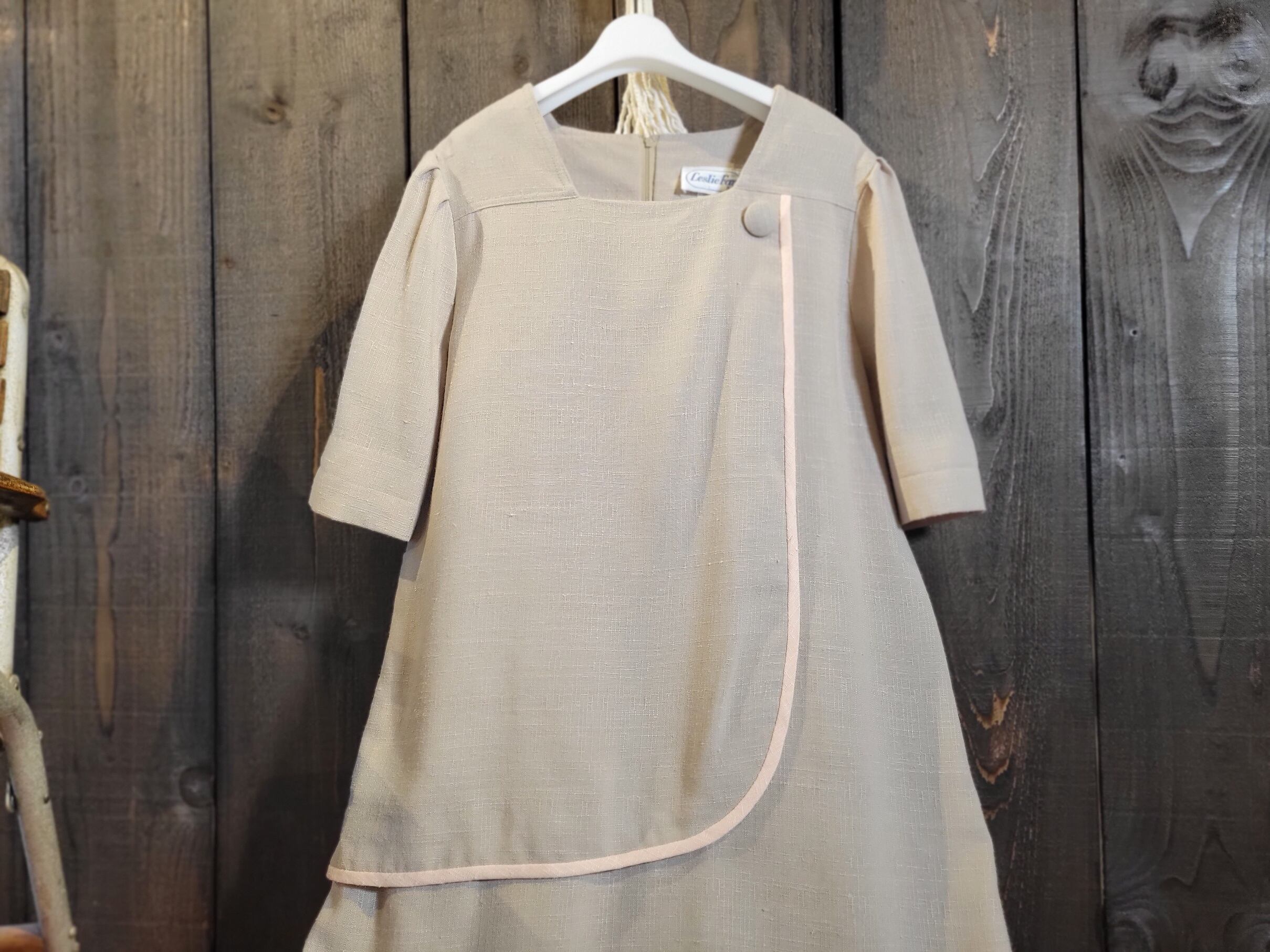 色味は、ベージュ × ピンク。このナチュラルな素材感でシンプル、ピンクのパイピングがされた布がさらりと重なるほんのすこしだけ癖のあるワンピースです。シンプルなのでさらっと着やすく、色味の近い柄のフレアパンツなどとあわせてもかわいいです。
