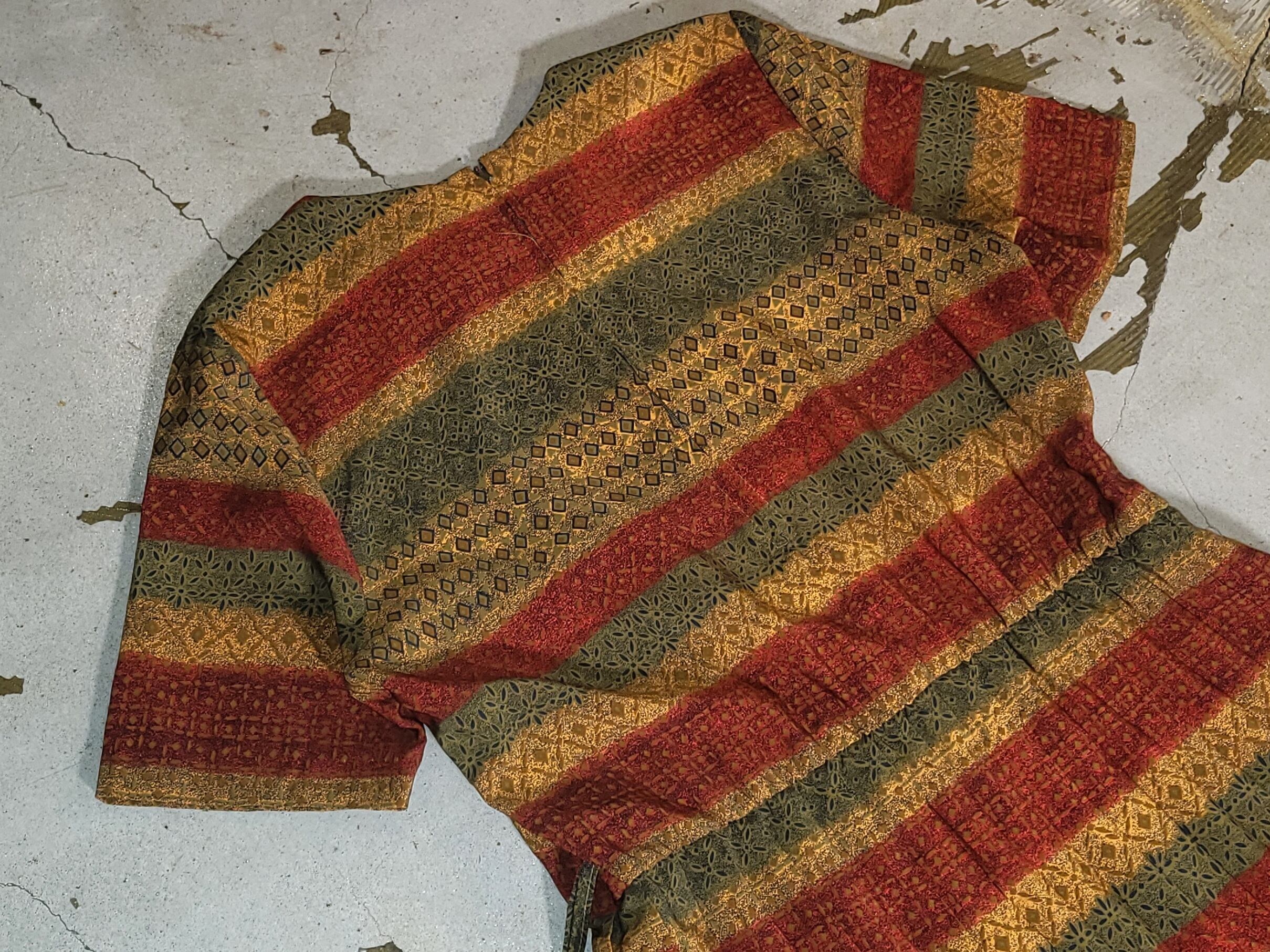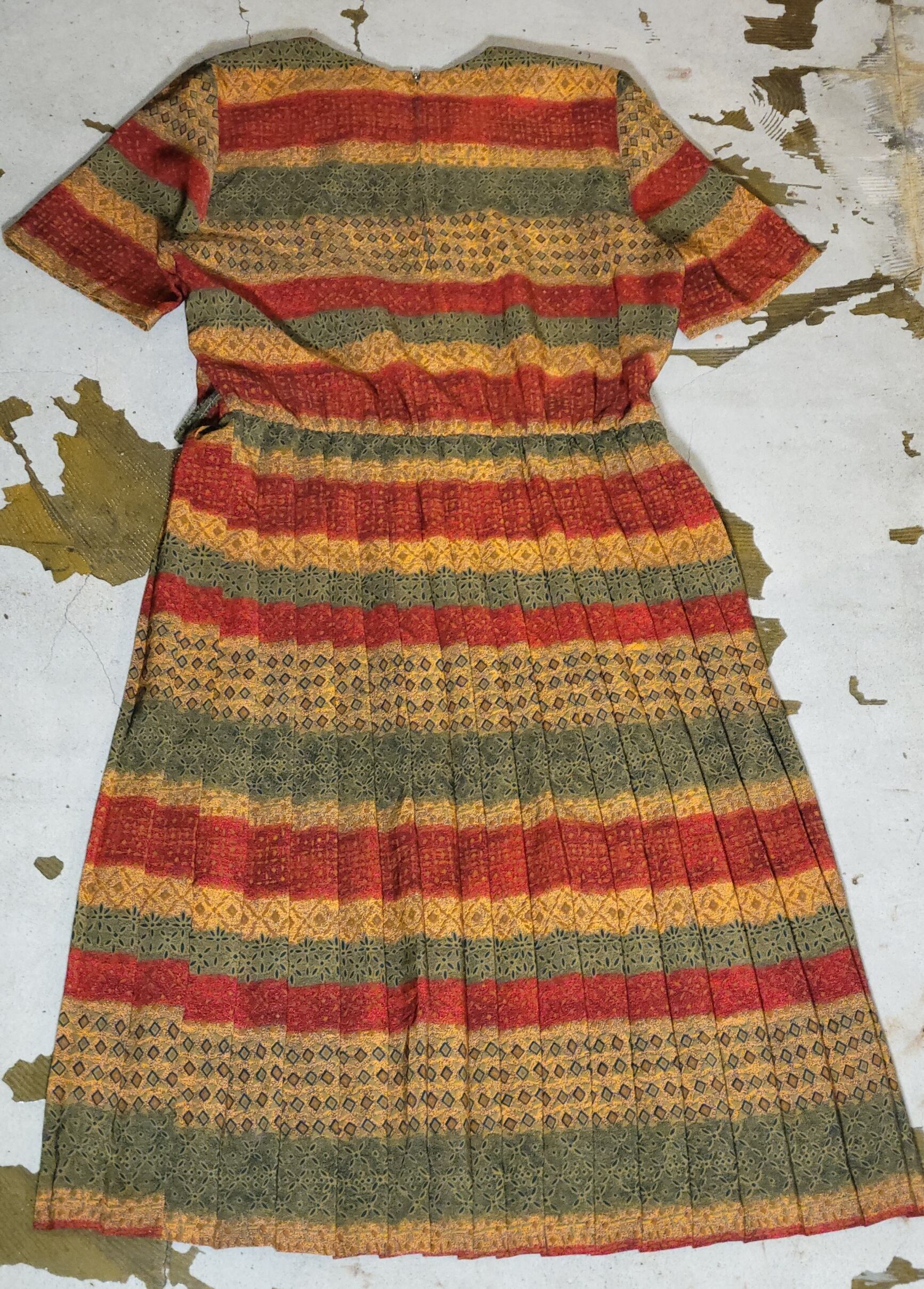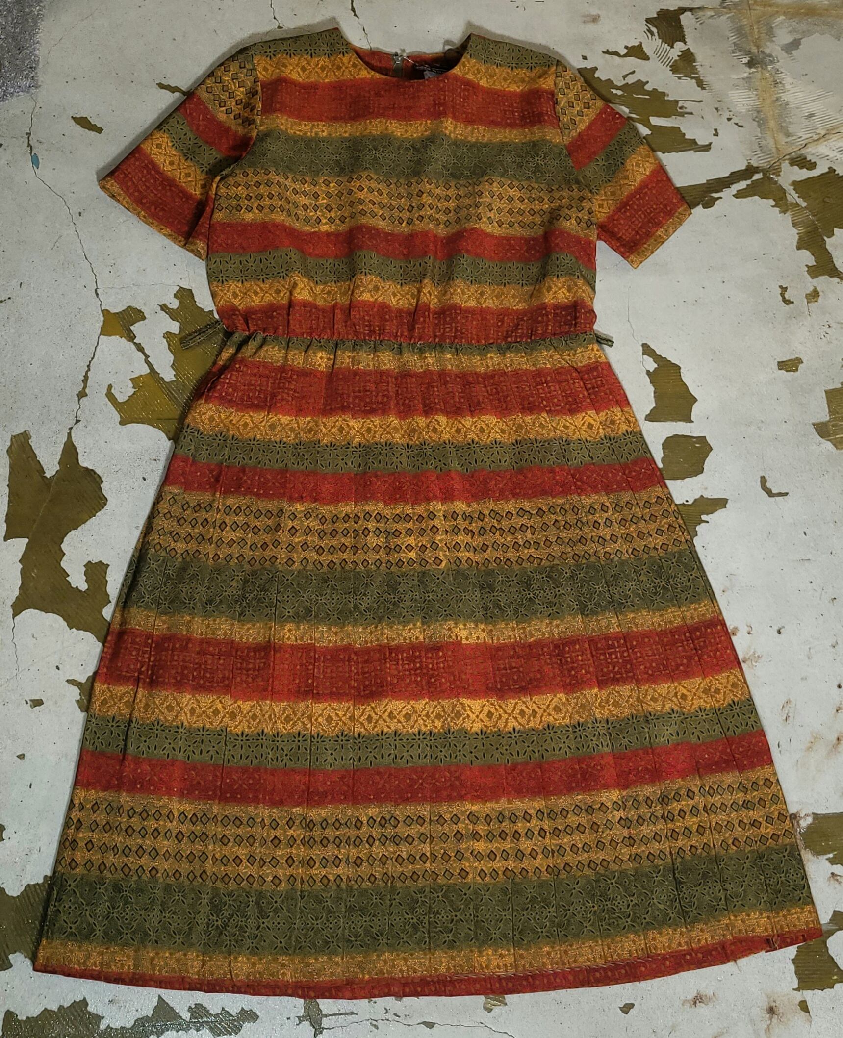 色味は、カーキ × ブラウン × レッド × ブラック × オレンジ。ウエストから切り替えになっているプリーツや、デザイン自体はシンプルな作り。ですが、アースカラーのインパクトのあるテキスタイルの総柄っていうのがなんだか気になる一着です。