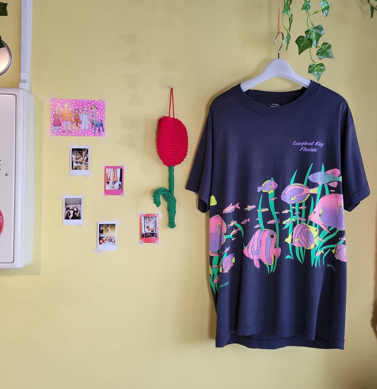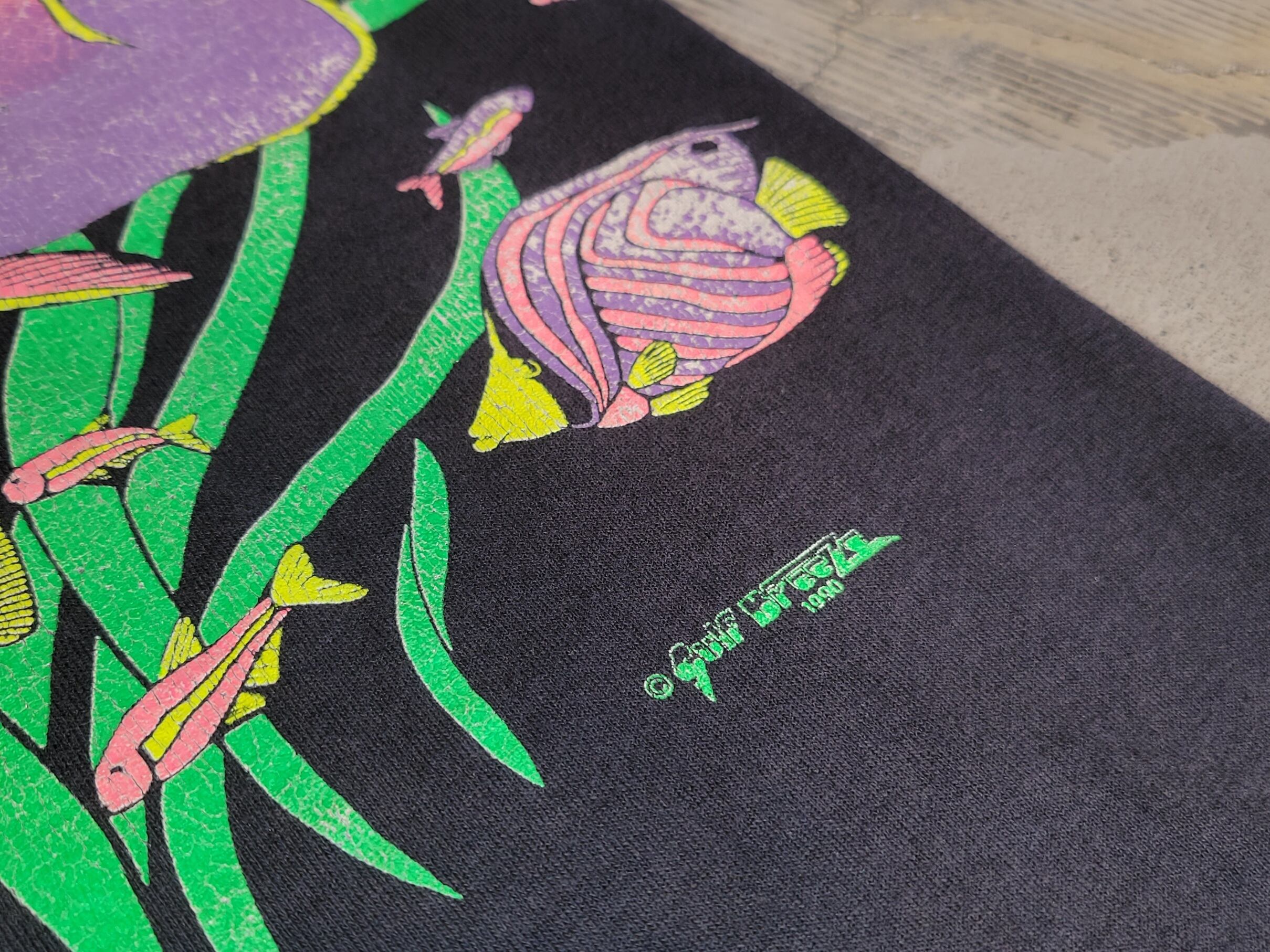 色味は、ブラック × イエロー × ピンク × グリーン ×パープル。優雅に泳ぐお魚さんの群れ。とっても優雅でカラフル。漂う海草もまた乙。海の爽やかな雰囲気を配色で相殺したかっこいい雰囲気がよい。