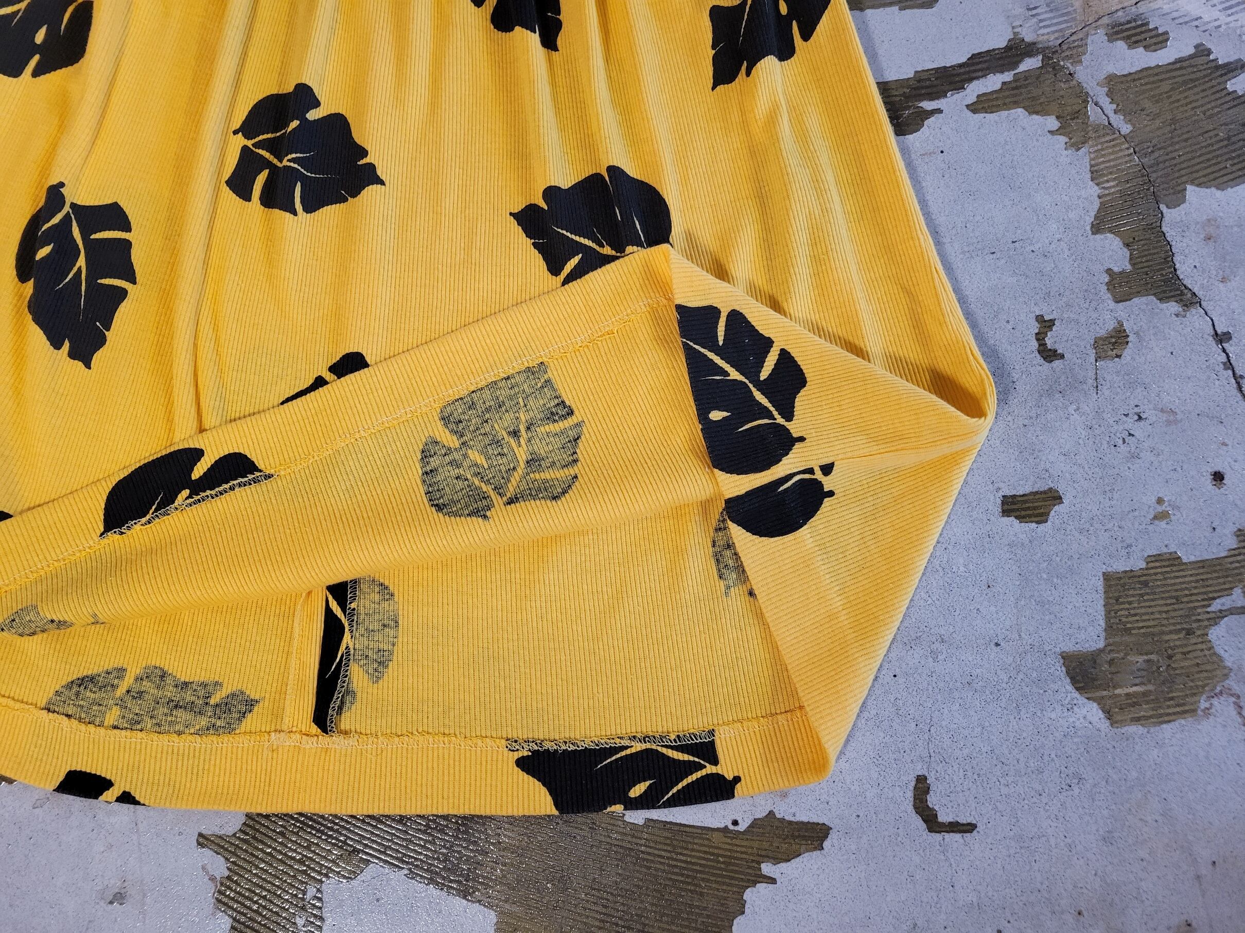 色味は、イエロー × ブラック。大きな南国ちっくな葉っぱの柄は黒く、ベースのイエローとのコントラストが秀逸。細かいリブが入っていてこの柄で、この色。このテキスタイルで伸縮性のあるニット生地。様々なギャップが可愛らしい一着です。