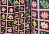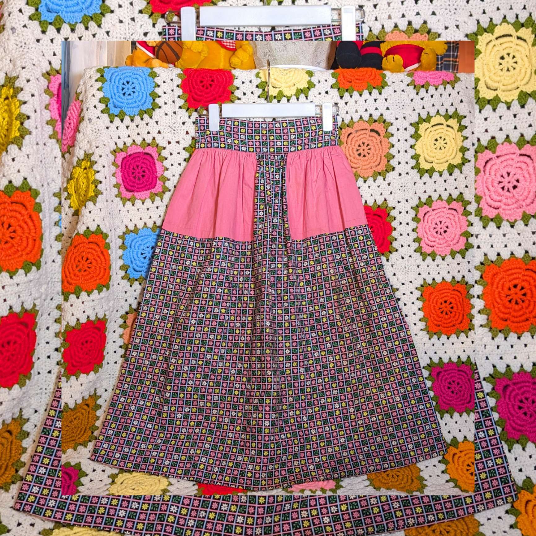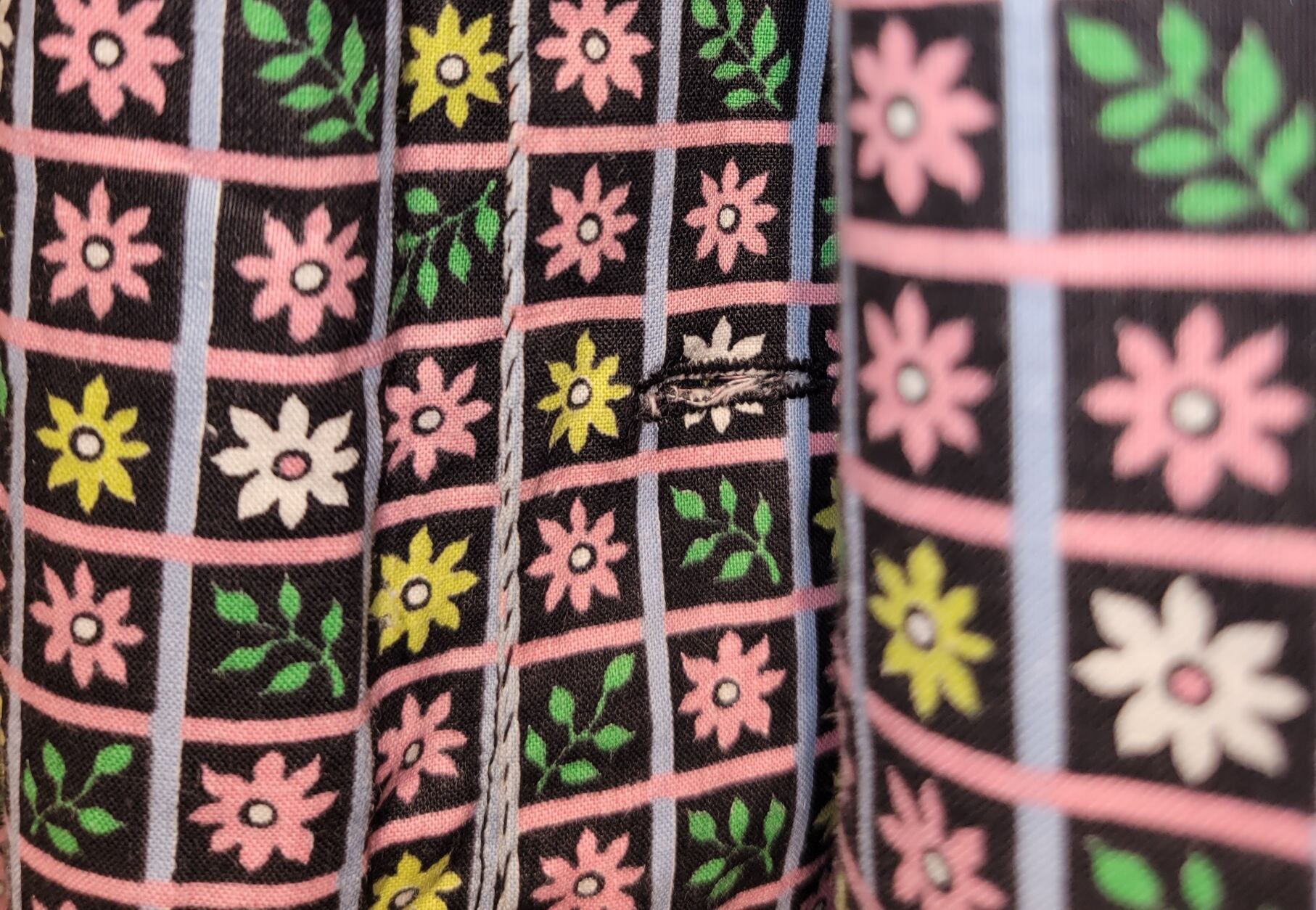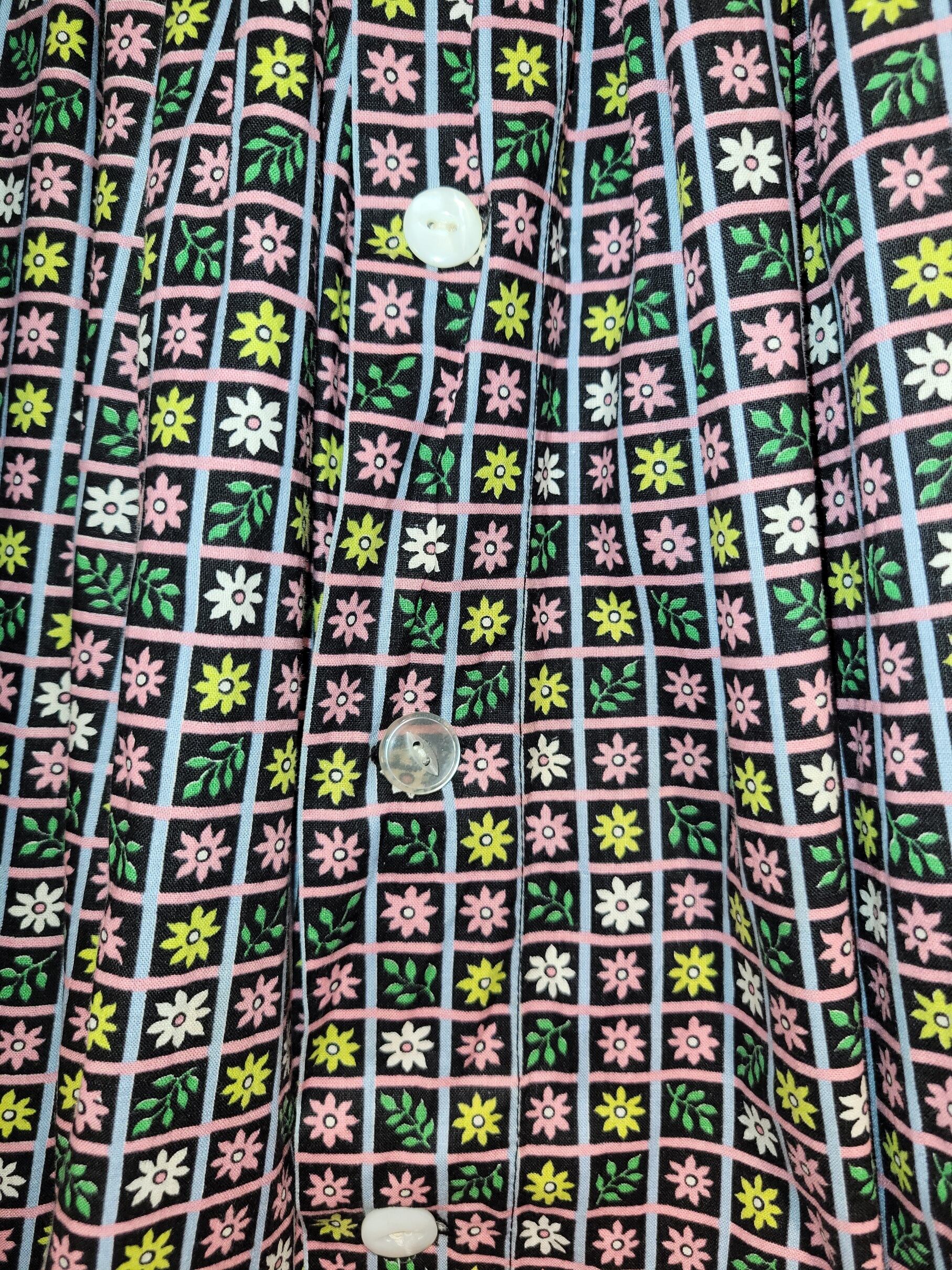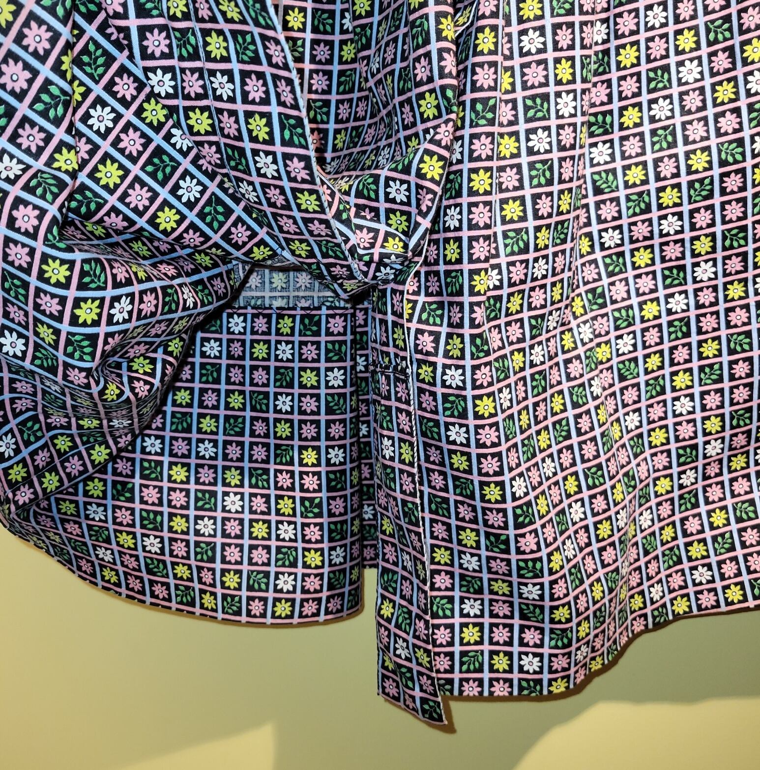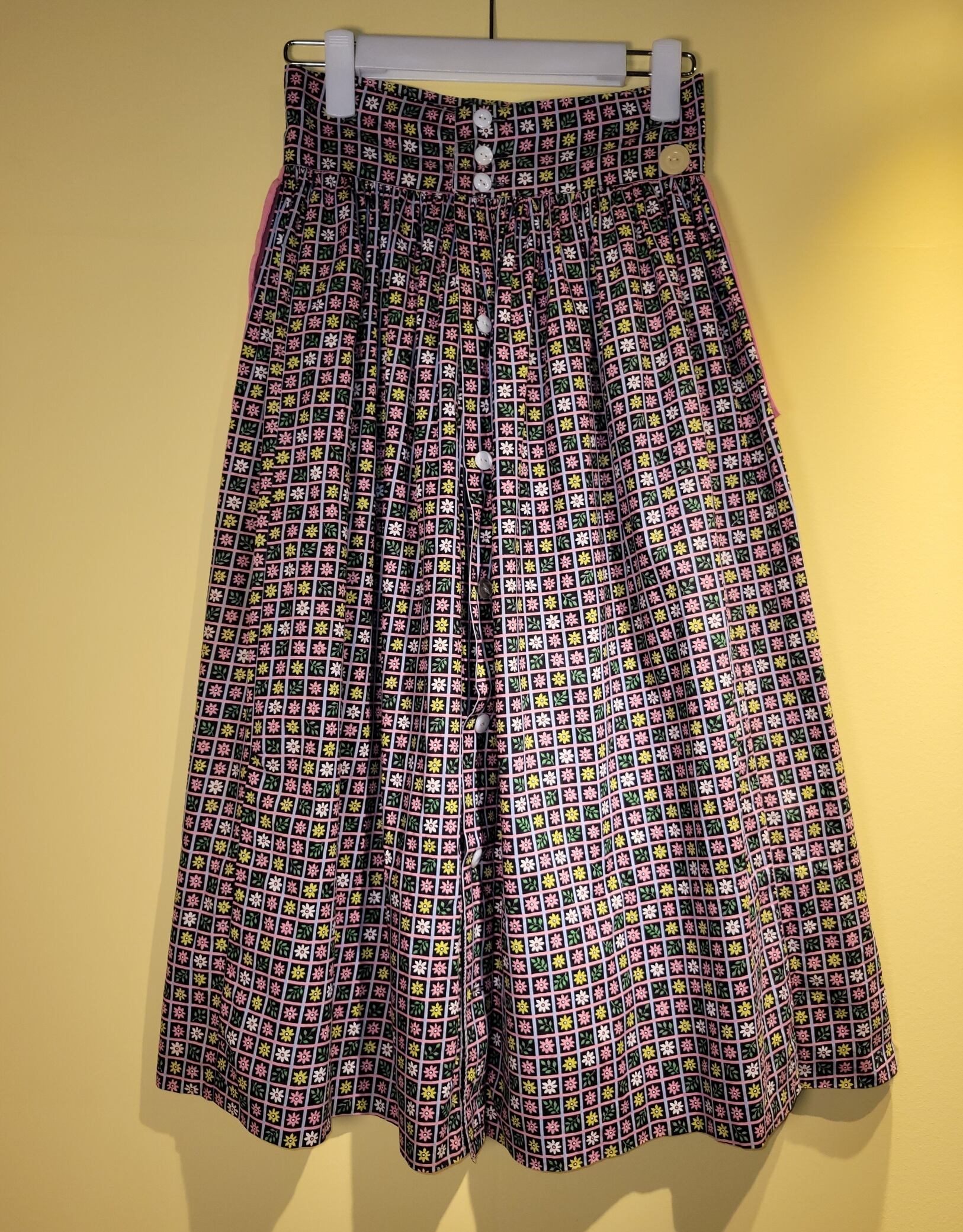 色味は、ブラック × ピンク × グリーン × イエロー × ホワイト × ライトブルー。少女漫画にでも出てきそうな愛らしいテキスタイルと、ポケットのように縫い付けられたピンクの生地が可愛らしい一着です◎