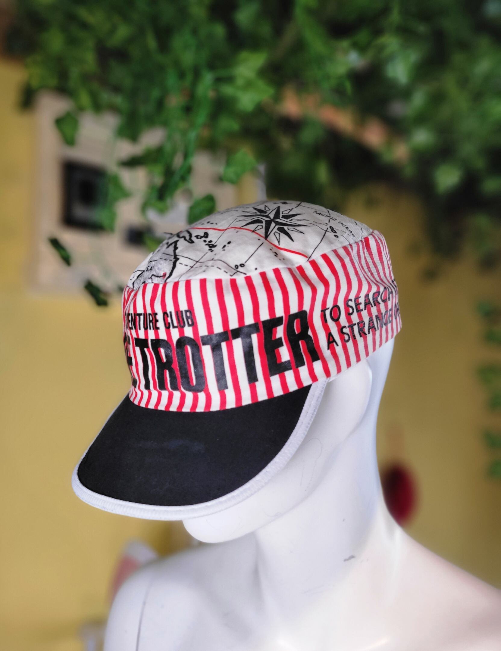 色味は、レッド × ブラック × ホワイト。細かいストライプ柄と頭上に施された地図!コンパクトなつばも魅力。アクセントにもってこいの一点です。