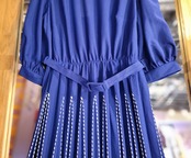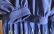 色味は、ネイビー × ホワイト。シンプルなシルエットにあしらわれた胸元のプックりした立体感のあるお花柄がなんだかレトロ。襟元、袖口、プリーツ部分に丁寧に施されたストライプ柄がさりげなく心をグッとつかみます。
