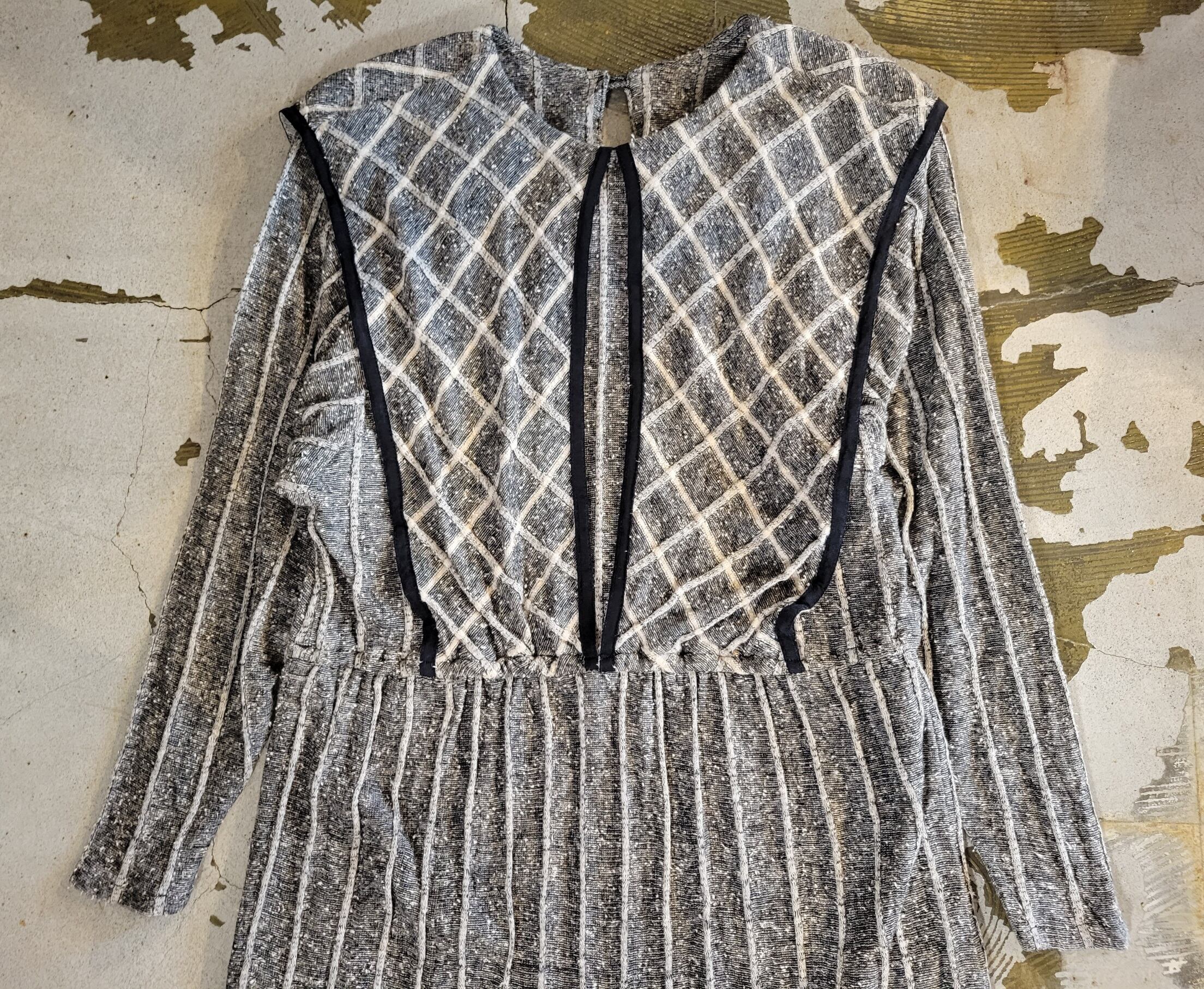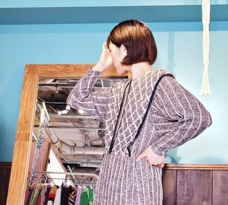 色味は、ブラック × ホワイト × グレー。おとなな雰囲気とパイピングのアクセントが聞いた一着。ドルマンのような袖の作り、揺るっと着られるサイジング。かつきちんと感も残るデザインが魅力。