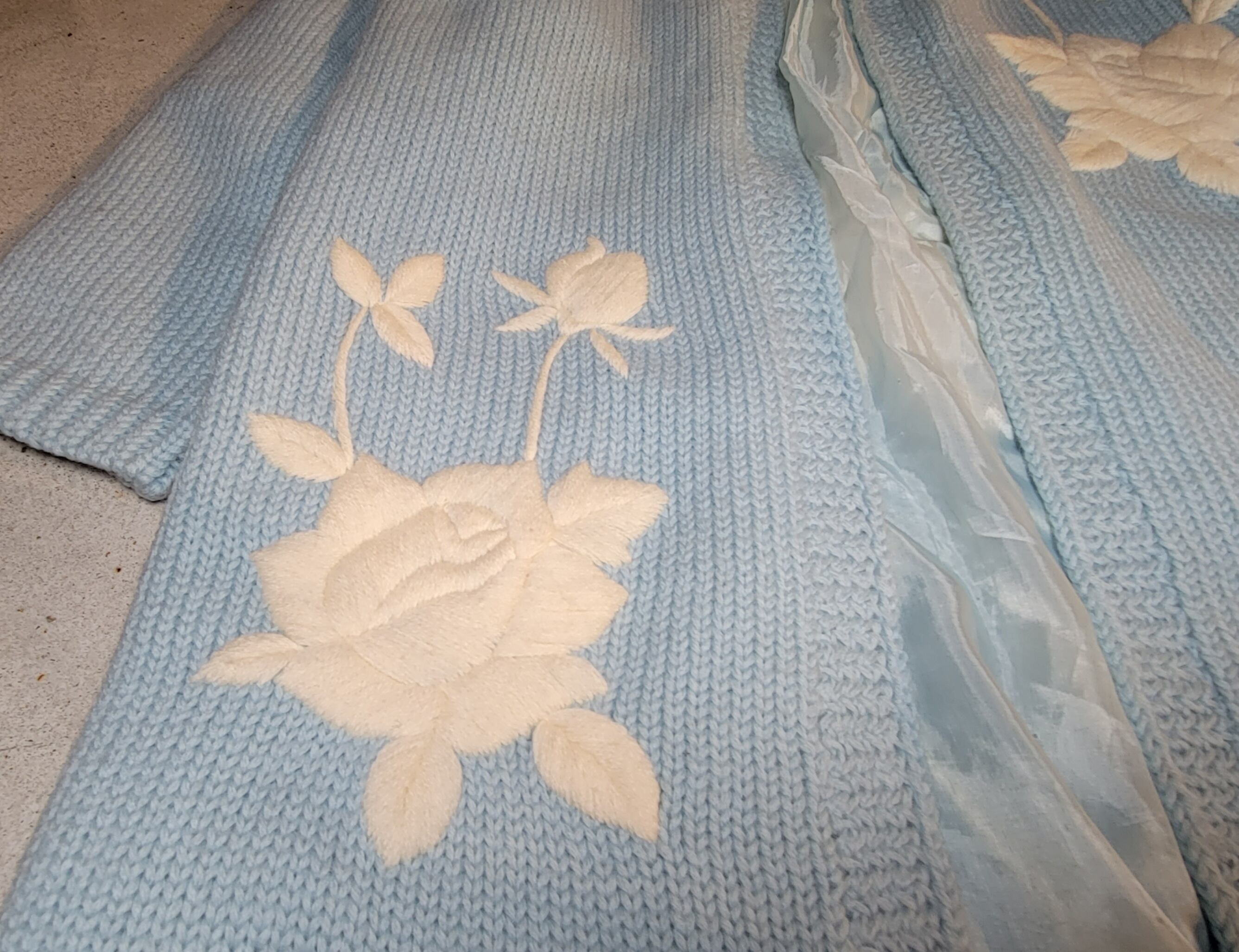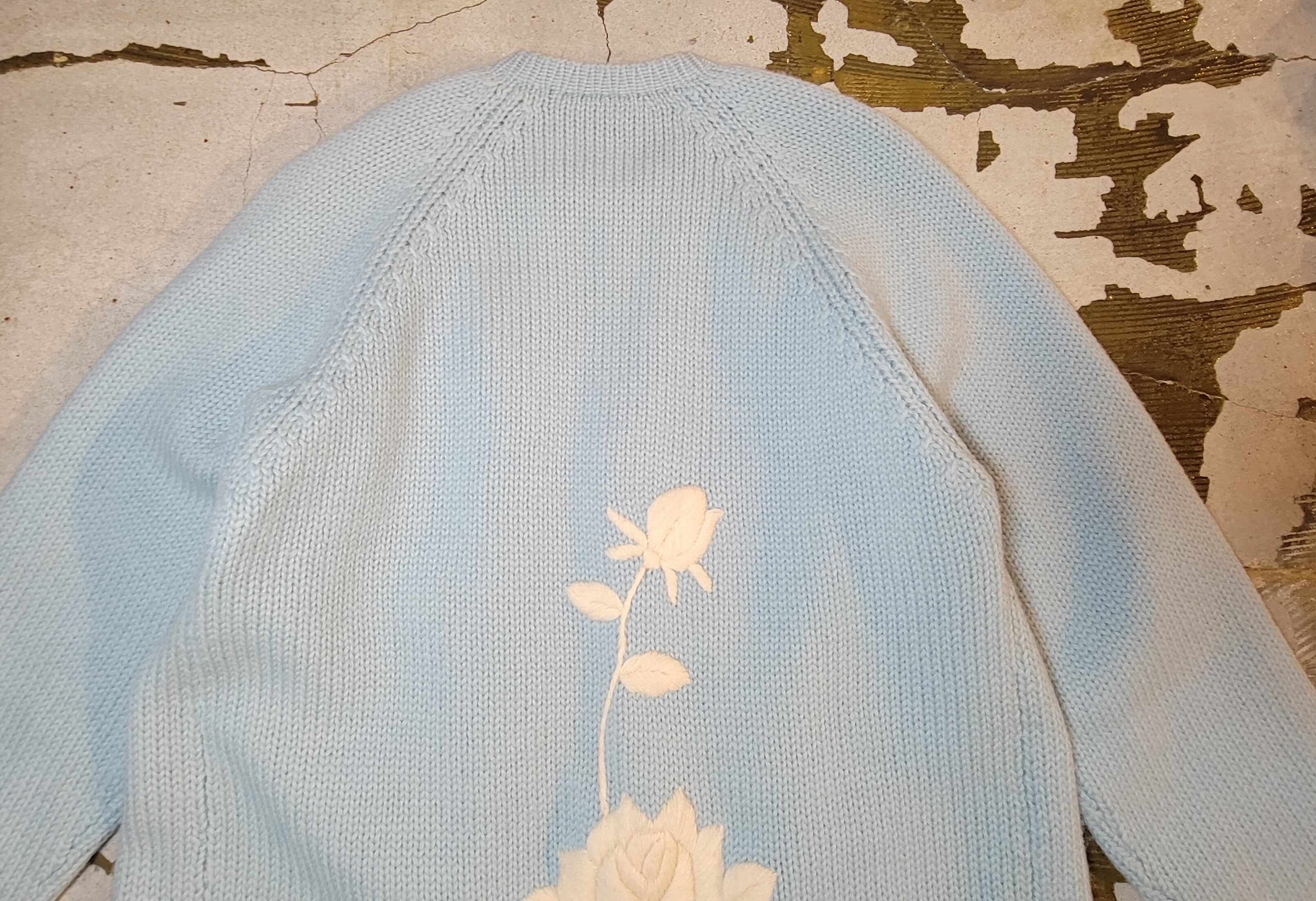 色味は、ライトブルー × ホワイト。澄んだブルーと滑らかな白の配色、刺繍の立体感が合間って、カメオ彫刻のような上品な雰囲気のロングニットカーディガン。ハイゲージのニットに浮かびあがる一針一針丁寧に仕上げられたお花が芸術的。