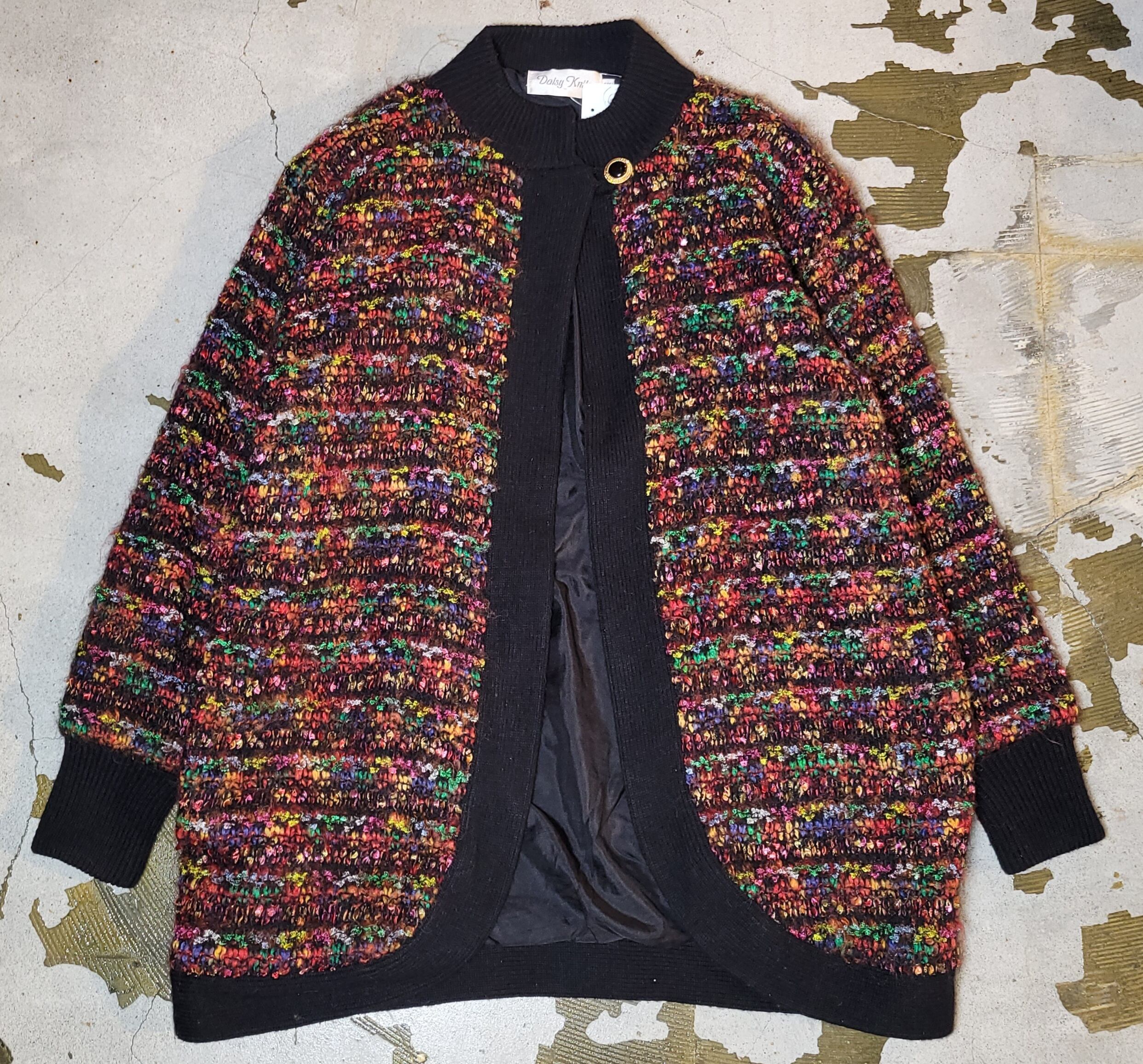 色味は、ブラック × ピンク × グリーン × レッド × イエロー × ブルー × オレンジ。カラフルかつ、様々な素材の糸が沢山編み込まれた見所ある一着。ラウンドしたフロント部分の合わせやもっちりとした襟、袖のリブ、大ぶりなボタンがレトロ。ゆったりしたサイズで、裏地もついているのでアウターとしても◎