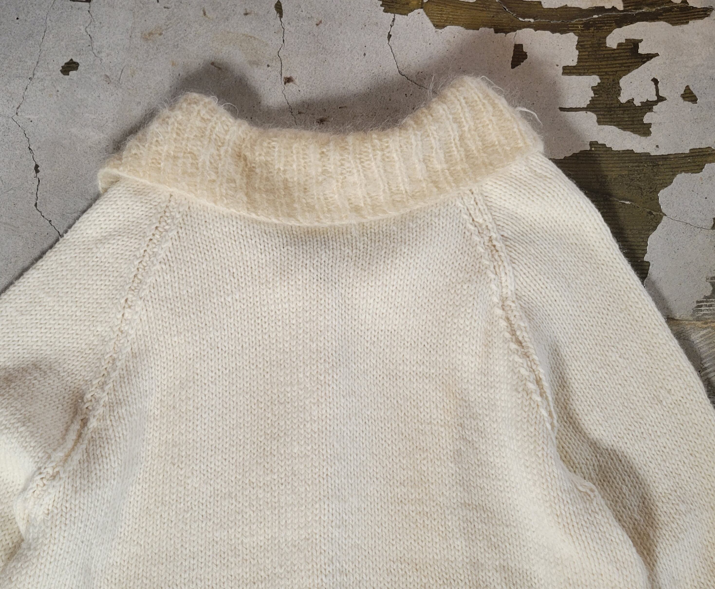 色味は、アイボリー。大きな襟、ガボット着られるサイズ感、暖かみのあるボタン、ちょっぴり小さなポケットが可愛い一着。おそらく、ボディの部分はコットンやアクリル混でもちっと伸縮性のある肌触りのよさも魅力的。