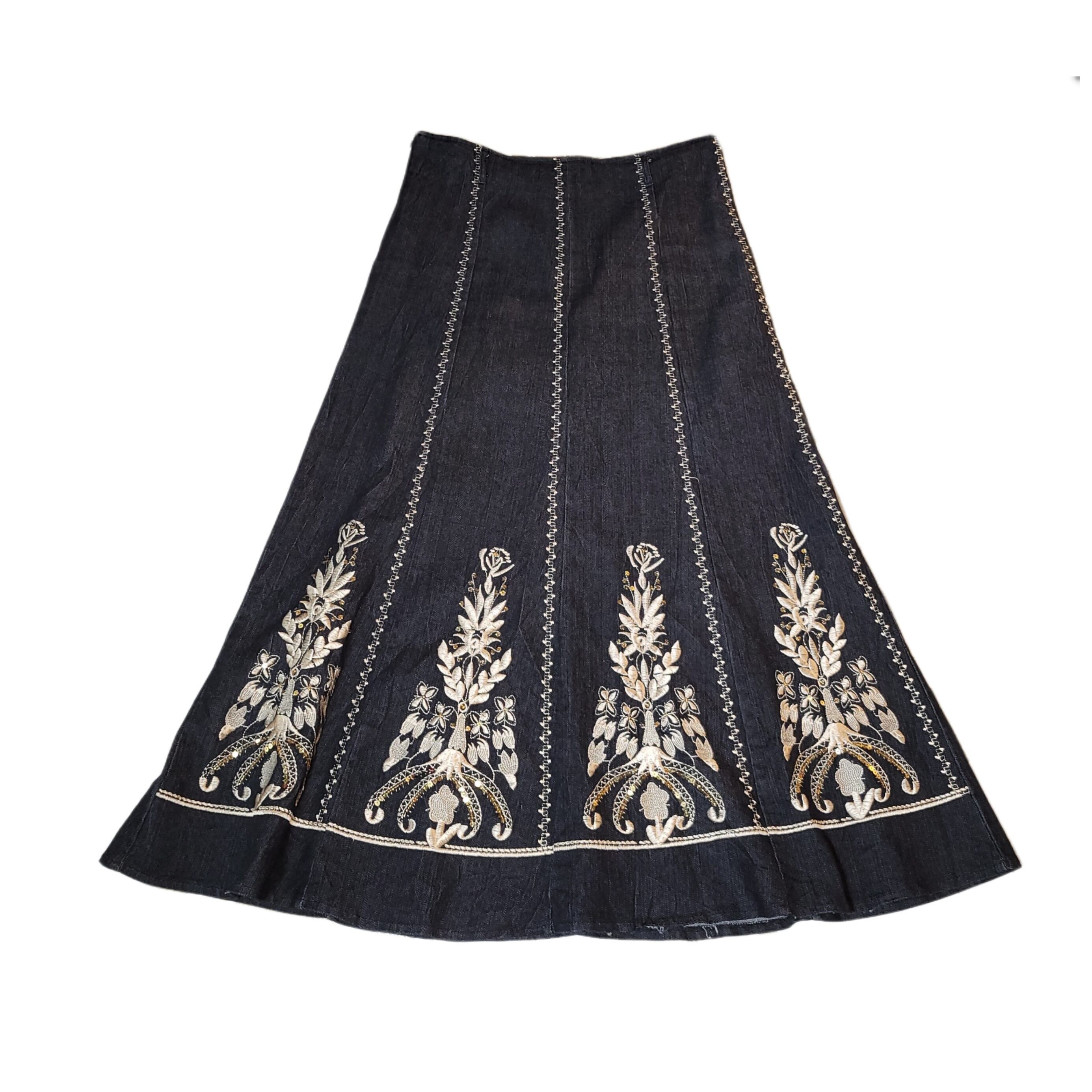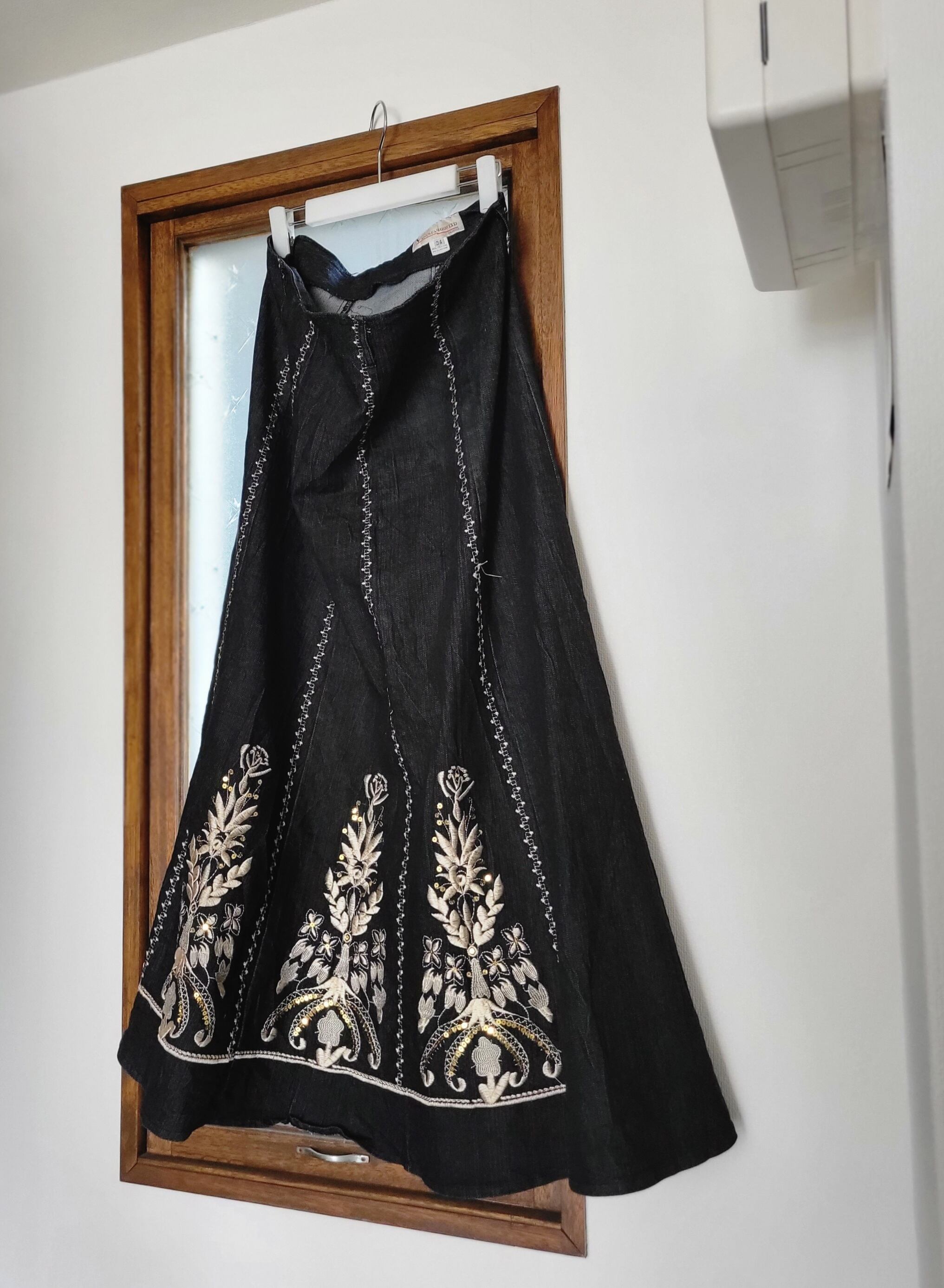 色味は、ブラック × シャンパン × ゴールド。マキシ丈で細かな刺繍と裾の溜まり具合もなんだか可愛いです。今で言うとY2Kなノリ、おいら的にはちょっぴりノスタルジーな感じです。懐かしさに浸るもよし、新鮮さ感じて自由にコーディネートするのもあり。大きめのサイズですが、厚手すぎずベルトループもあるのでギュギュっと締めて着てください。