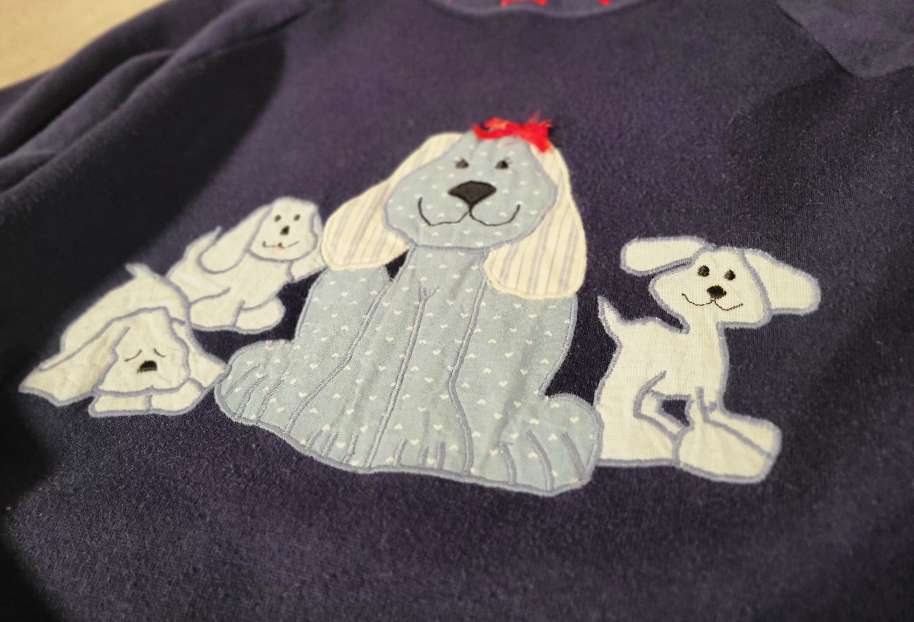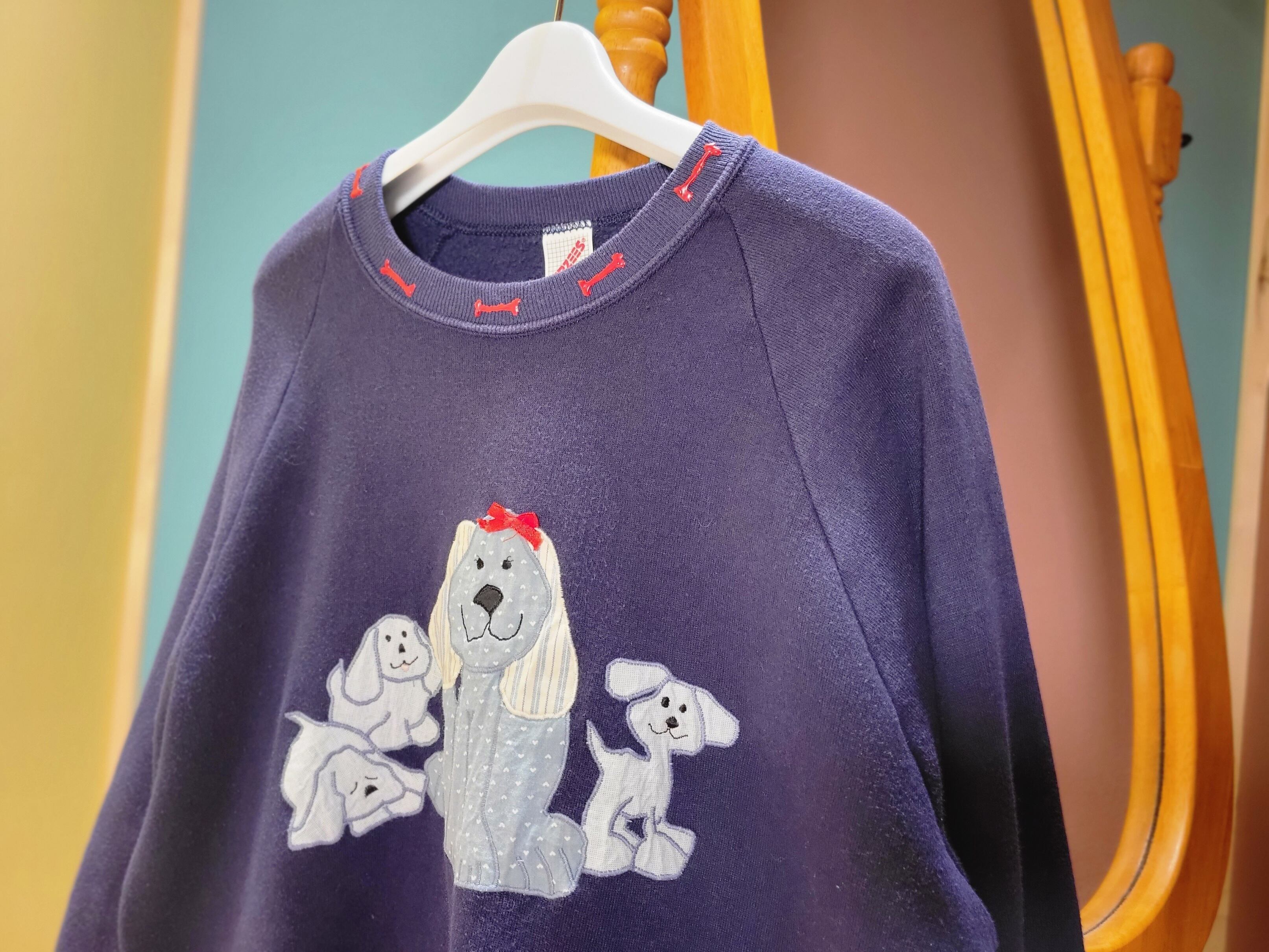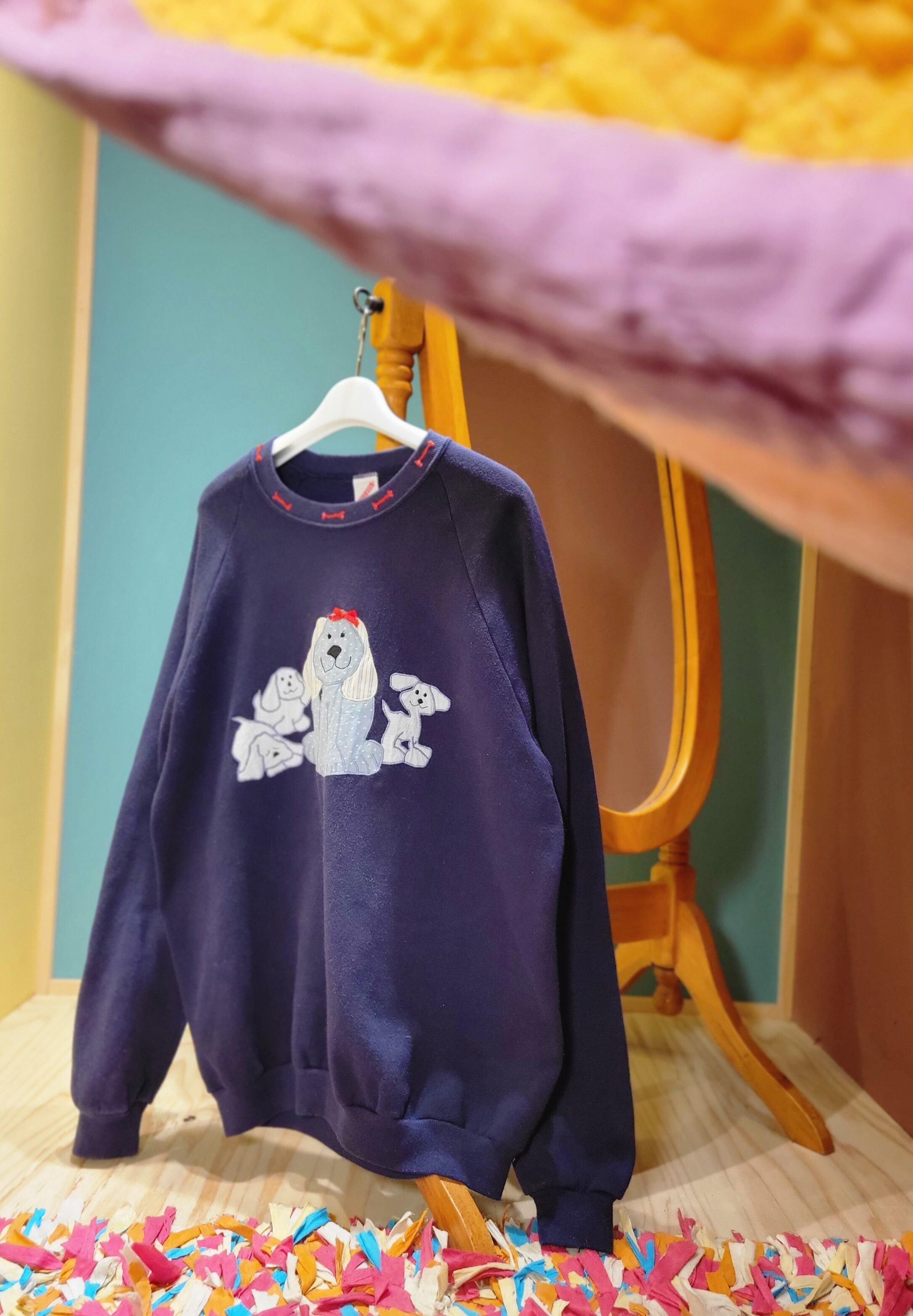 色味は、ネイビー × ライトブルー × ブラック × レッド。リボンをつけてるのはおそらくお母さんなのかな、お行儀よくおっちゃんこ。周りの子犬はんじっとお母さんを見つめたり、ソワソワしたり、スヤスヤしたり。襟元の骨も含めとってもキュンとくる一着。