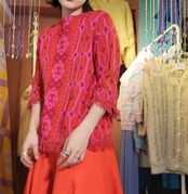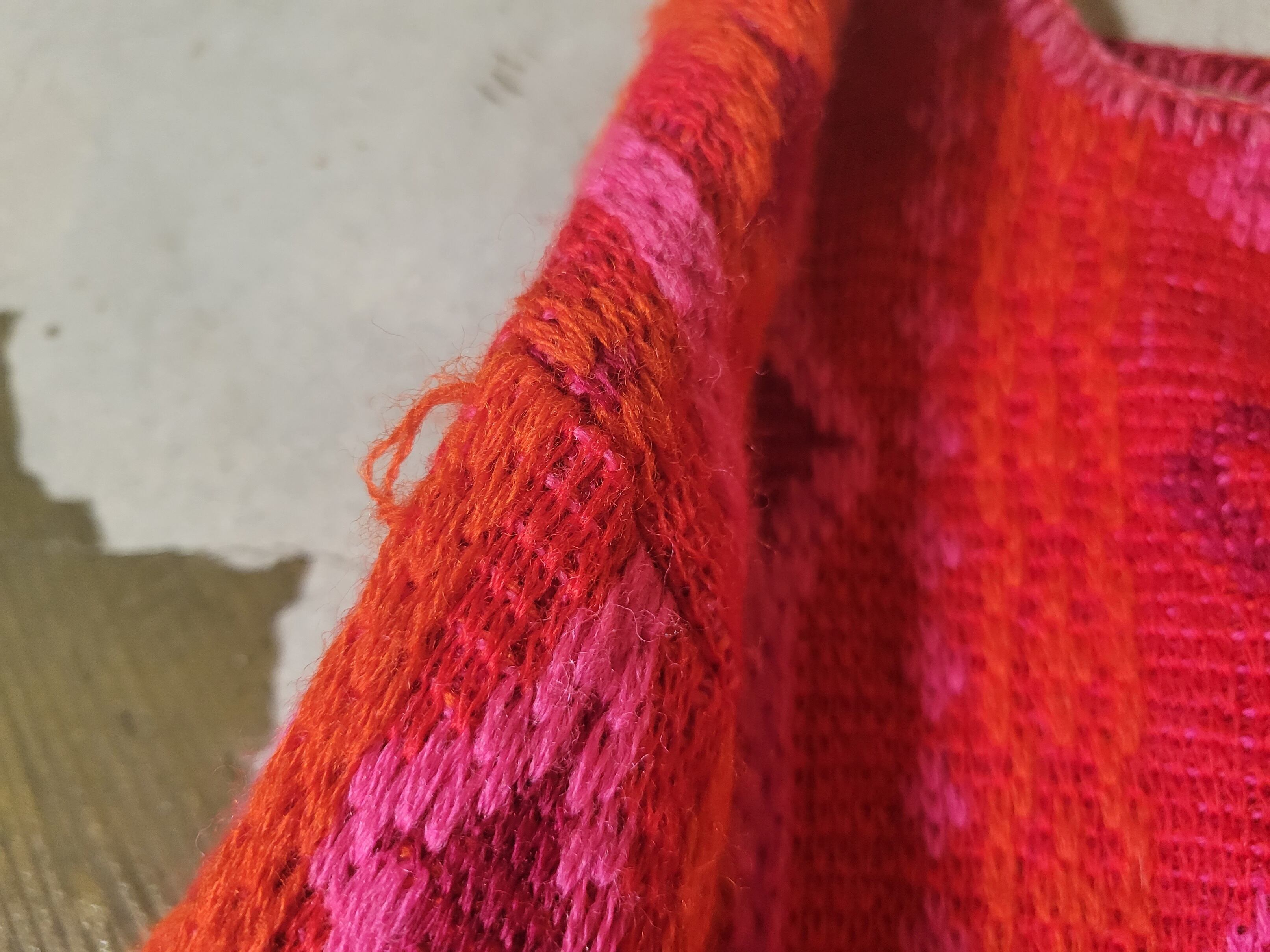 色味は、レッド × オレンジ × ピンク。総柄の編みと、暖かみのあるカラーリングが魅力的。コンパクトなサイズ感、袖口と裾のフリンジがとってもかわいいです。