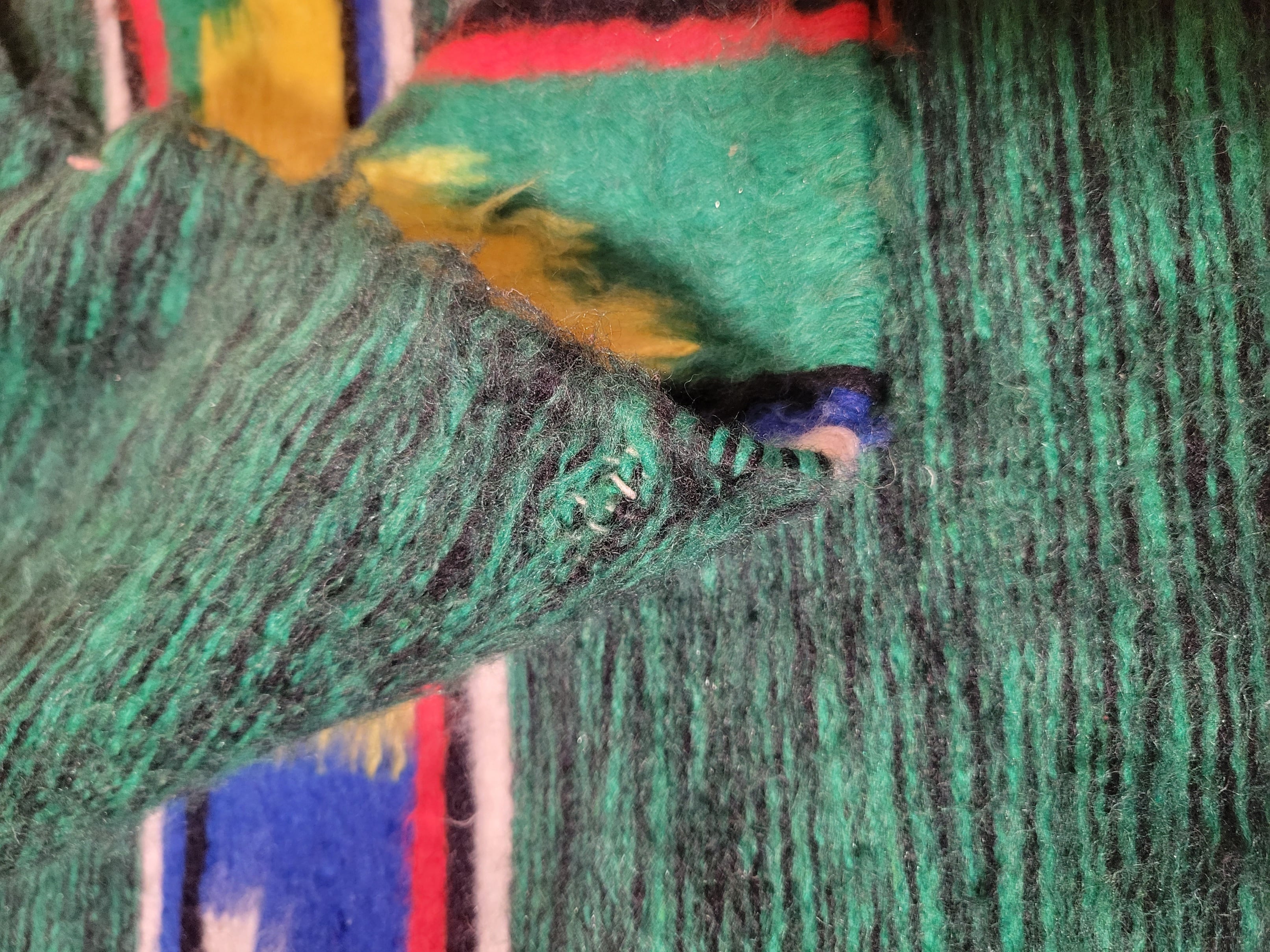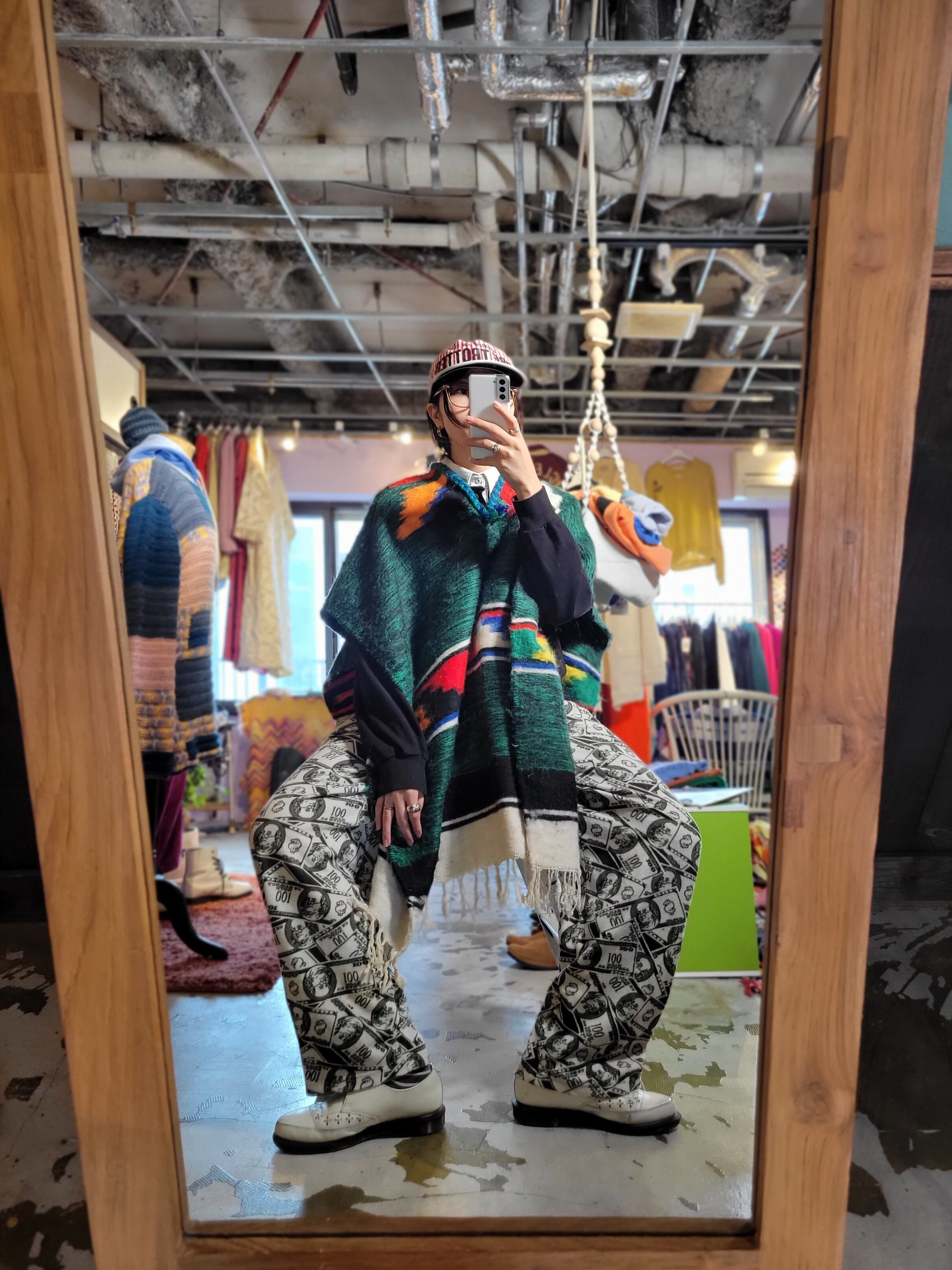 色味は、グリーン × レッド × ブルー × イエロー × ブラック × オレンジ × ホワイト。異国かんたっぷりなラグベスト。メキパのような素材感のものとはまた違い、毛足が長くふわふわとしたさわり心地。鮮やかなカラーリング、フリンジや首もとのデザインも魅力的。