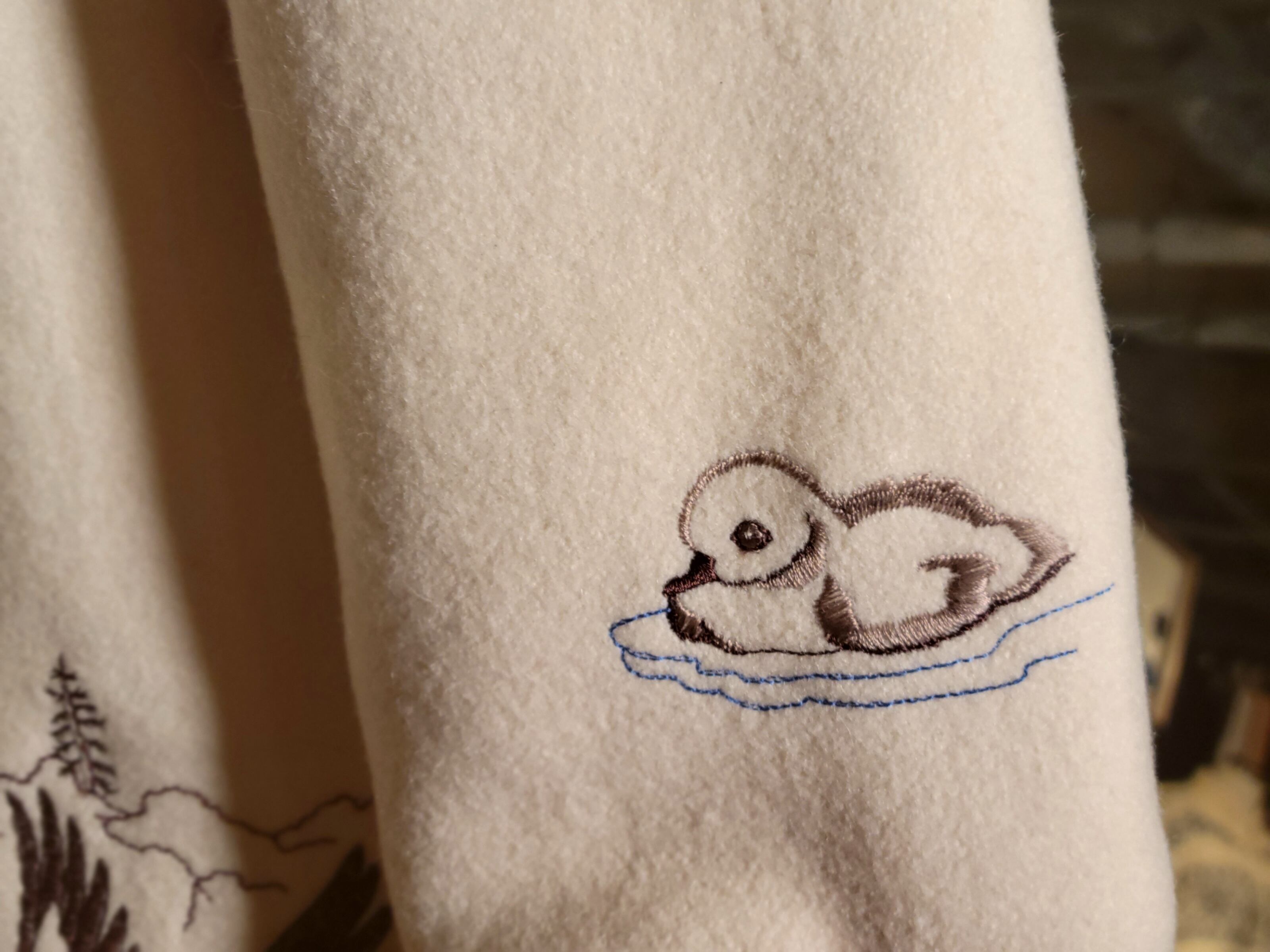 色味は、アイボリー × ブラウン × ブルー × レッド。釣りを楽しむ人々と鳥さんたちの刺繍が豪華。使い勝手の良い柔らかいカラーリングとお尻まですっぽり隠れるサイズ感。裏地はキルティングでもちろんしっかりと暖かい。上下のダブルジップ、内側のひもで若干のシルエット調節も可能。