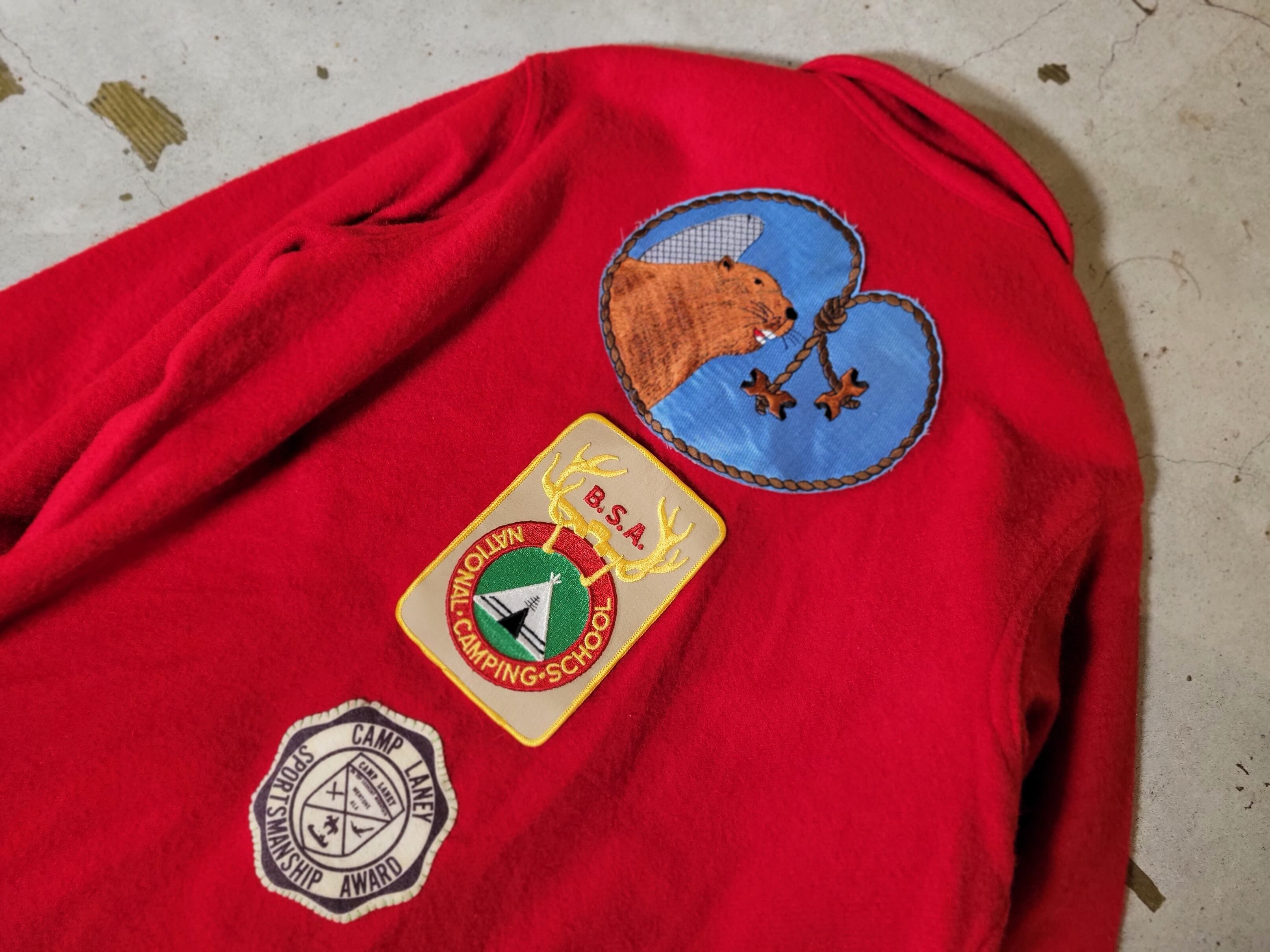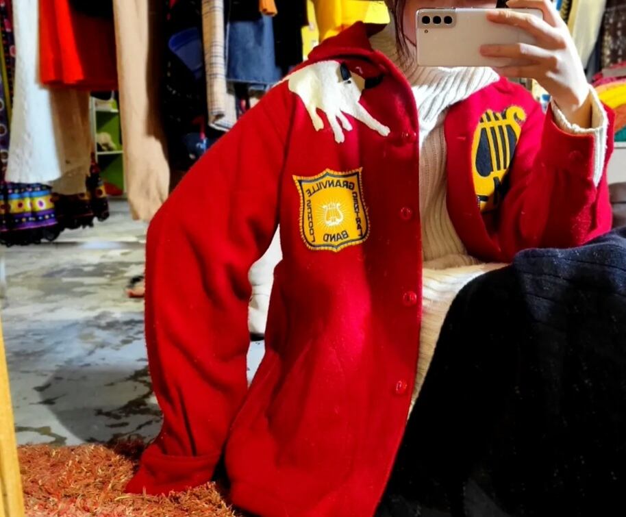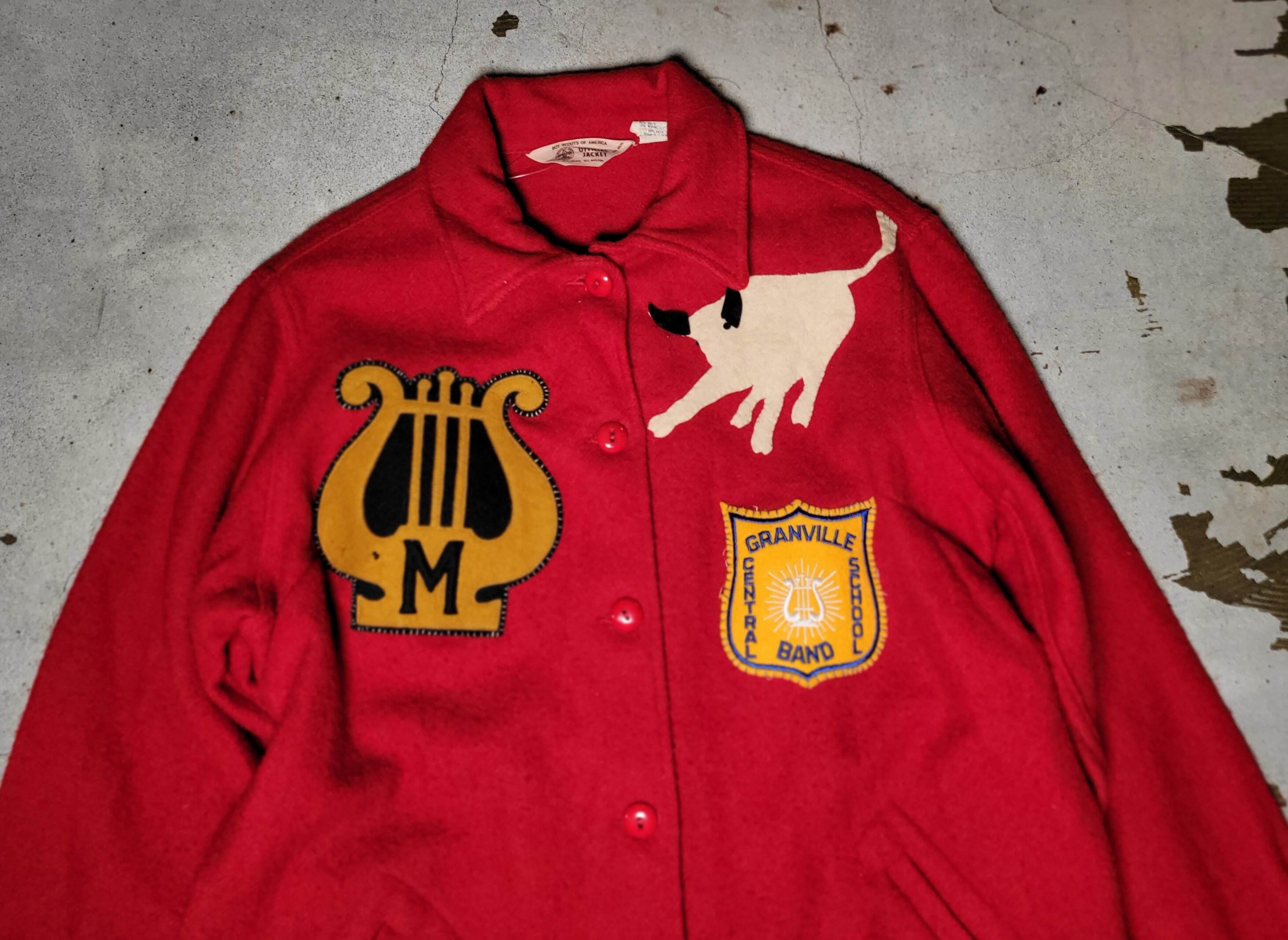 色味は、レッド × ホワイト × ブラック × イエロー × ブルー × ブラウン。ウールのしっかりとした生地感はもちろんのこと、大きなワッペンがバランスよく配置されており、とっても無邪気な雰囲気が魅力的です。