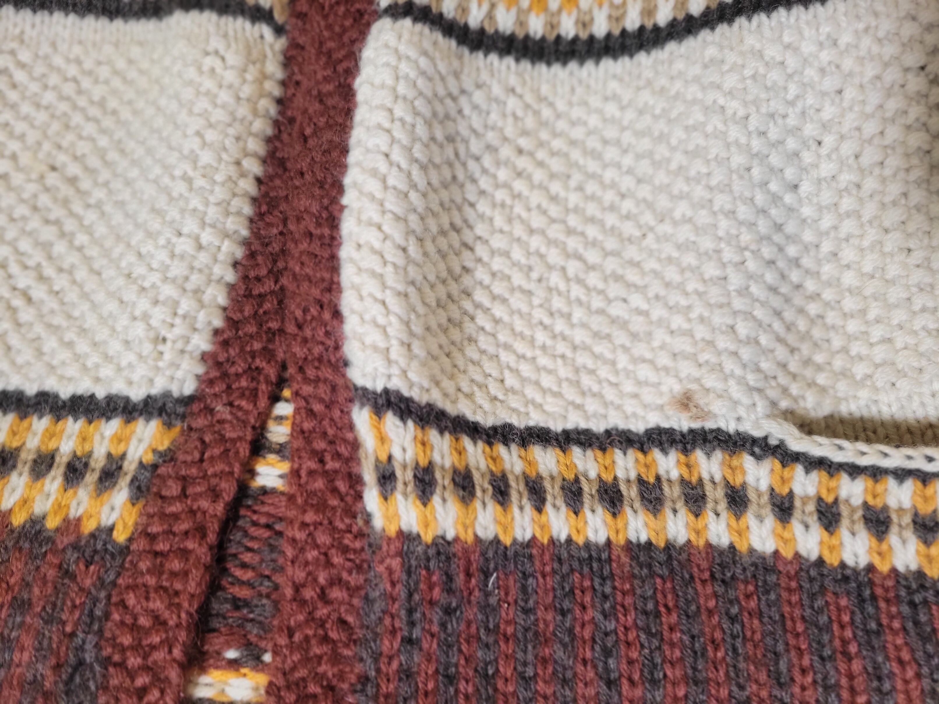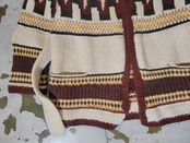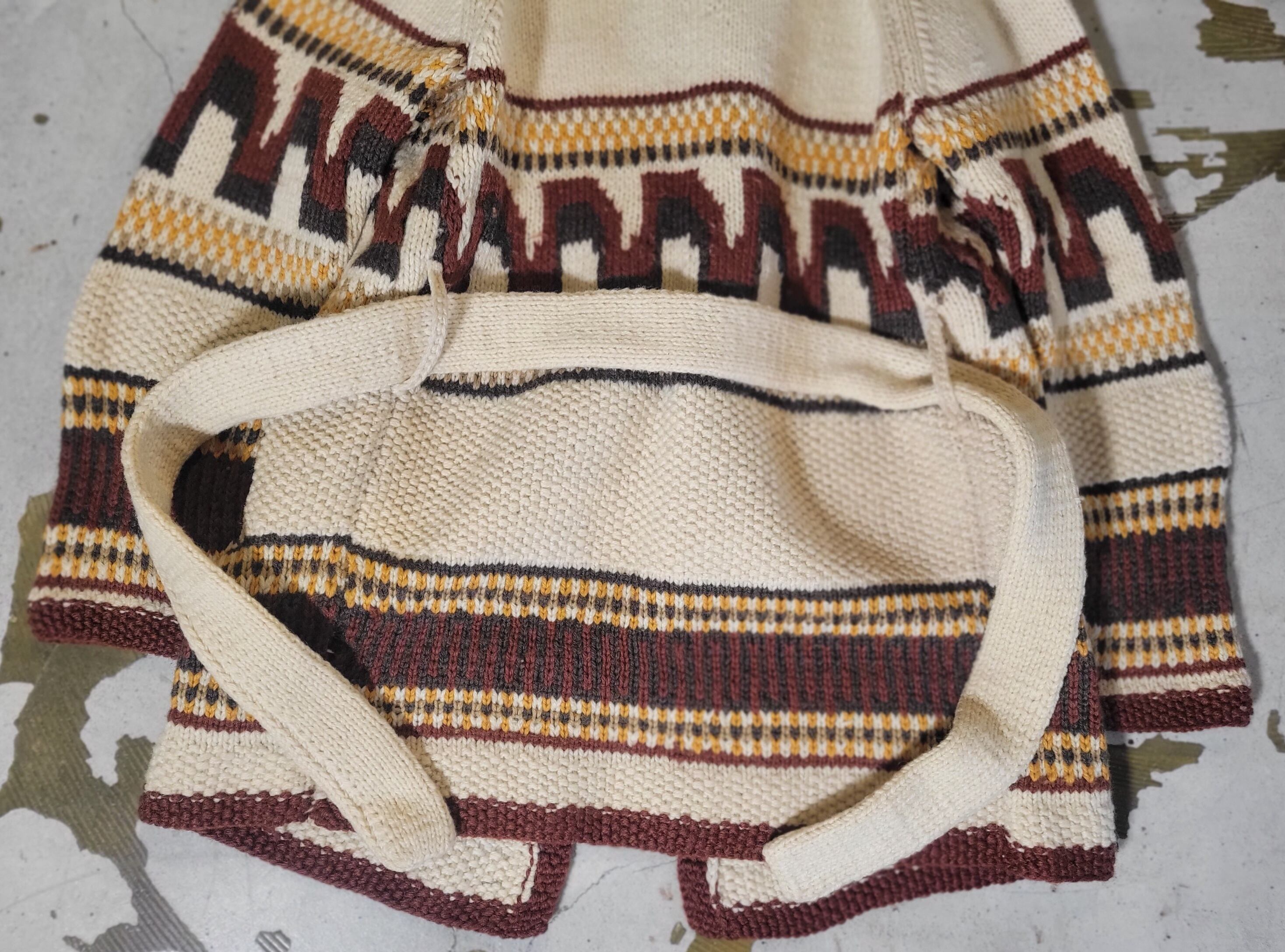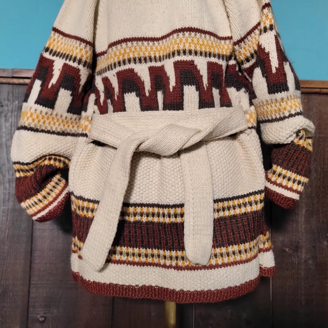 色味は、ベージュ × ブラウン × イエロー。もっちりとした厚み、ガバッと羽織れるサイジング。ボタン等がないのでパッと着やすいのもポイント。小降りなショールカラーとガウンのようなデザインが大人っぽい雰囲気で◎