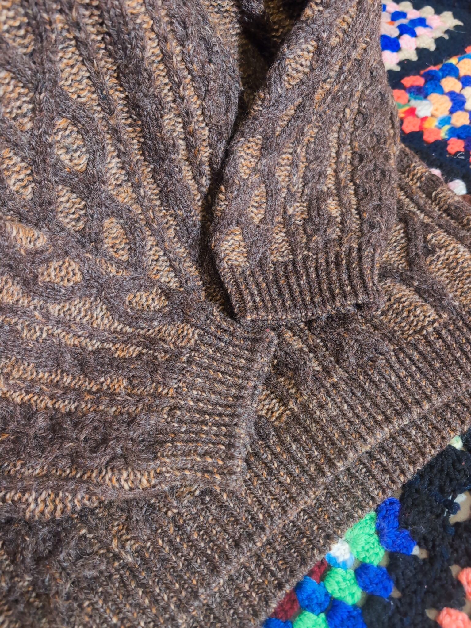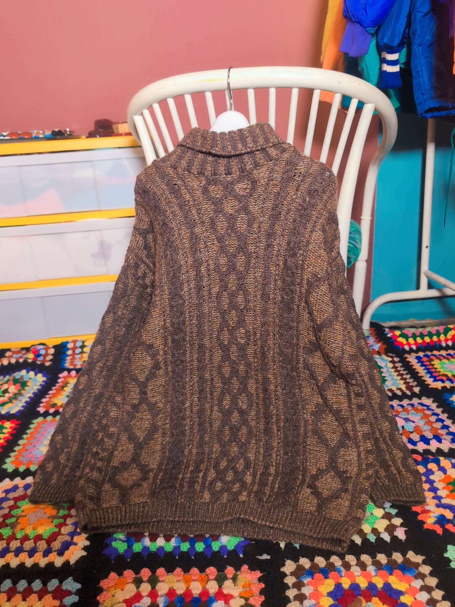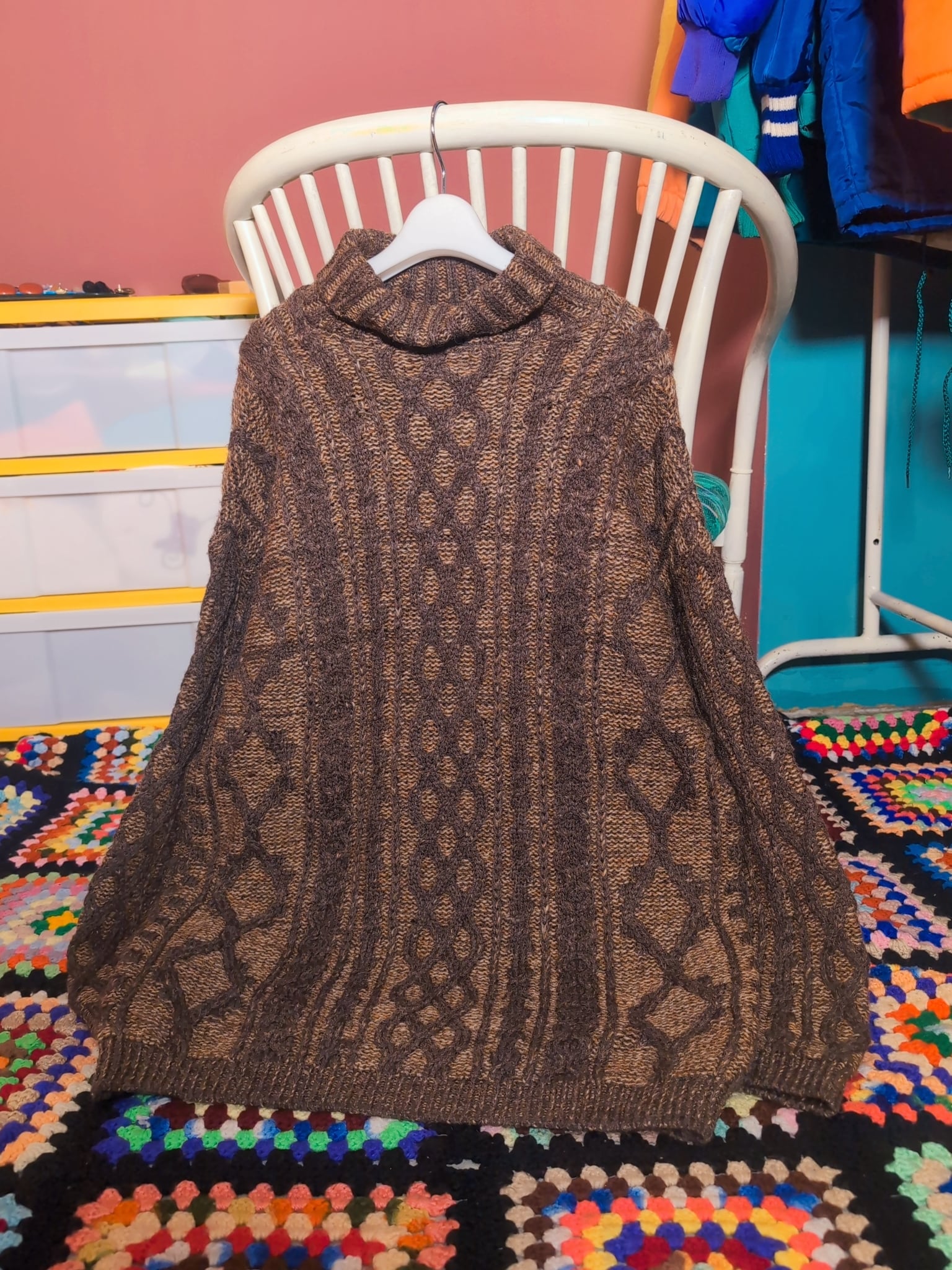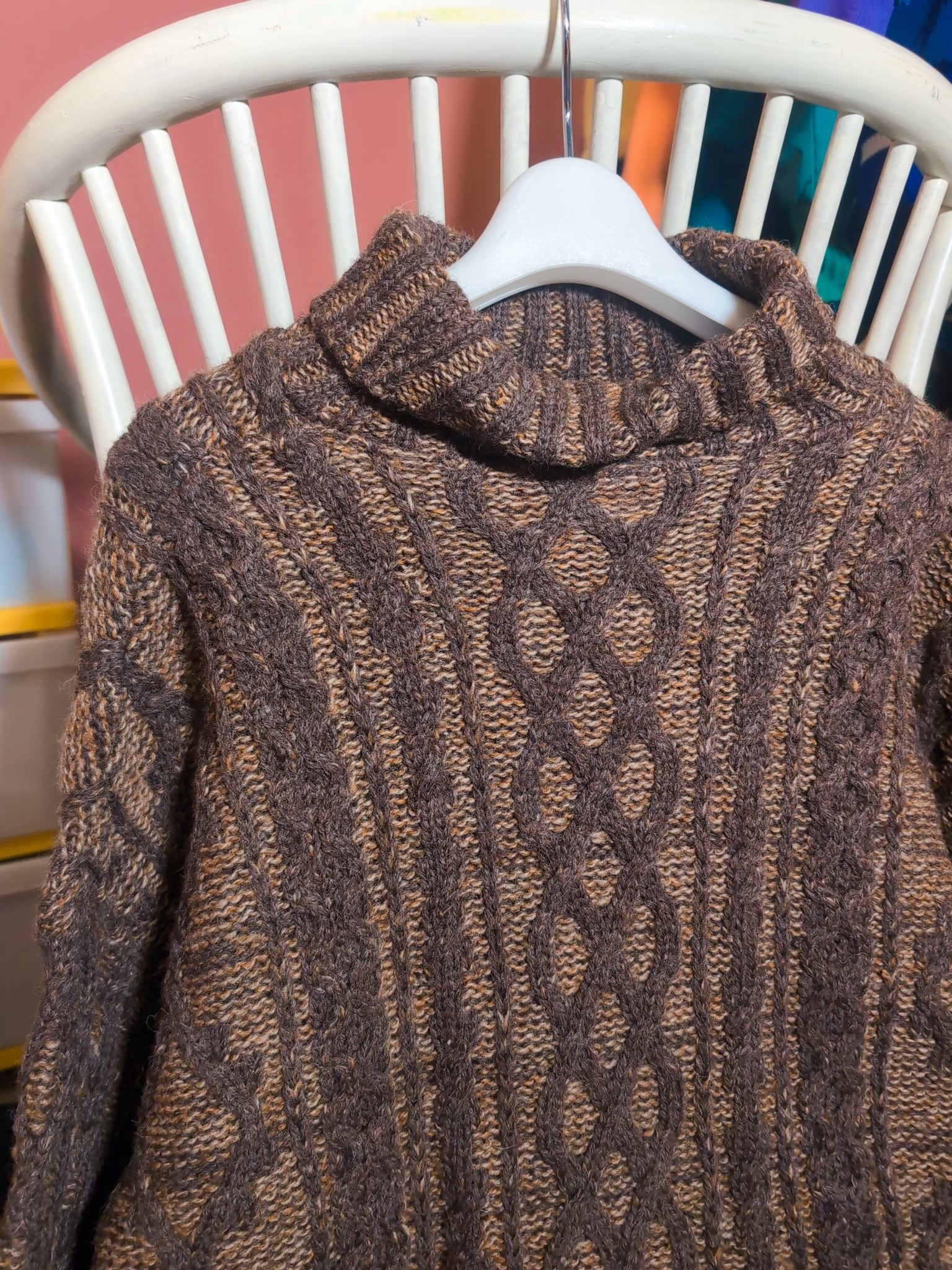 色味は、ブラウン。立体感のある編みと揺るっとしたサイズ感、高さのある襟元が魅力的。小柄な方であればワンピースのようにも着られます。