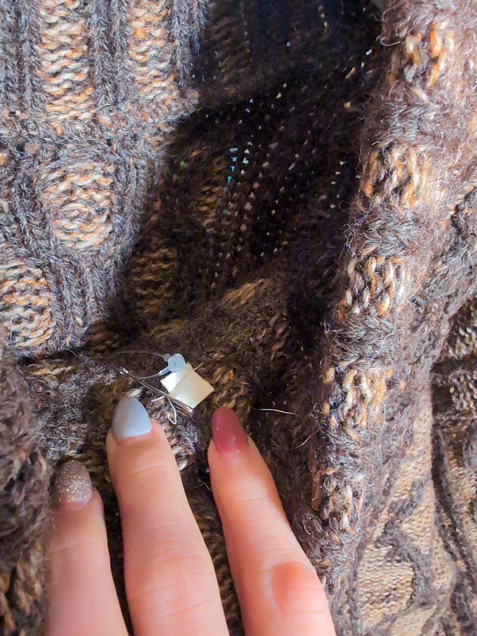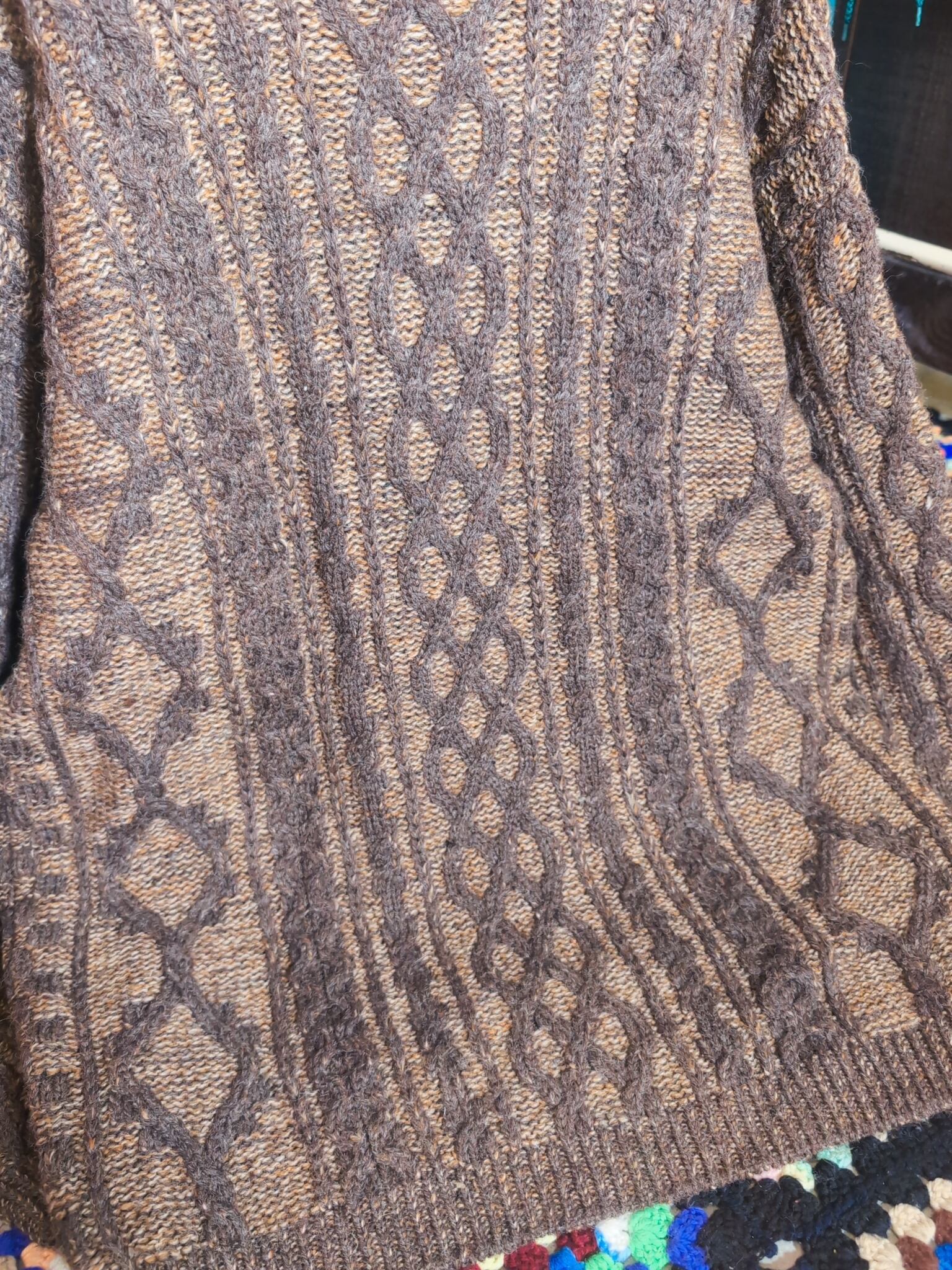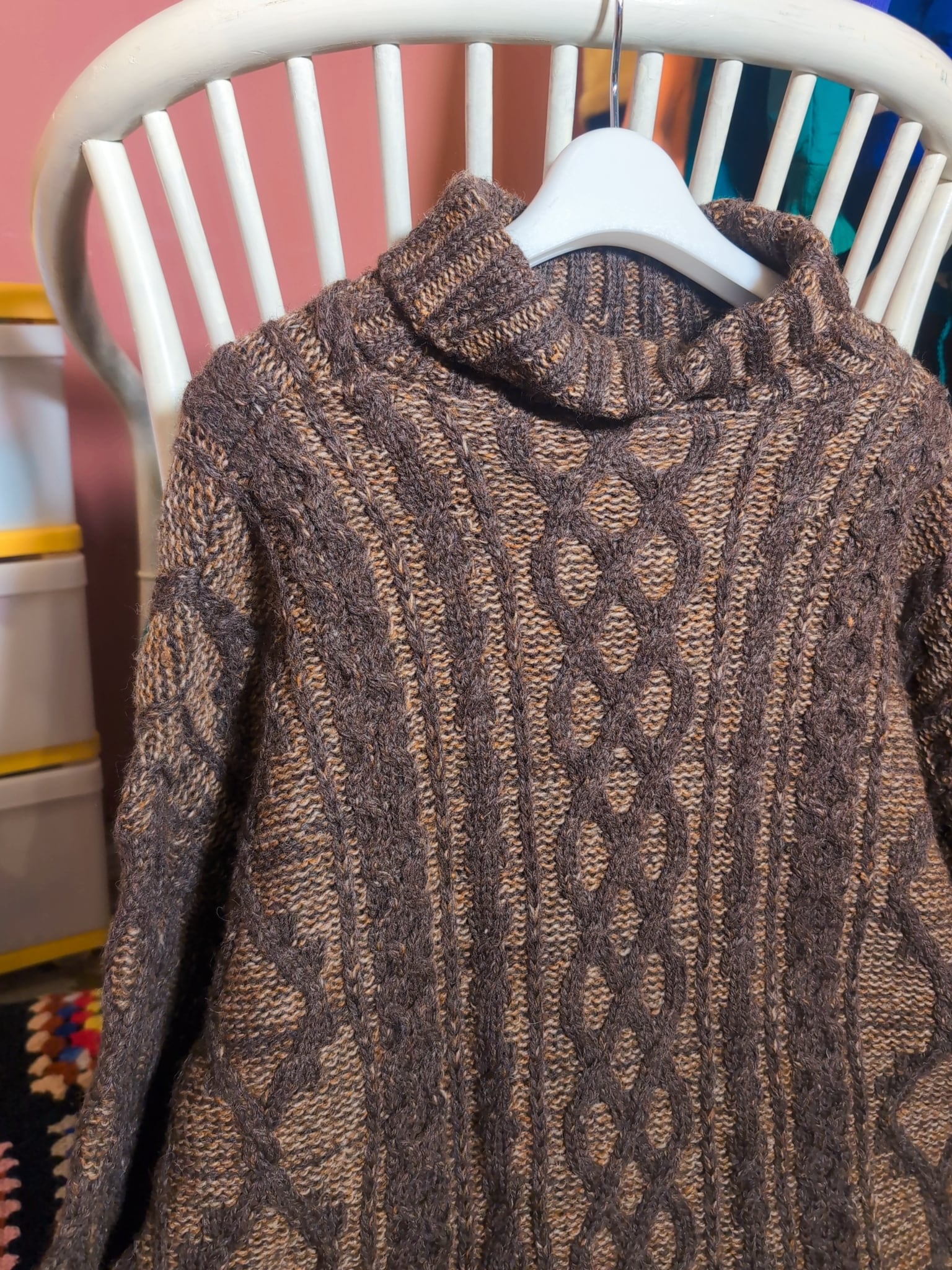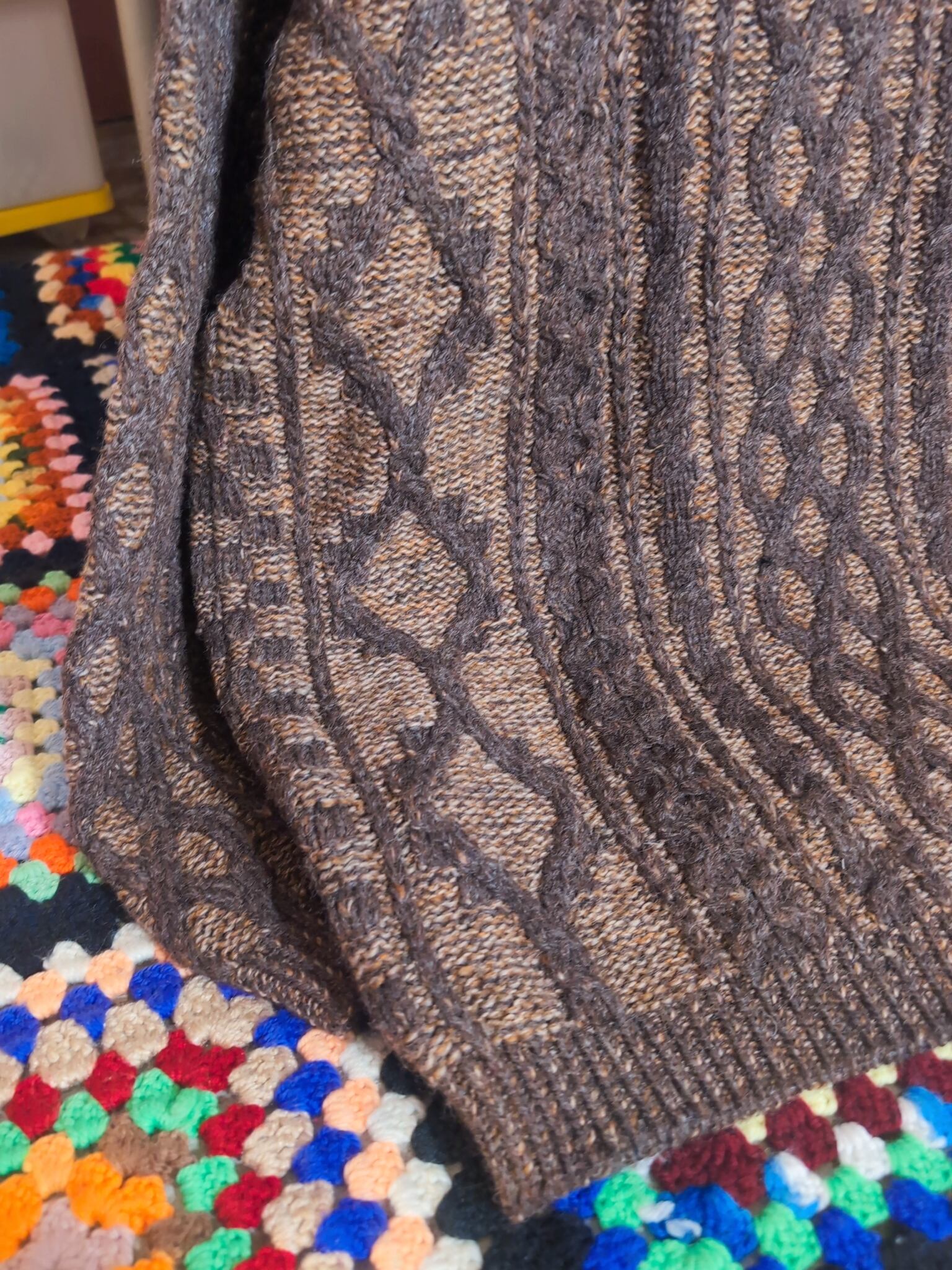 色味は、ブラウン。立体感のある編みと揺るっとしたサイズ感、高さのある襟元が魅力的。小柄な方であればワンピースのようにも着られます。