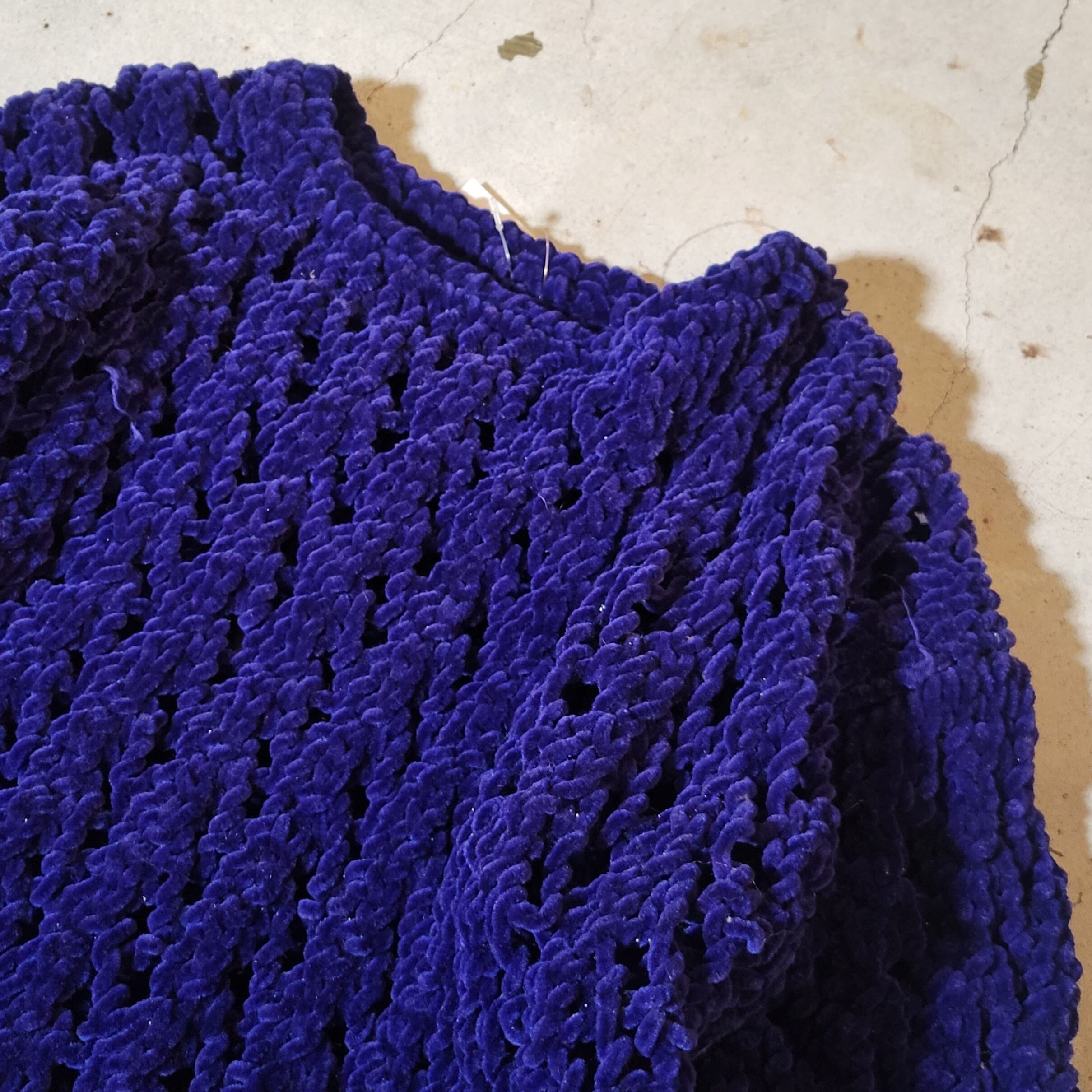 色味は、ブルー。ベロアのような素材の糸で作られたゆるっとした編み、鮮やかなカラーしっとりとした独特な雰囲気が魅力的。