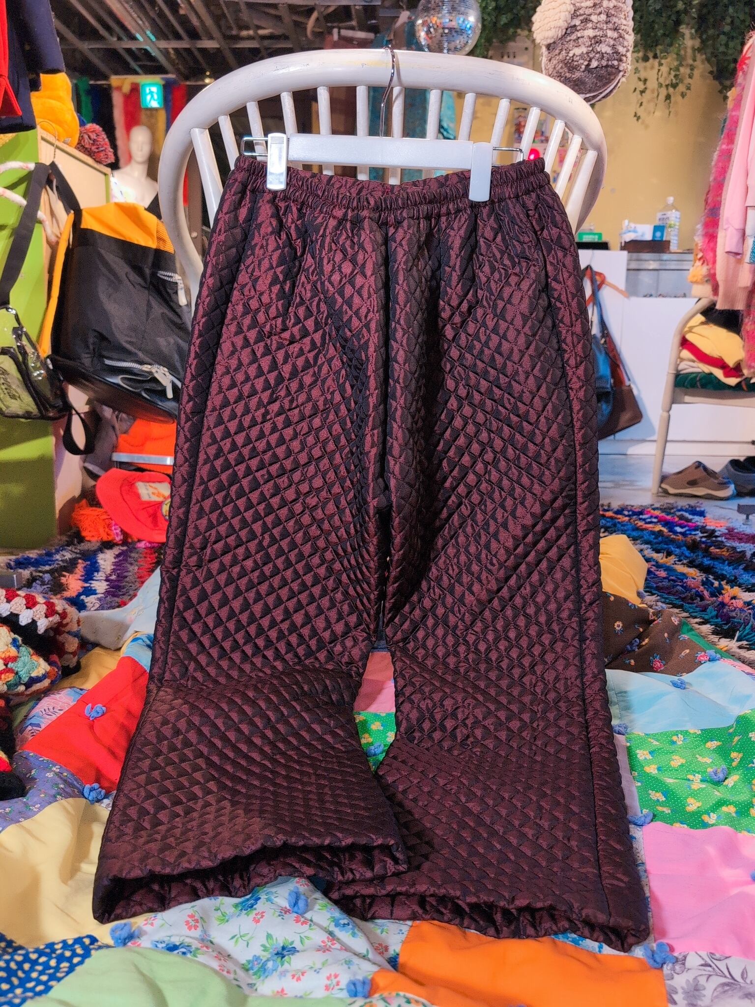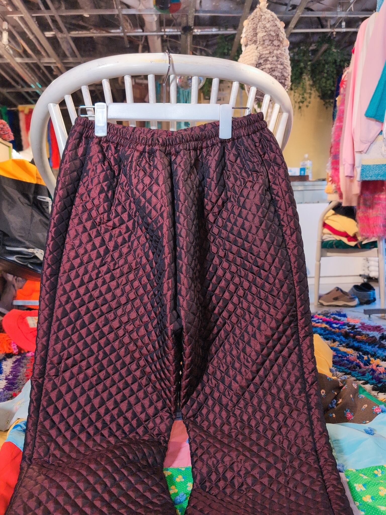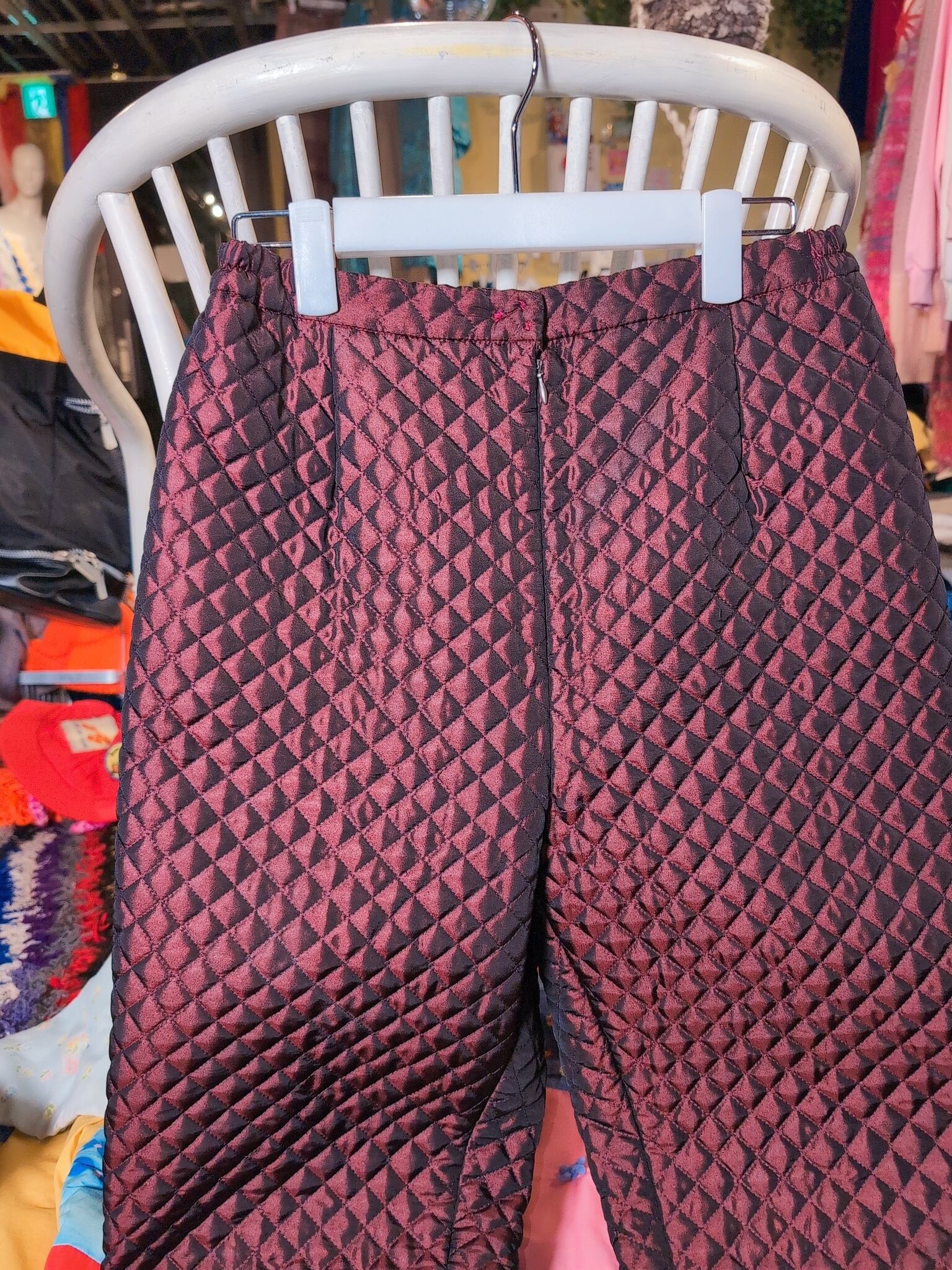 色味は、ボルドー。細やかな四角いキルティングは密でぷっくり。裾にリブなどのないすこしフレアなタイプが珍しいです。履くと腰周りはゆったり、股辺りからはスッキリとしたシルエットなのもぐぅ。