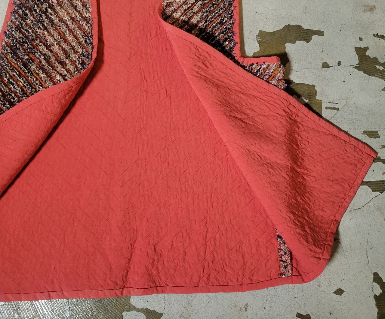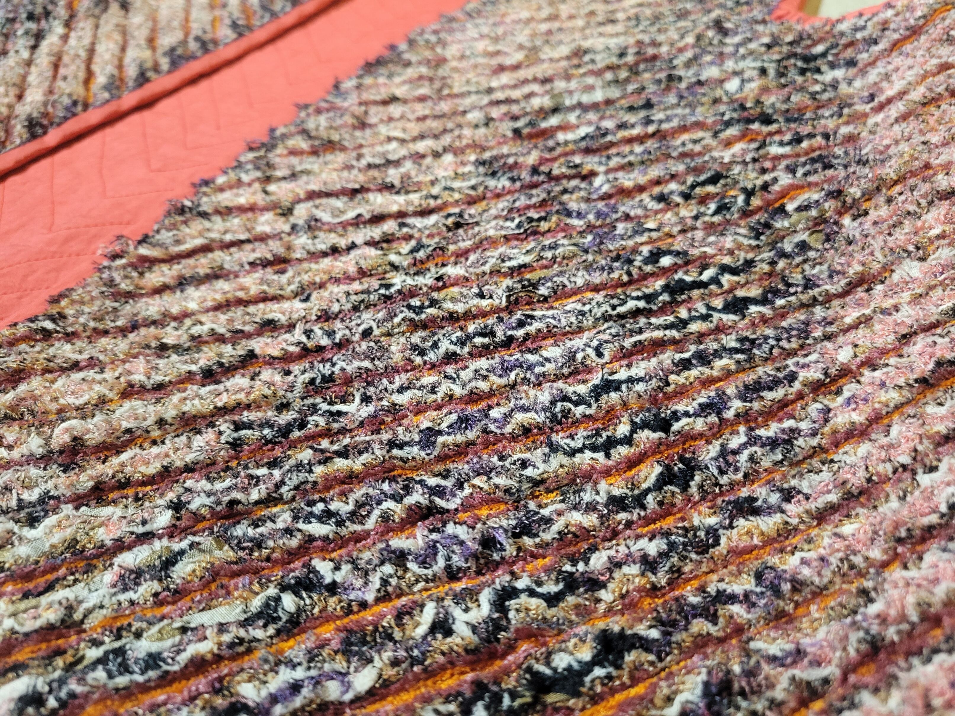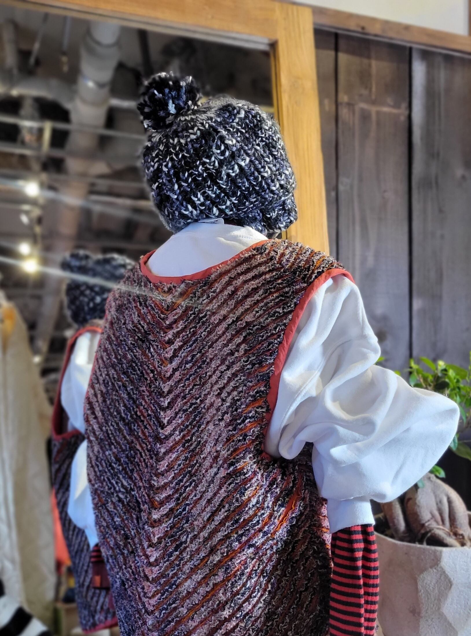 色味は、オレンジ × レッド などなど。落ち着きのあるレッドのベースに、ふさふさのテープがぎっしりと付けられたユニークなデザイン。パパッとプラスするだけでいつものコーディネートをアップデートしてくれます。様々なスタイリングのちょい足しに活躍する一着です。