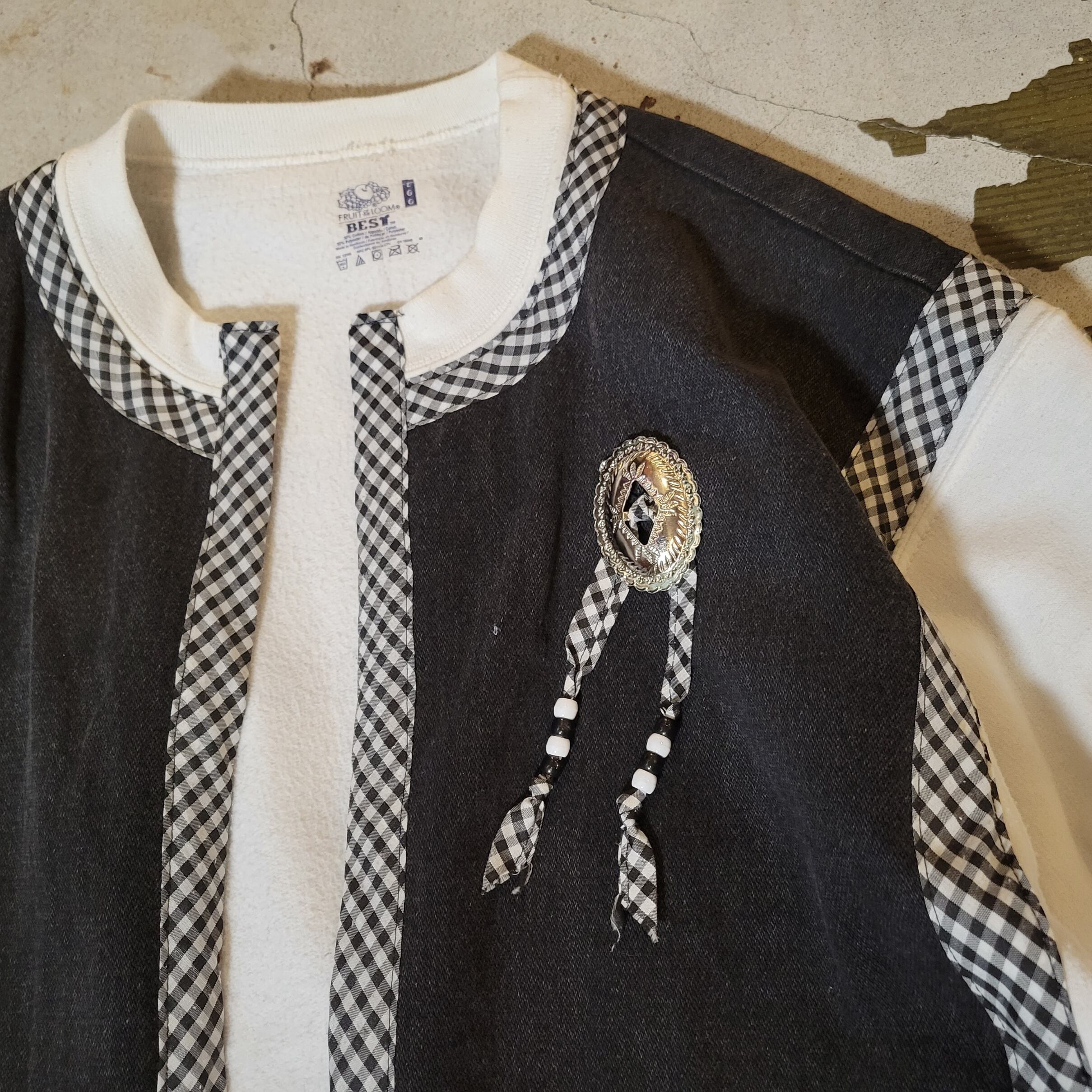 色味は、ホワイト × ブラック × シルバー。おそらく、以前の持ち主によるカスタマイズかと思われますが気合の入り具合とデザイン性の高さが秀逸な一着です。ゆったりサイズ、モノトーンなカラーリング。通年使えるスウェットというのもポイントです。